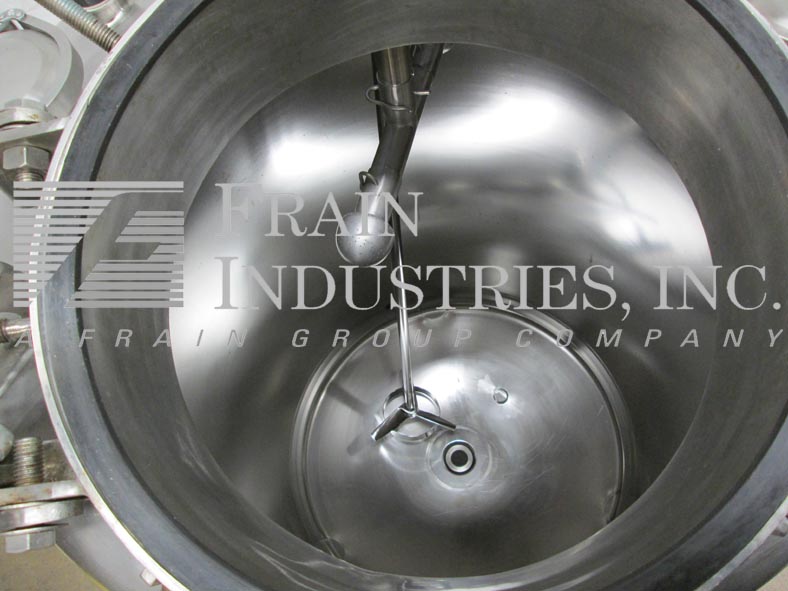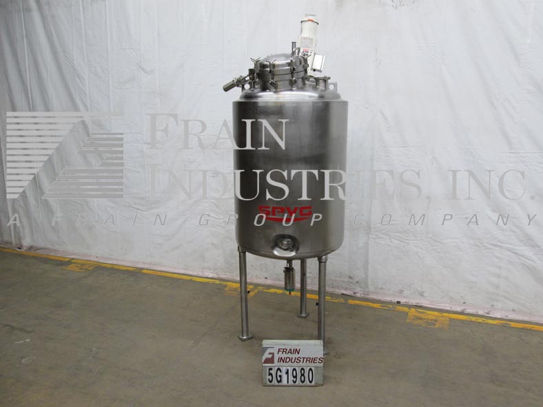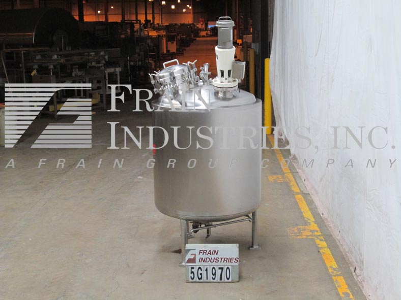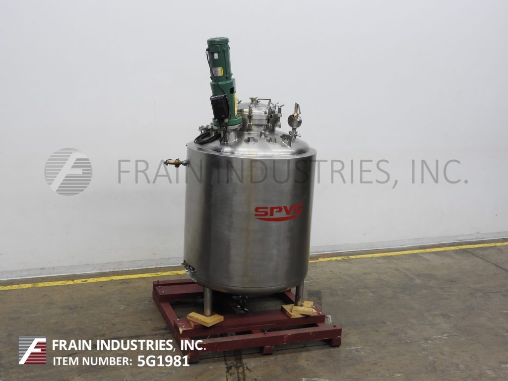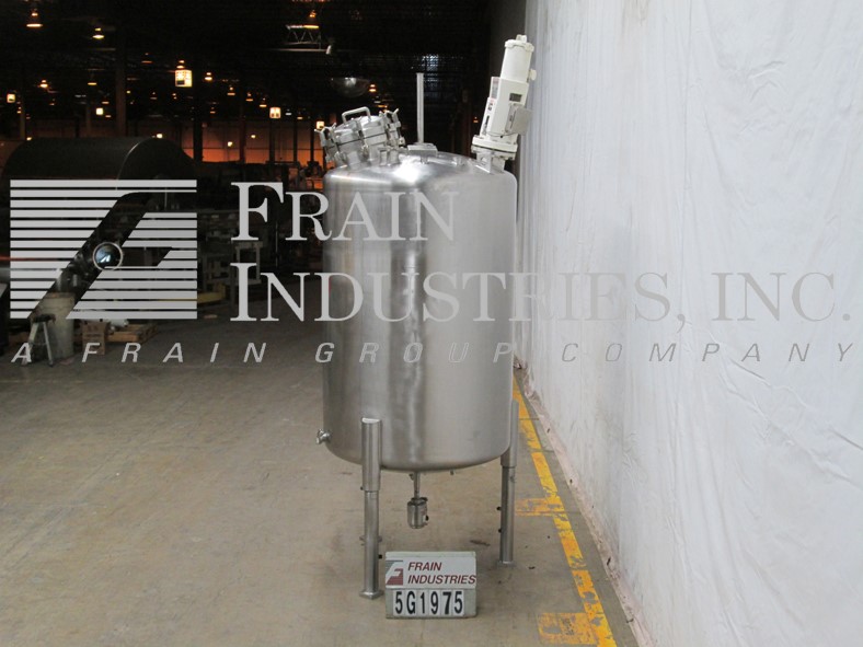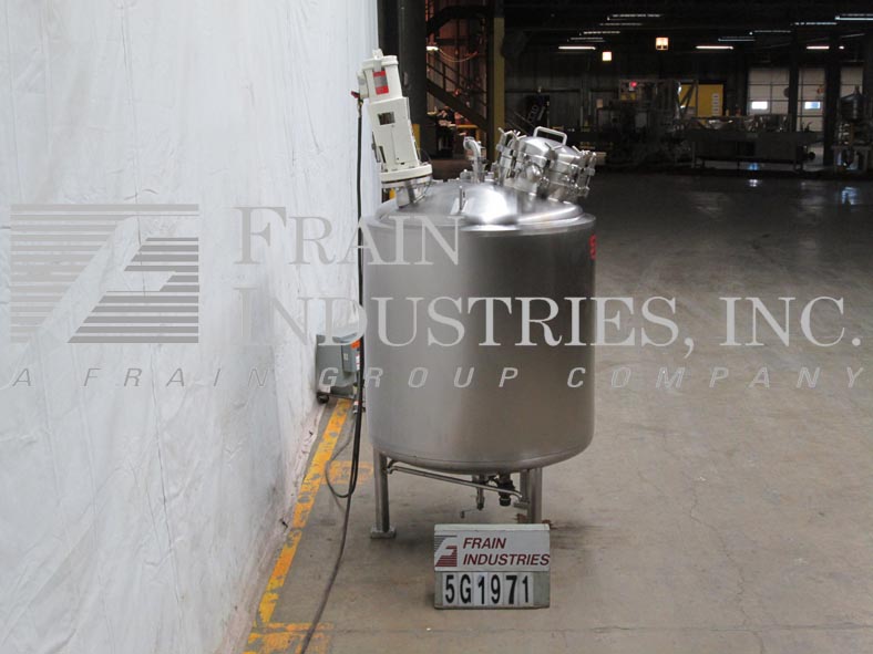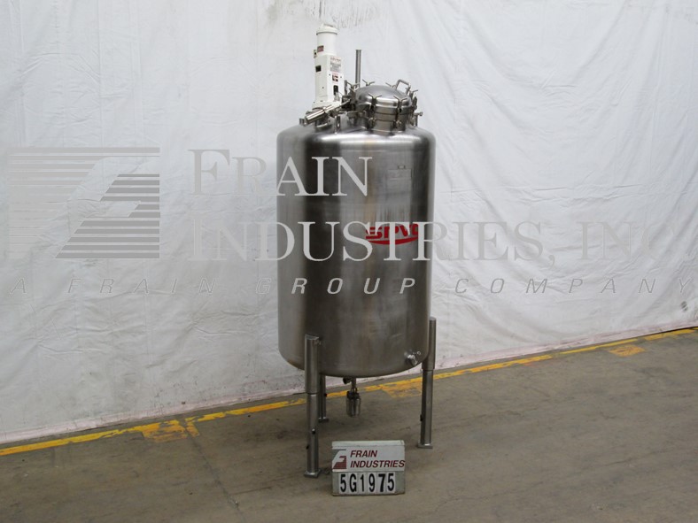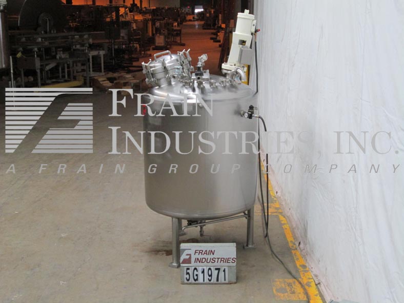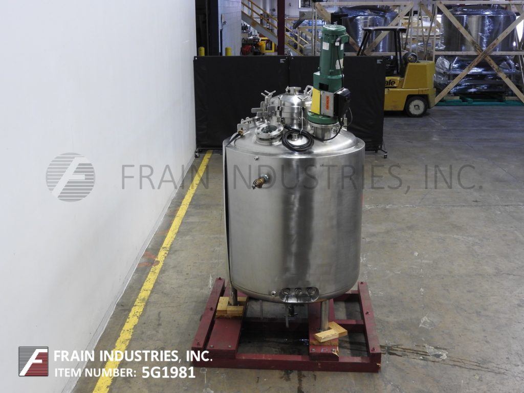 Northland不锈钢公司,1000升,250加仑,316不锈钢,单壁真空额定混合罐。容器尺寸:30"内径x 50"直壁。真空等级:50psi, 350°F, MDMT为-20°F, 50psi。配备圆顶顶部,16" ID螺栓下man方式,顶部法兰安装支柱式搅拌器,(3)2"外径,(1)1-1/2"外径,(2)5"外径卫生级顶部端口与CIP喷雾球,(1)2-1/2"外径卫生级侧面端口。碟形底部有2-1/2"外径卫生排放在7"外径,法兰与阀门在36"地板间隙。安装在(3)不锈钢支腿上。国家委员会830号