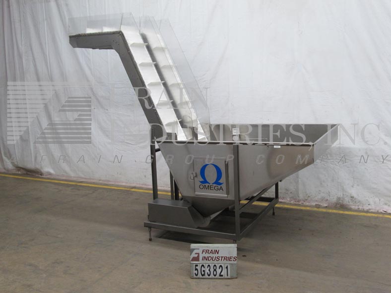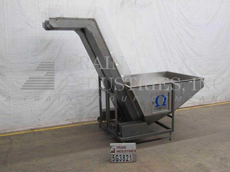 欧米茄设计,双车道,倾斜锯齿皮带给料机。配备(2)1/3马力单独驱动17¼"宽皮带,3"高夹板在12"中心和10"高侧面防护97"放电高度。65"长x 46"宽x 44"深不锈钢供应料斗(2)18" x 18"侧门。安装在软钢框架和底座上。