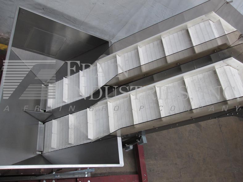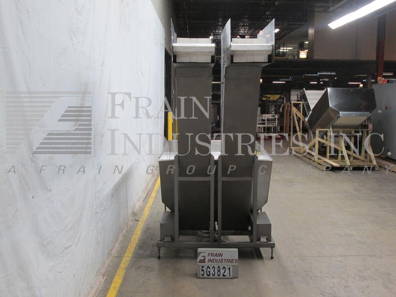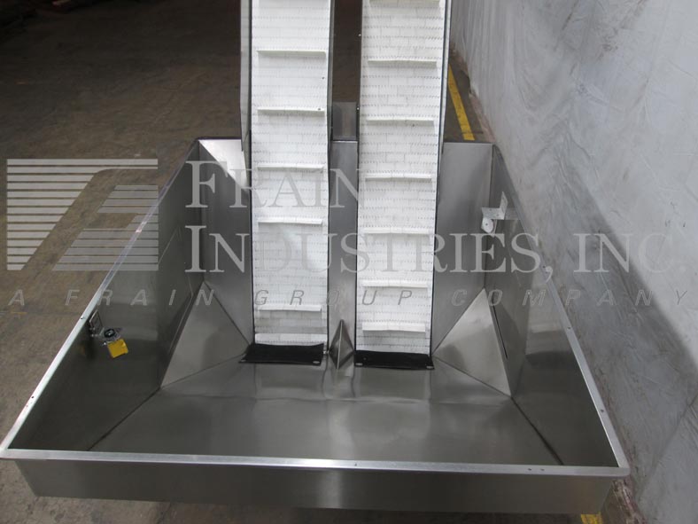 双倾斜楔形给料机,有一个65"宽x 82"长x 43"深的产品料斗,有两个侧检修门测量18"宽x 18"高。给料机有两个独立驱动的17.5"宽皮带14.5"宽3"高夹板在12"中心。排放10”。不锈钢接触部件。
