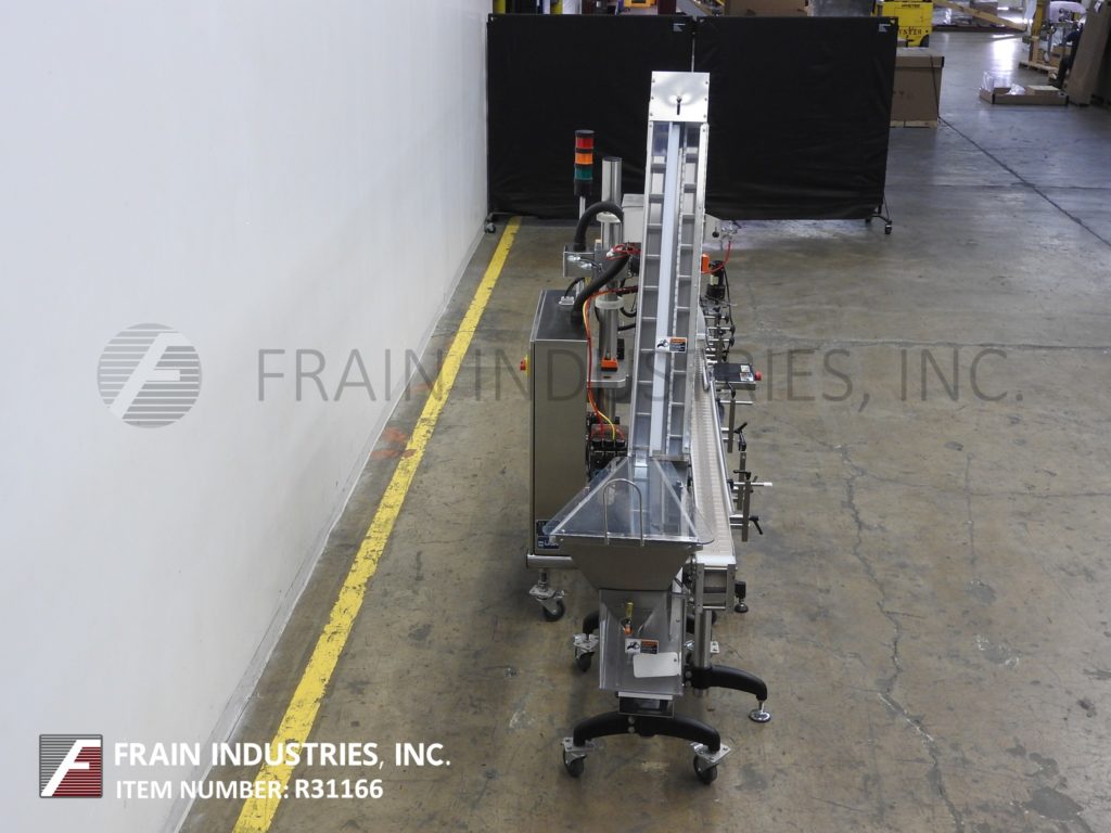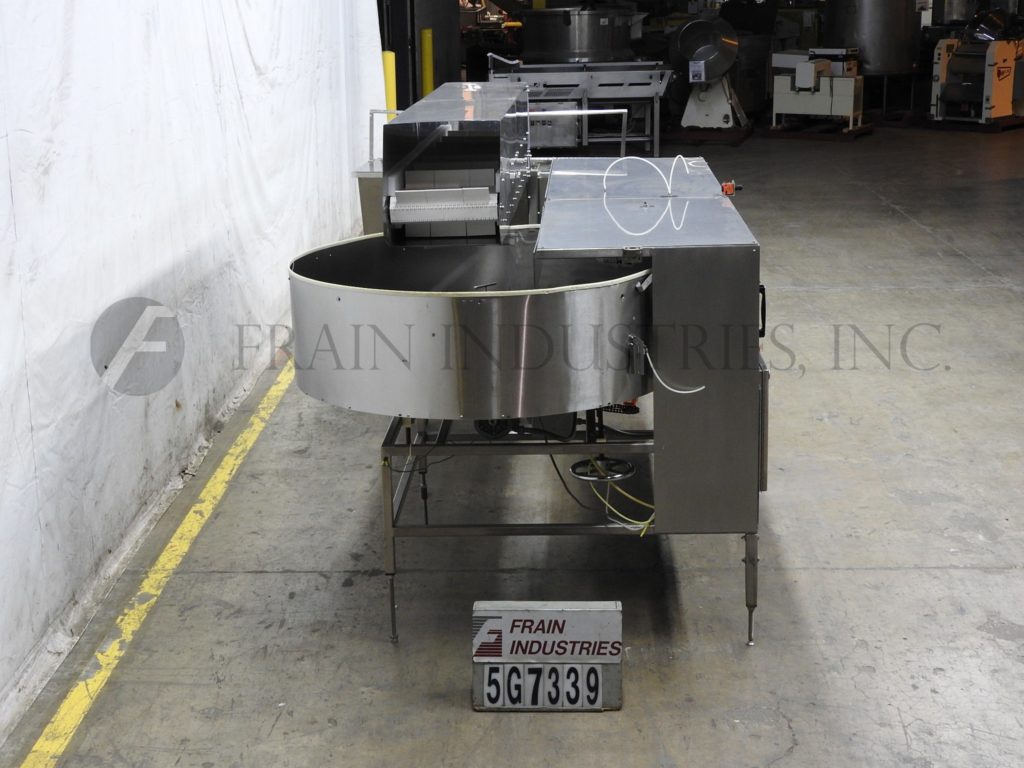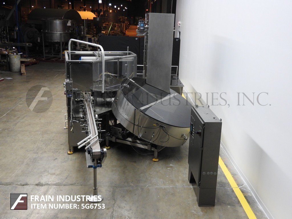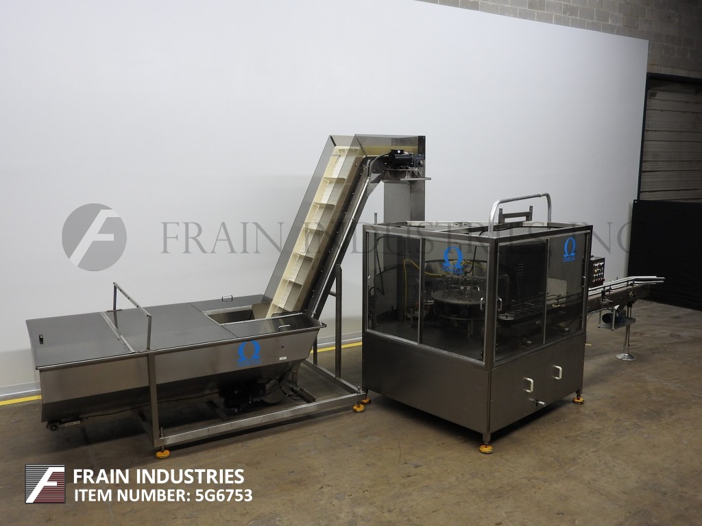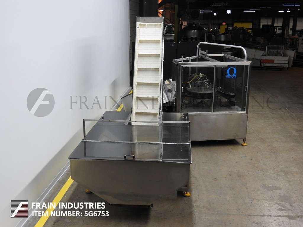 欧米茄型号6D-RVP-11,自动,地板水平,旋转,真空口袋,散装瓶整理器和定位器额定从50到250个容器每分钟-取决于材料和应用。容器尺寸范围:8盎司到1加仑,能够处理圆形,方形,椭圆形和f型容器,并具有适当的更换部件。配备95”长x 64“宽x 28“深住瓶底大部分进料斗,与108年“长x 20-1/2”宽斜坡高花纹带式给料机4“高12日楔子”中心,和100年“排放高度,72“低水平排序盘直径,瓶子水平传感器28“OD转盘与10-head真空瓶挑站,该定位容器直立到144"长x 4-1/2"宽的产品排出输送机36"长x 2"宽的集装箱侧带稳定。遥控面板有A/B控制器,带有触摸板控制器,具有读出和电梯、料斗、输送机、侧带和预定位器计数器,车载控制面板具有预定位器前进、收缩、中心、过载上/下和启动、停止、复位、e-stop按钮控制,具有升瓶手动、自动、自动、关闭开关按钮控制,集成真空泵和联锁安全保护。安装在底座上,支架高度可调。