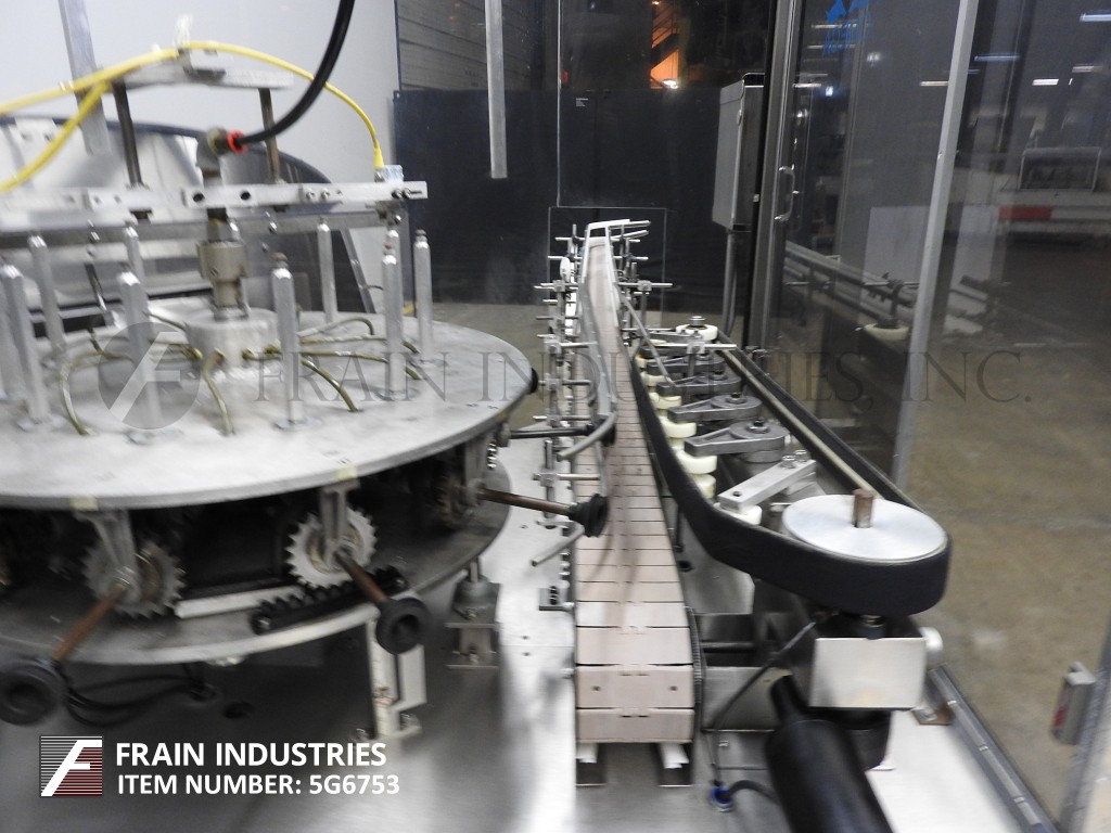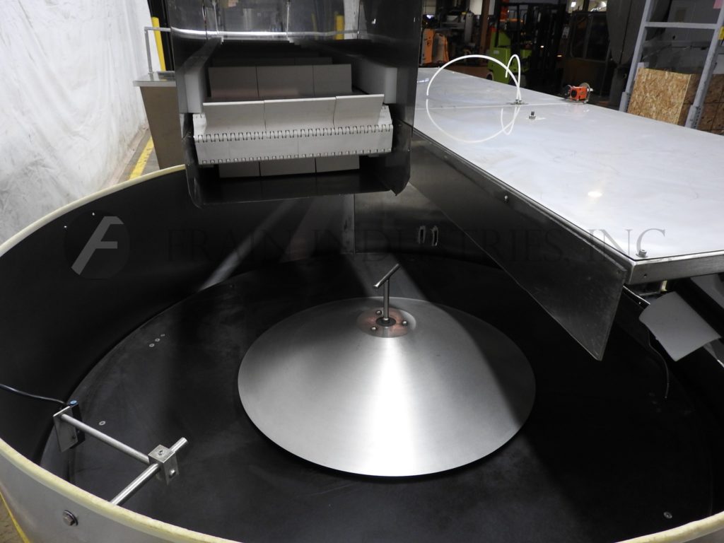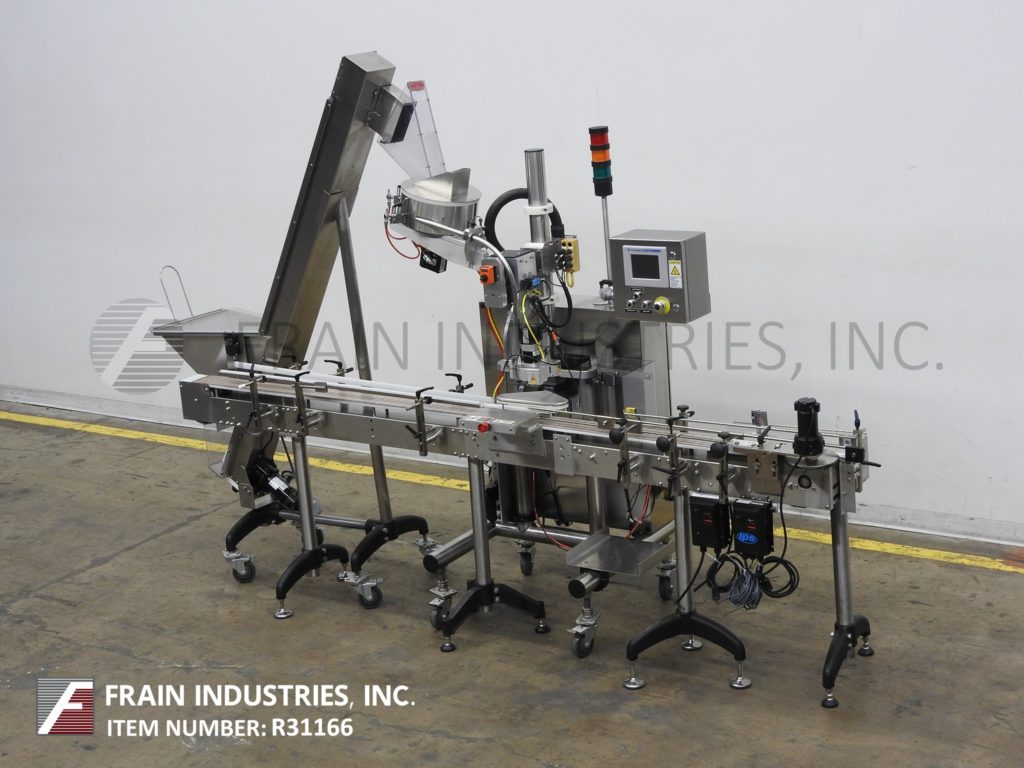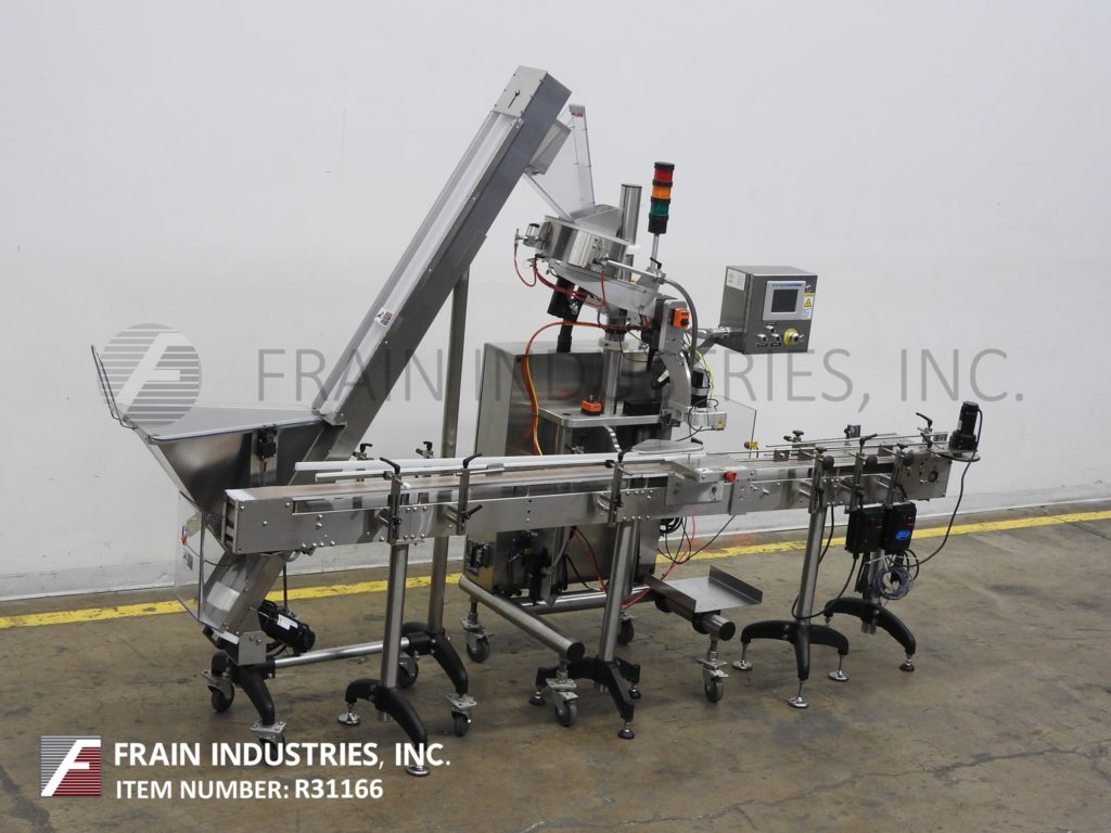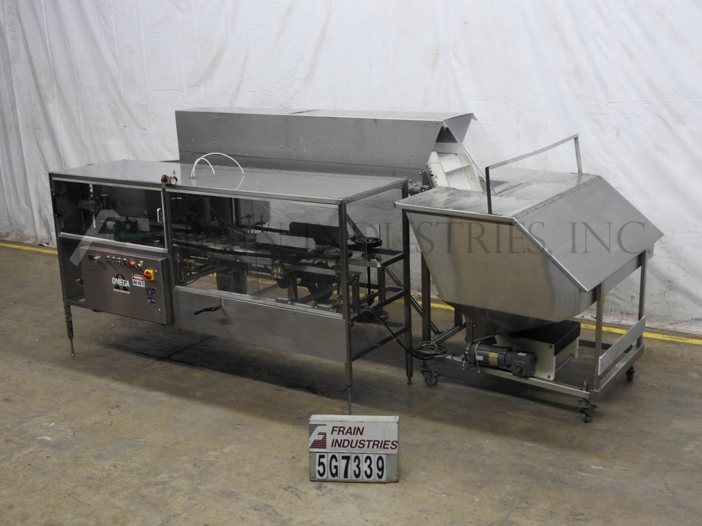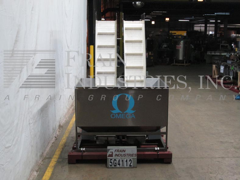 欧米茄型号6D-RVP-11,自动,地板水平,旋转,真空口袋,散装瓶整理器和定位器额定从50到250个容器每分钟-取决于材料和应用。容器尺寸范围:8盎司到1加仑,能够处理圆形,方形,椭圆形和f型容器,并具有适当的更换部件。配备95”长x 64“宽x 28“深住瓶底大部分进料斗,与108年“长x 20-1/2”宽斜坡高花纹带式给料机4“高12日楔子”中心,和100年“排放高度,72“低水平排序盘直径,瓶子水平传感器28“OD转盘与10-head真空瓶挑站,该定位容器直立到144"长x 4-1/2"宽的产品排出输送机36"长x 2"宽的集装箱侧带稳定。遥控面板有A/B控制器,带有触摸板控制器,具有读出和电梯、料斗、输送机、侧带和预定位器计数器,车载控制面板具有预定位器前进、收缩、中心、过载上/下和启动、停止、复位、e-stop按钮控制,具有升瓶手动、自动、自动、关闭开关按钮控制,集成真空泵和联锁安全保护。安装在底座上,支架高度可调。