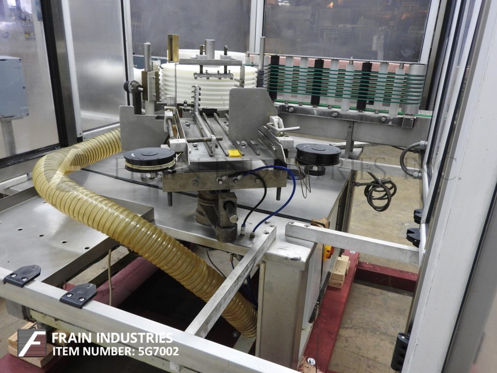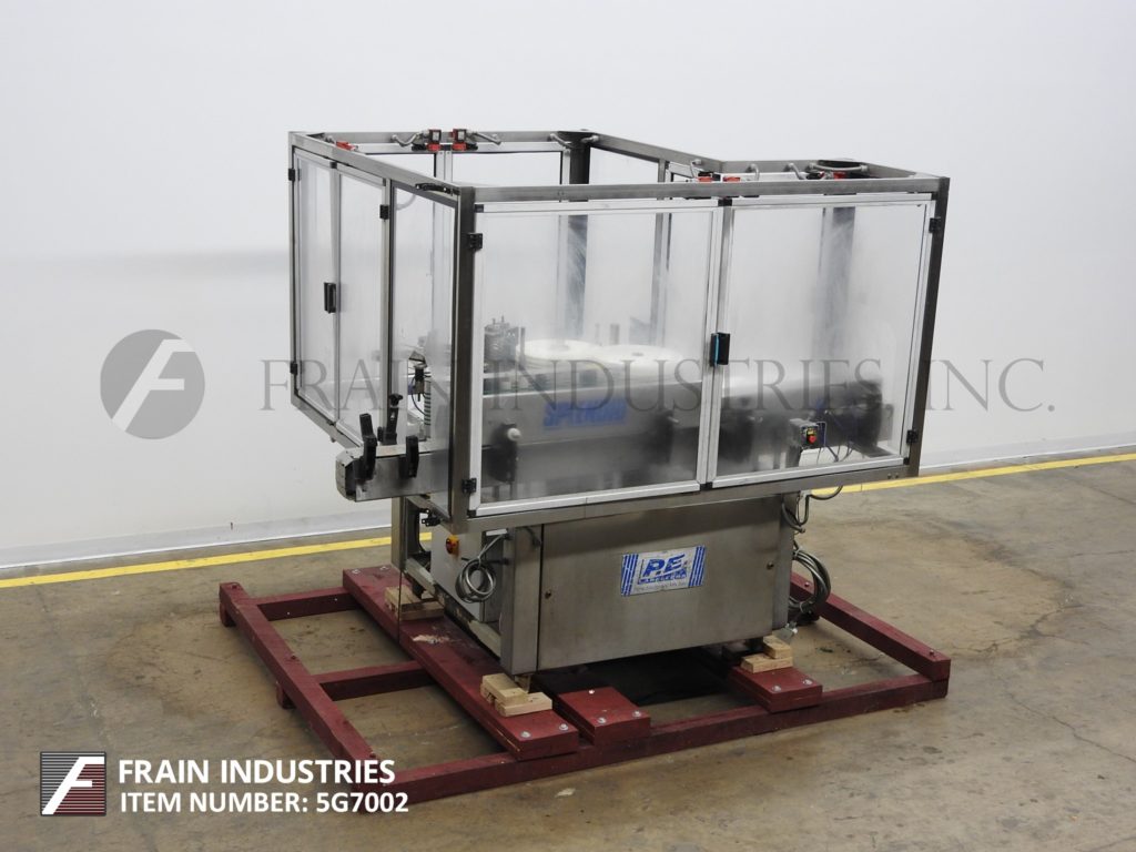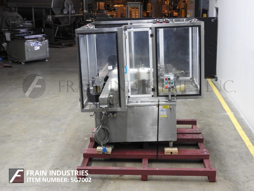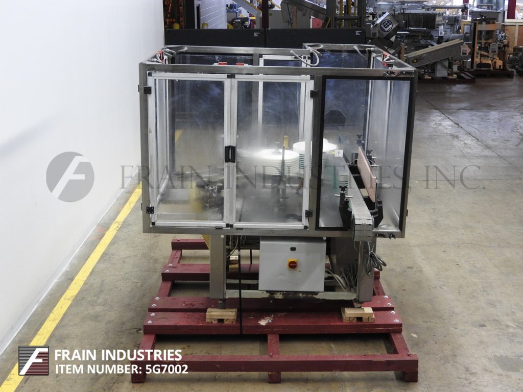P E, SPLENDID L7A型,全自动内嵌不锈钢冷胶,局部或全包贴标机。额定从10到200个容器每分钟-取决于材料和应用。圆形容器尺寸范围:直径最大可达7英寸。标签尺寸范围:3½“至16”长度;身高3到5英寸。配备了106“长× 5”宽的集装箱输送机,蜗杆螺旋进给,预切板料标签杂志,5“高水平条纹冷胶轮涂胶系统和40“长× 7”高包站。控制面板,具有启动、停止按钮控制和联锁安全防护。安装在(4)腿不锈钢底座框架,高度可调腿。更换零件以适应不同尺寸范围。
