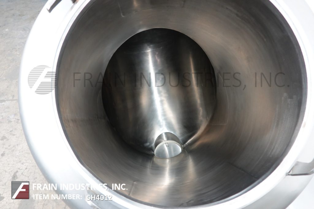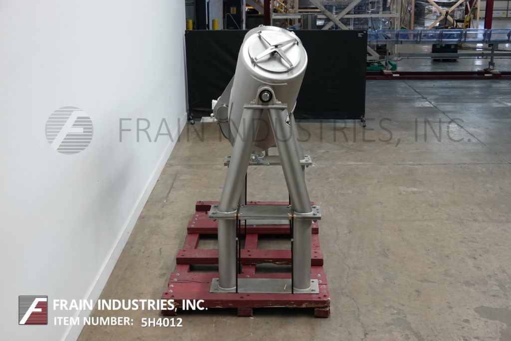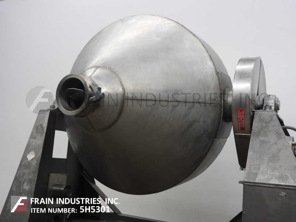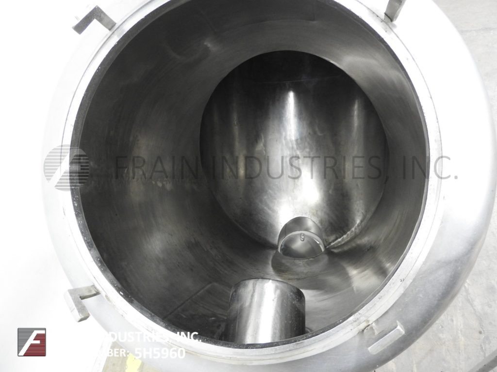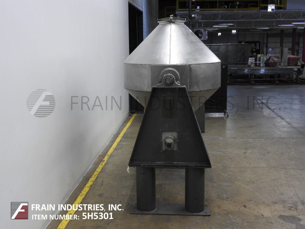 帕特森凯利,10英尺³,316不锈钢,双壳粉末搅拌机,每小时产品磅数-取决于材料,应用和机器配置。容重等级:90磅/立方英尺。配备(2)20" ID产品端口与螺栓下盖,40"长侧v墙和17"长内v墙25"直径腔室。8英寸ID蝶阀排放,41英寸地板间隙。安装在不锈钢“A”框架上,32“摆动半径/ 64”摆动直径,需要105“天花板间隙。