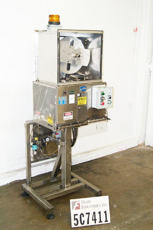 PDC型号55M,不锈钢,颈带/套管,额定每分钟50到120个容器-取决于材料和应用。带/套管尺寸范围:直径3/8"至3",高度5/8 "至2",最大平铺4.8",最小取决于应用。配备机械进给,垂直穿孔轮,静电消除器和低材料传感器与状态灯信标。专为篡改明显的带和收缩套筒贴标应用。安装在“H”型底座框架调平腿上。