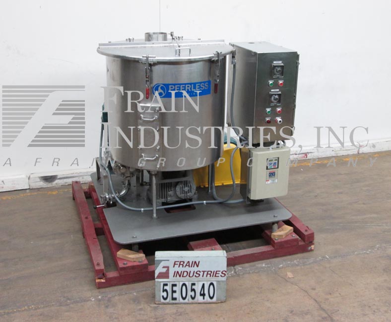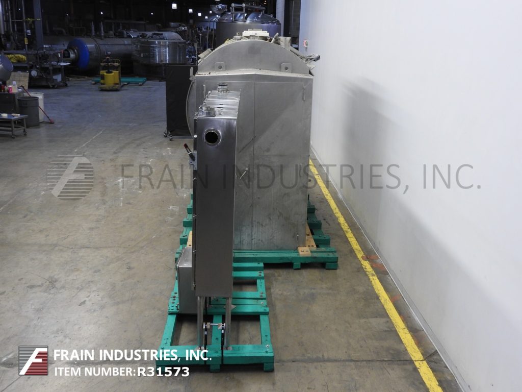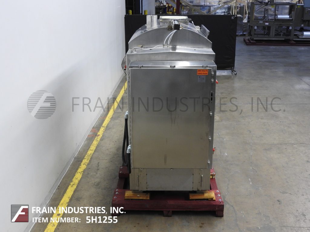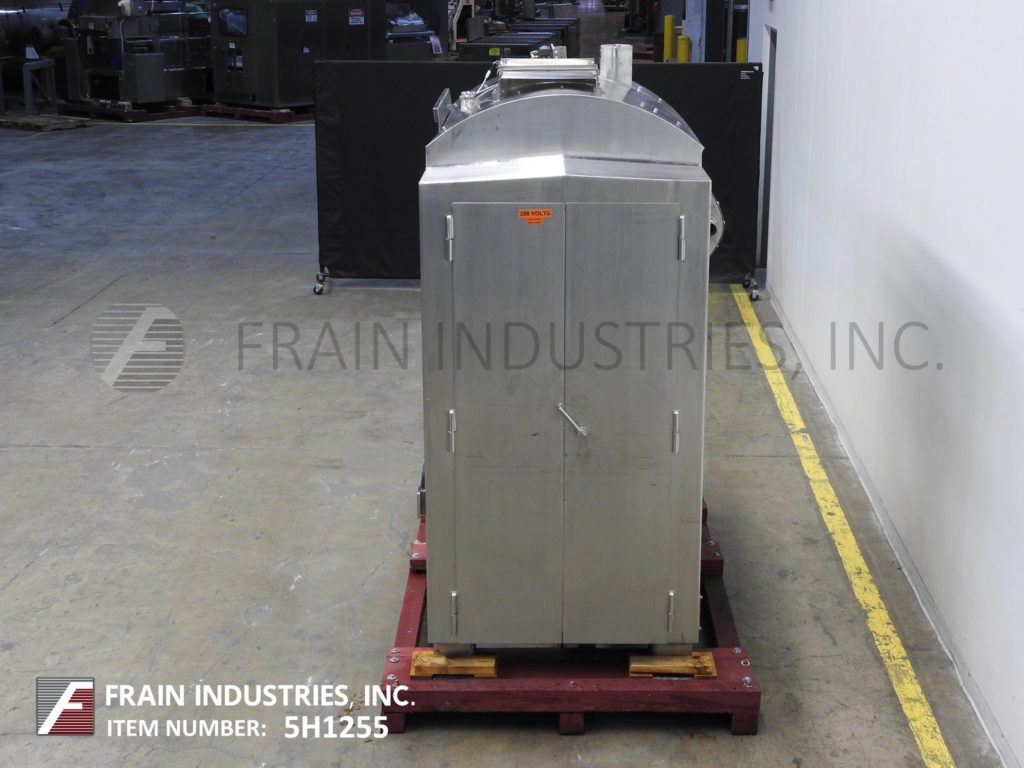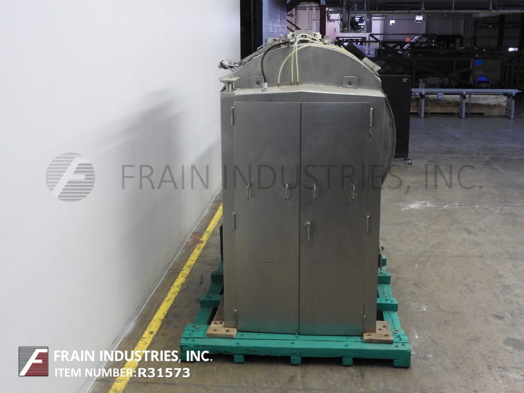 无双,SS123COS型,不锈钢,旋转圆盘涂层系统。额定高达45英尺每分钟与产品数量-取决于材料,应用和机器配置。配备了(3)8”外径的旋转圆盘(2)以上(1)以下,36”长× 8½”宽鹰带饲料输送机,12”内径× 9”深不锈钢溶液过滤系统,带有过滤器和可拆卸盖(防止固体到达饲料泵,可能堵塞和影响产品覆盖)。Waukesha,型号18,用于测量旋臂的容积泵。控制面板与按钮启动/停止,VFD泵和输送机与FPM / GPM数字读出。安装在不锈钢底座框架与脚轮和调平腿。