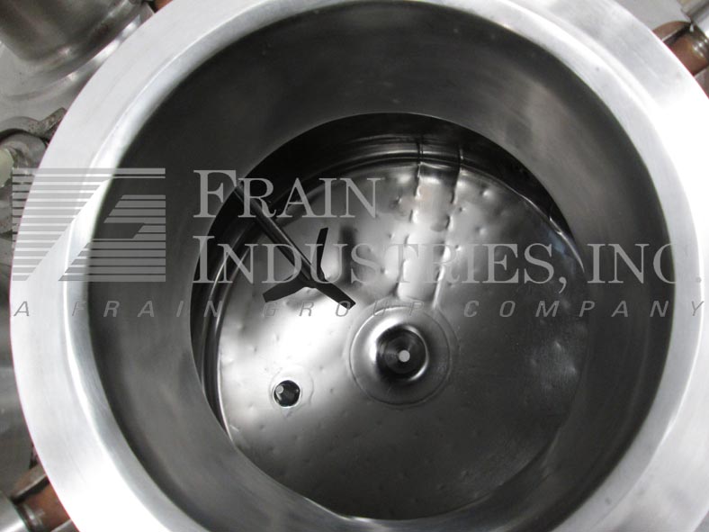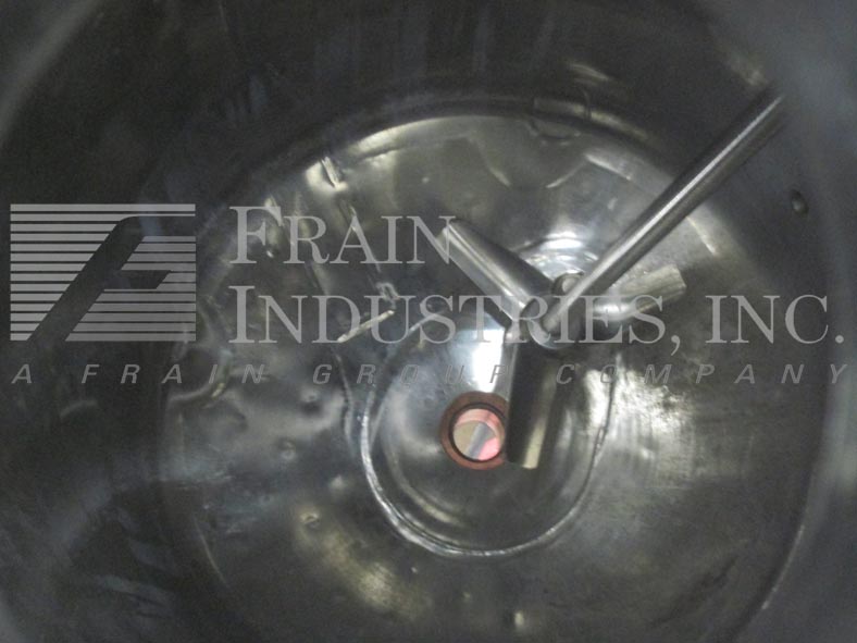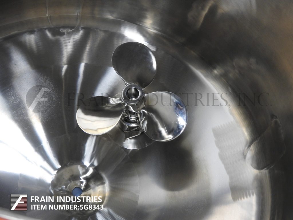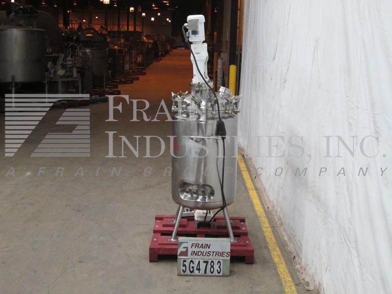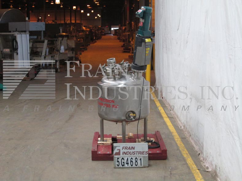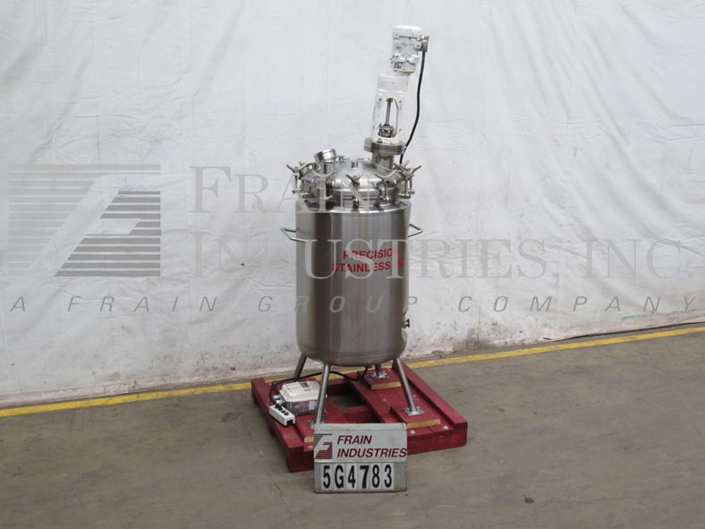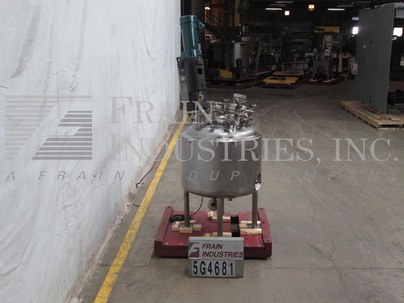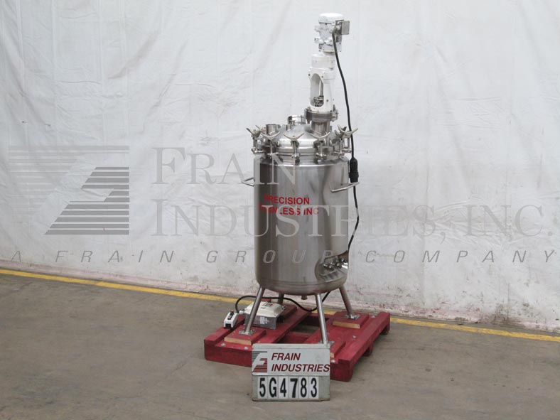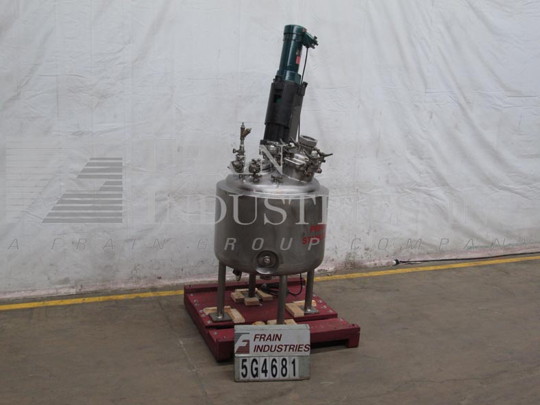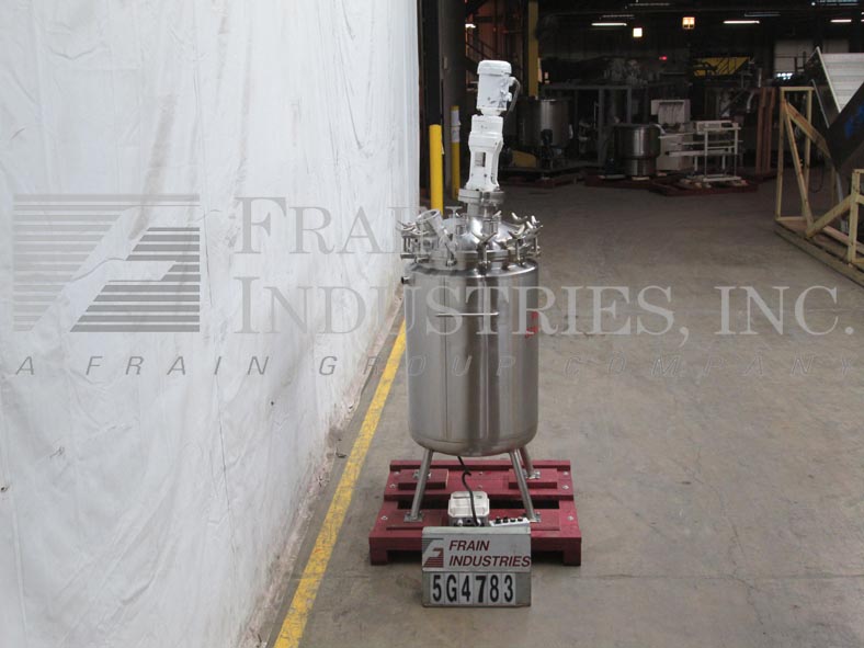 精密不锈钢股份有限公司,66加仑,316L不锈钢搅拌反应容器。400°F时,容器最大额定压力为50PSI,导管架最大额定压力为100PSI。圆顶顶部/碟底与29"I.D.x22“高直墙。配备9英寸直径的人孔,螺栓紧固盖。(1) 4英寸的视镜盖(1)圆顶中心的4英寸视镜。Lightnin Vektor混合器5“管道法兰入口。(1) Fike 1-1/2”破裂阀瓣275psi @ 70°F,(6) 1-1/2”三卡箍进口端口。(1)侧底出口1/2"全流道不锈钢球阀。(1) 1" FNPT顶部侧和(1)1" FNPT底部夹套进口/出口端口。 Center bottom radial diaphragm outlet valve, bottom mounted Ashcroft 6" face dial thermometer -20 to 120°C. Mounted on 2-1/2"dia x 18"H s/s tubular legs with 6" x 6" plates.