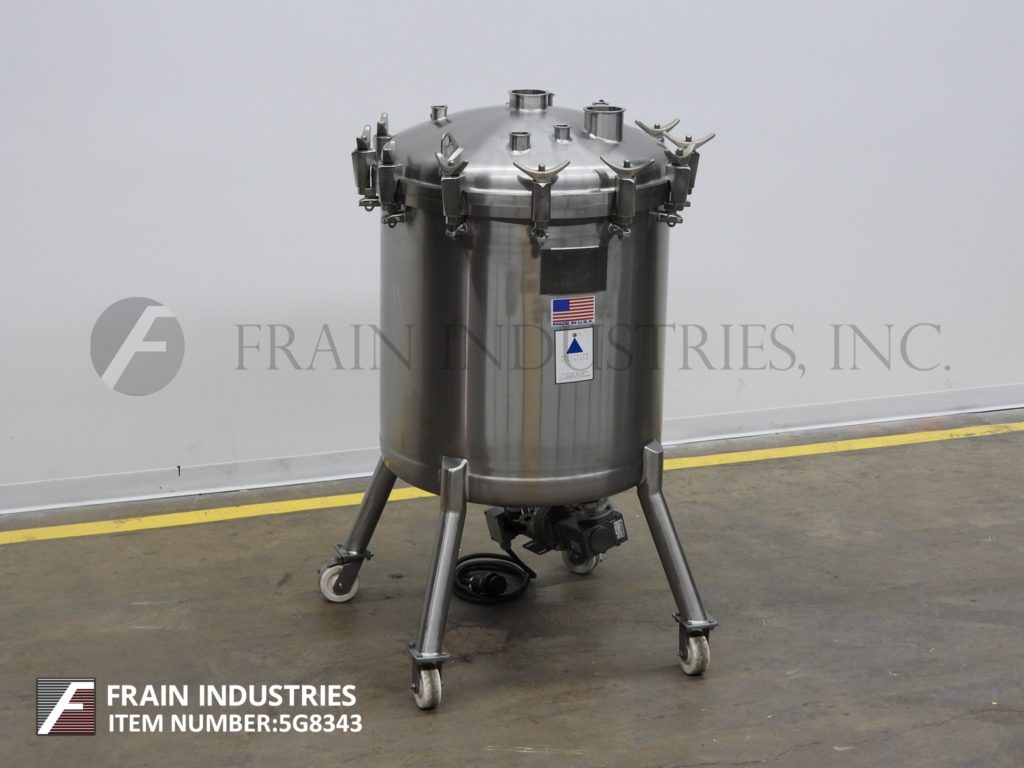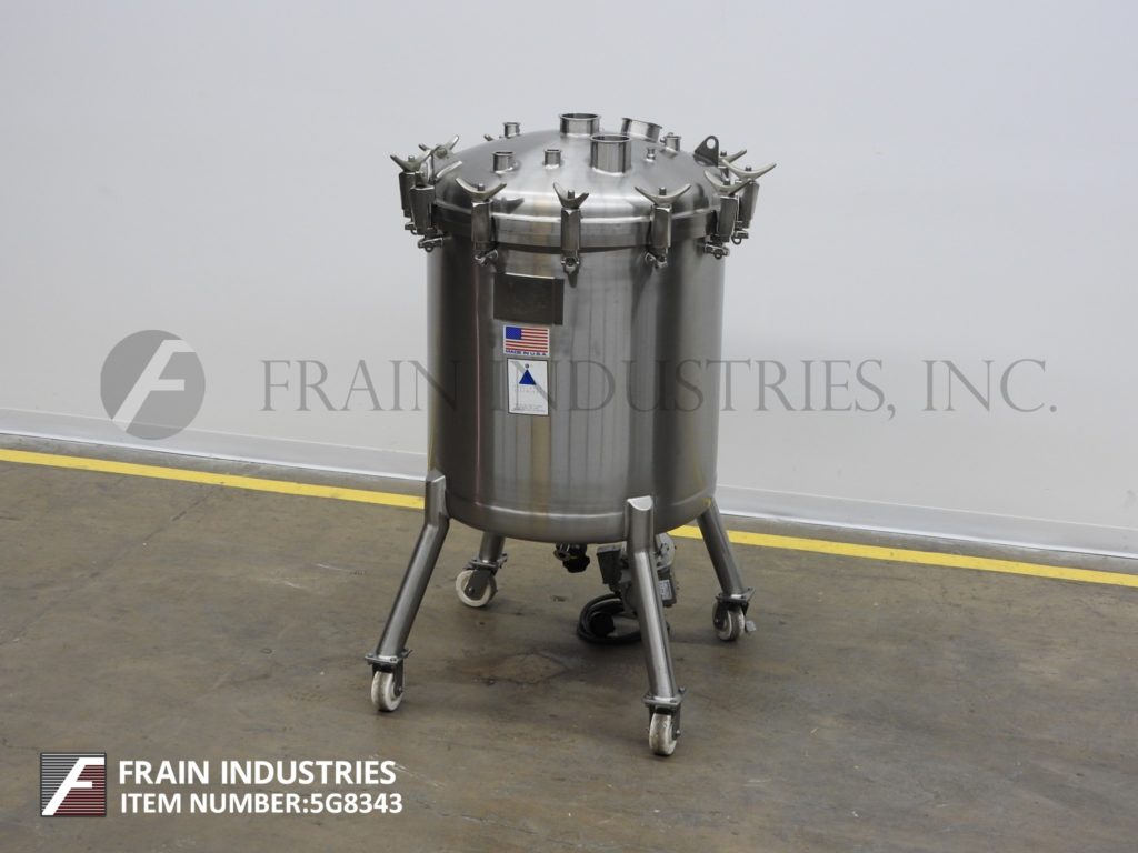 精密不锈钢,200升容量,316L不锈钢真空工艺罐。容器尺寸:25"直径x 30"直壁。配有螺栓下圆顶,碟底,底部磁性支柱搅拌和底部中心2"外径/ 1" ID三夹式放电与14"地间隙。安装在(4)带锁定脚轮的管状腿上。