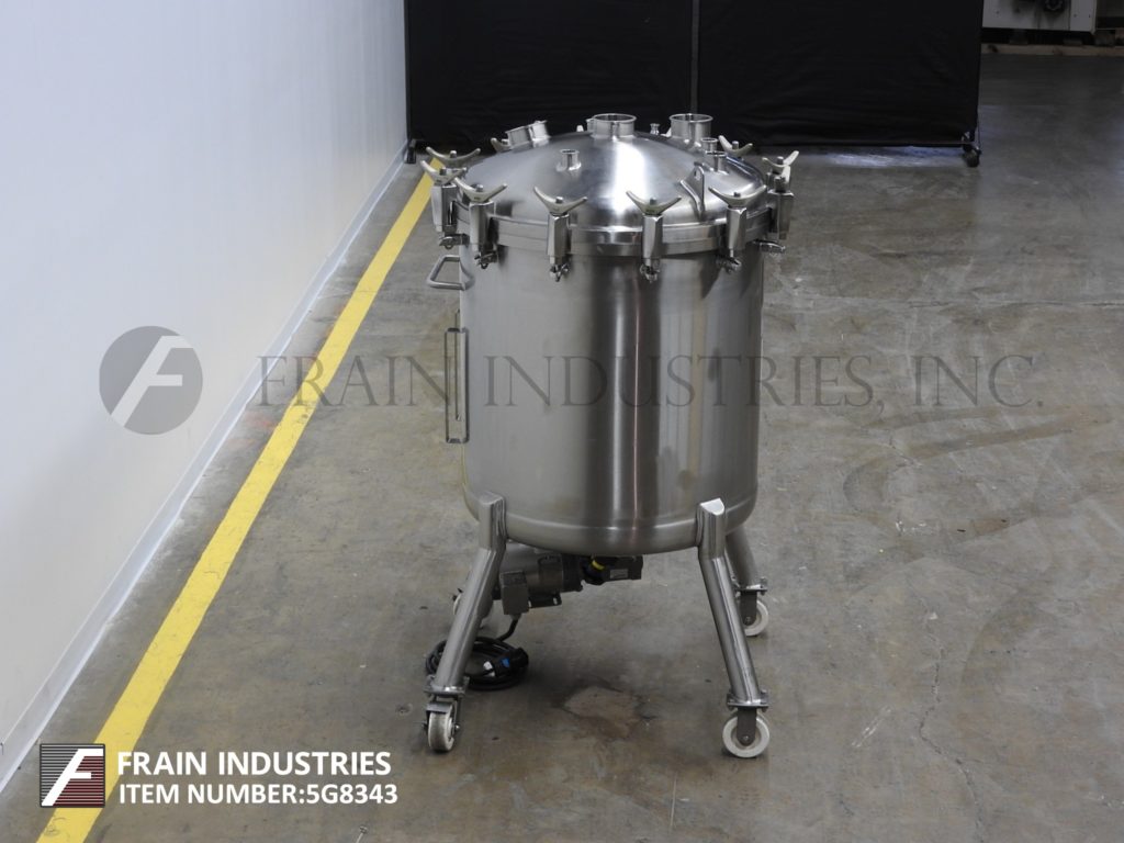 精密不锈钢,350升容量,316L不锈钢真空工艺罐。容器尺寸:32"直径x 32"直壁。配有螺栓下圆顶顶部,碟形底部,底部磁性支柱搅拌由3 / 4马力驱动和底部中心2"外径/ 1" ID三夹式放电,地面间隙为15"。安装在(4)带锁定脚轮的管状腿上。