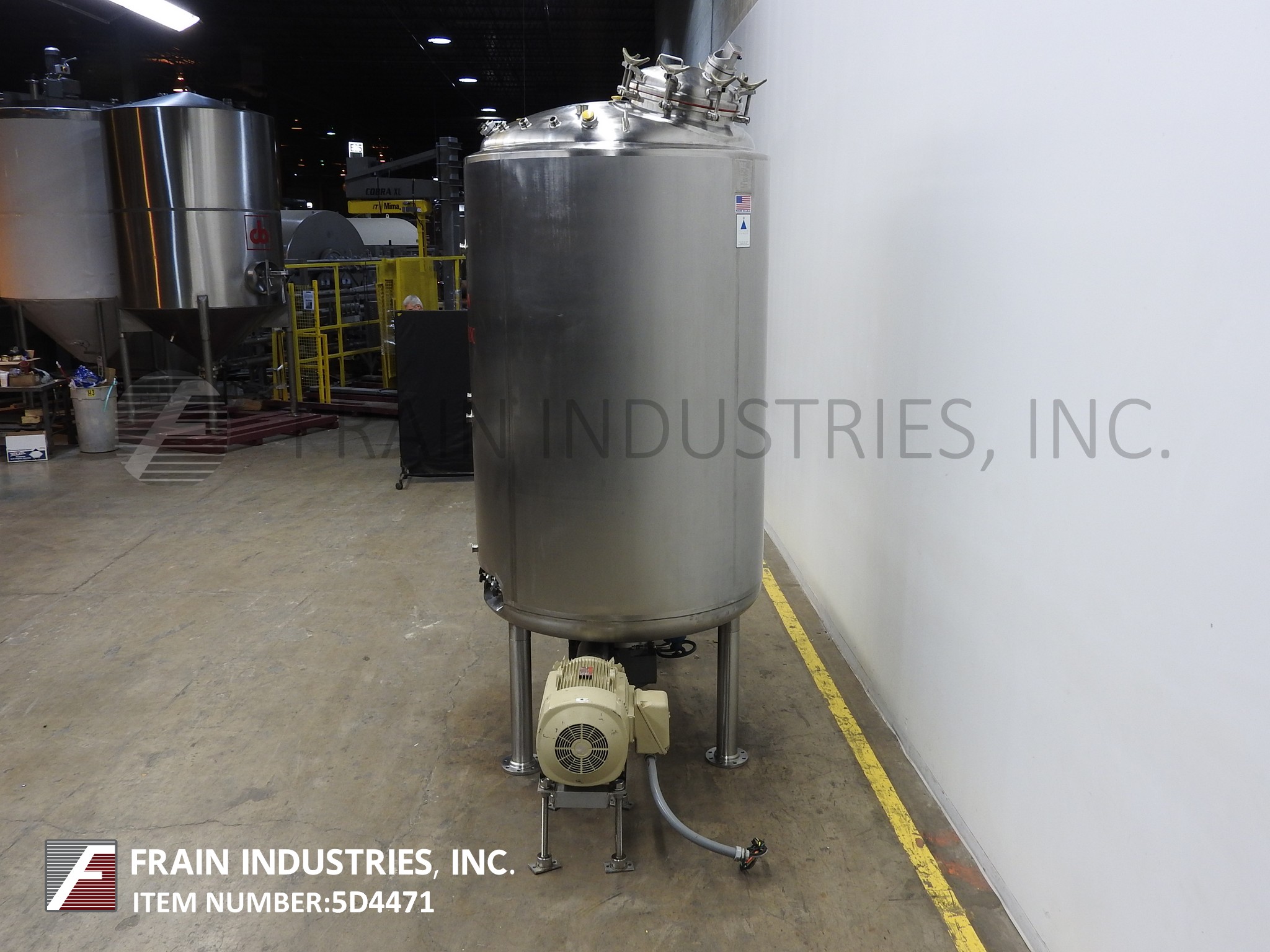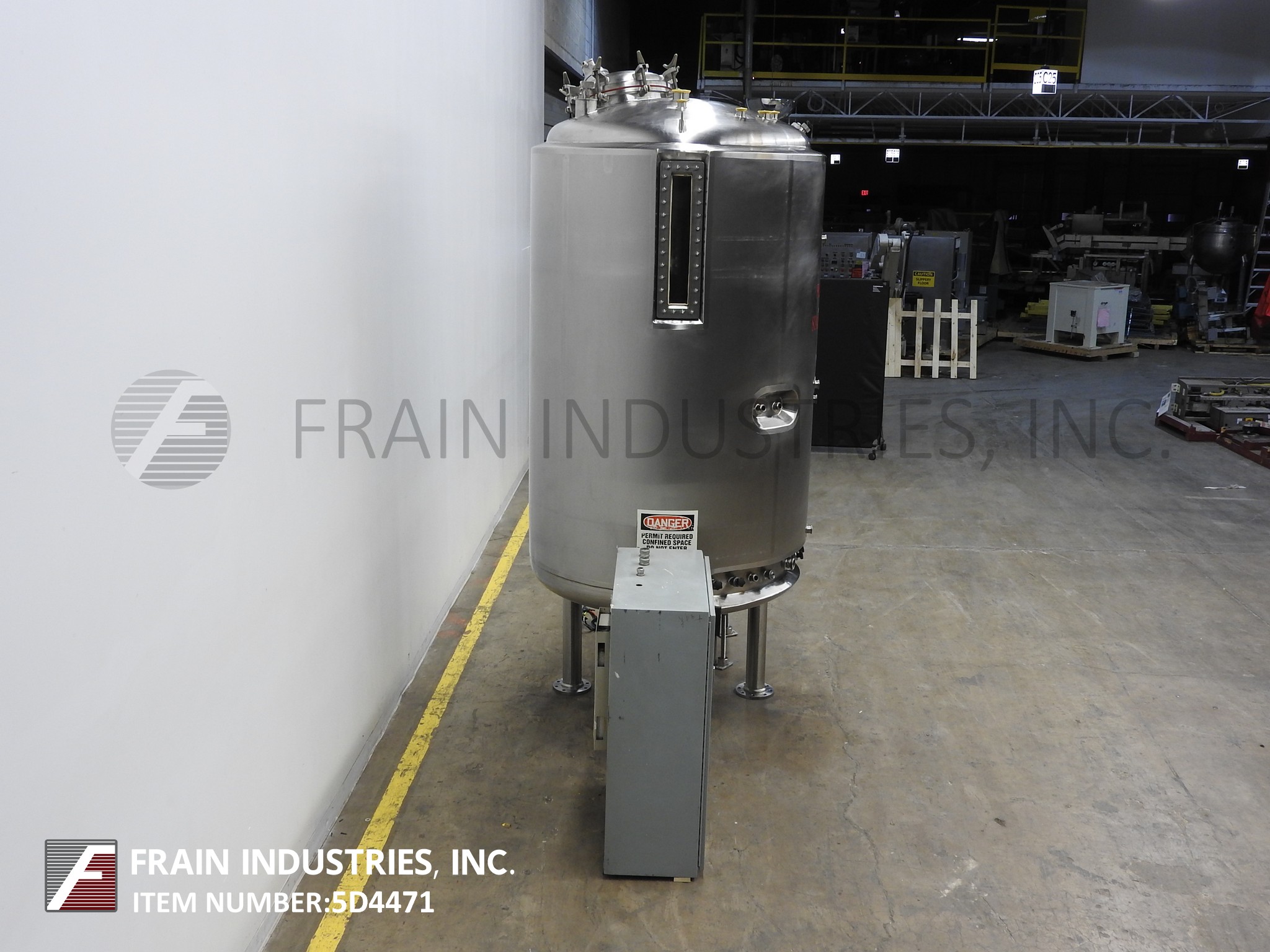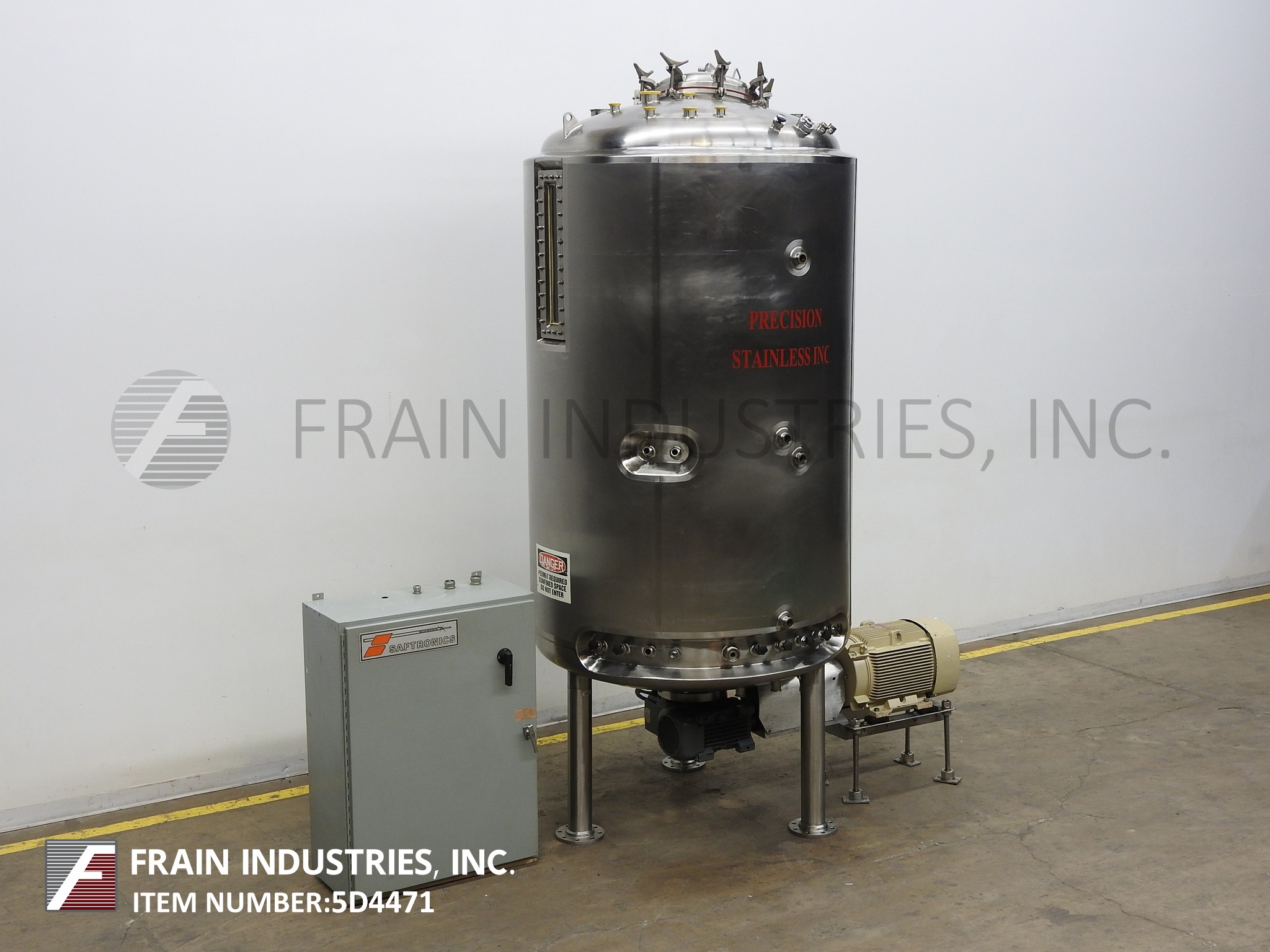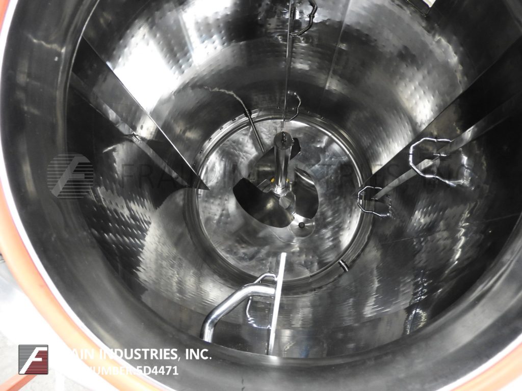 精密不锈钢,900加仑容量,316L不锈钢,夹套和绝缘,内置真空罐。船舶尺寸:54“直径x 96”深,带有90英寸的直墙。配备20“直径螺栓向下通路,带视线玻璃和灯,(4)5½”宽固定内部挡板,50 HP底部安装道具搅拌和2½“OD / 2”ID Tri-Clamp风格放电,26“接地间隙和流量控制阀。控制面板具有变速控制。