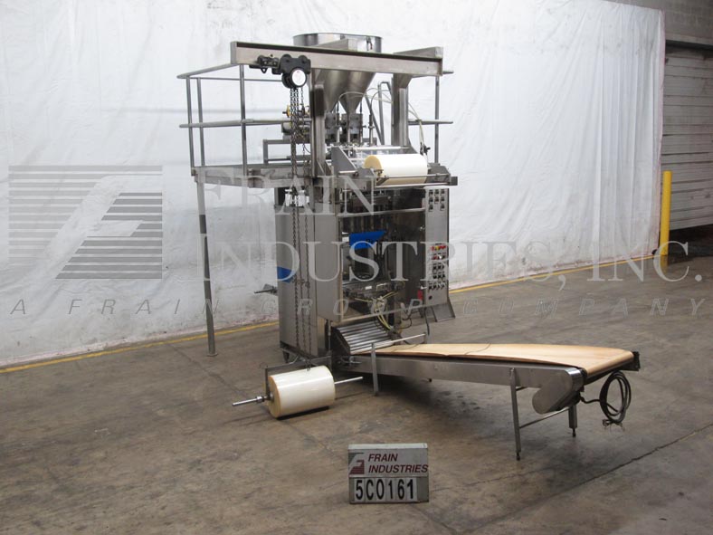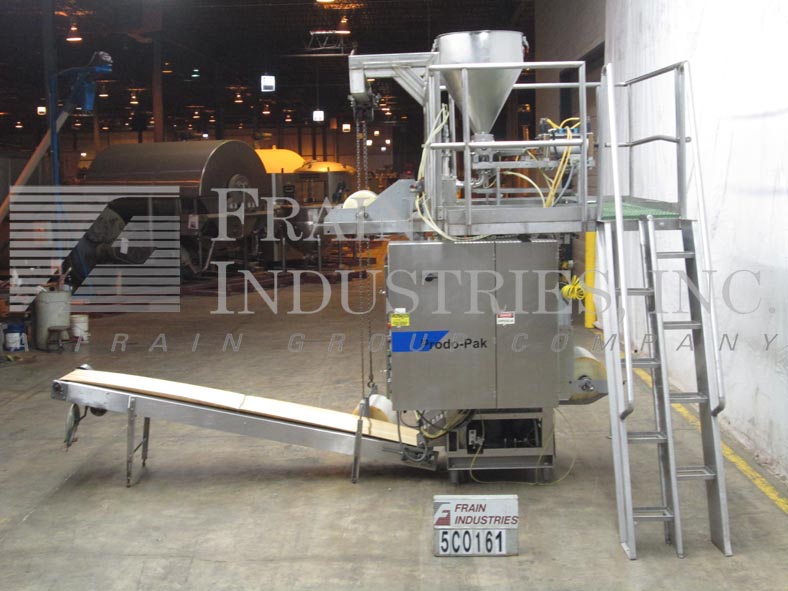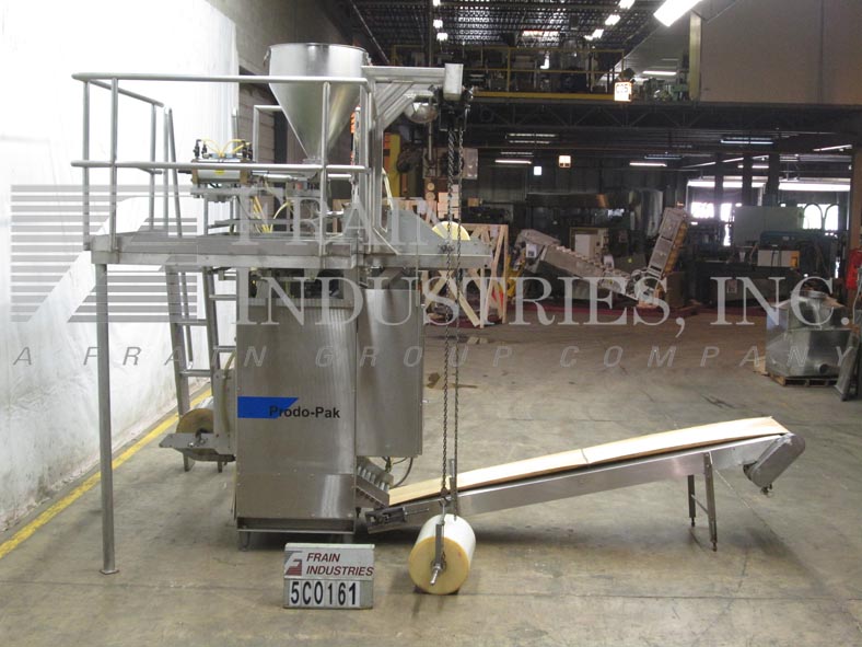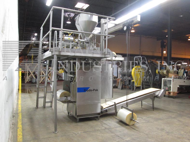 Prodo Pak Model 1000HFF2, Form, Fill & seal machine with number of pouches per minute – depending on materials and application. (4) sided seal bag up to 22-1/2" wide x 18" long. Equipped with dual auger feeders and webs, currently set for supported film and has (2) 8" diameter (192oz) pistons with manifold for single or multiple pouch filling, electric eye registration, bag deflator, 20" maximum roll diameter on 3" core. Control package has PLC controller. Mounted on a stainless steel platform with access ladder. Last filling 5 to 20 pound pasta sauce in an institutional size bag.