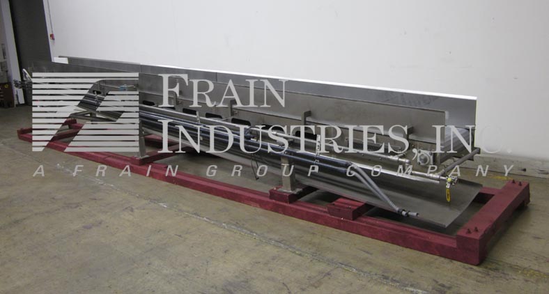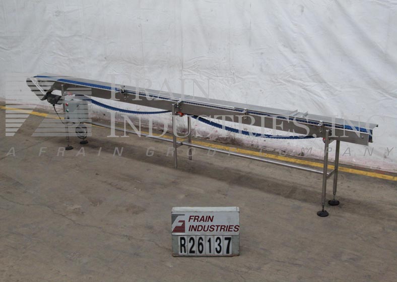 PSG, 312"长x 24"宽,塑料带,不锈钢,倾斜输送机。配备一个20"高进料,2马力驱动,10"高不锈钢导轨,和一个44"高放电。安装在不锈钢框架上。