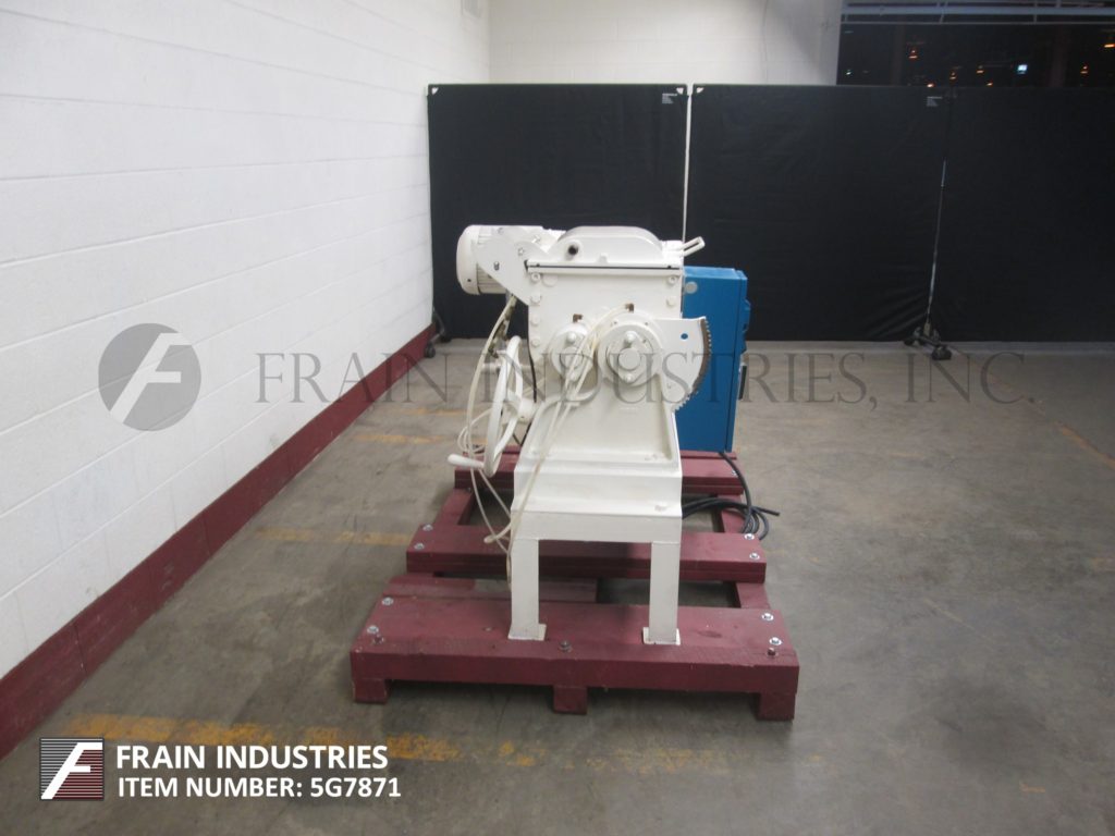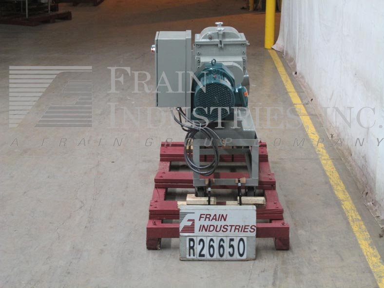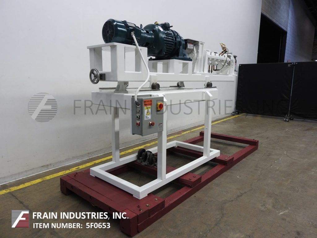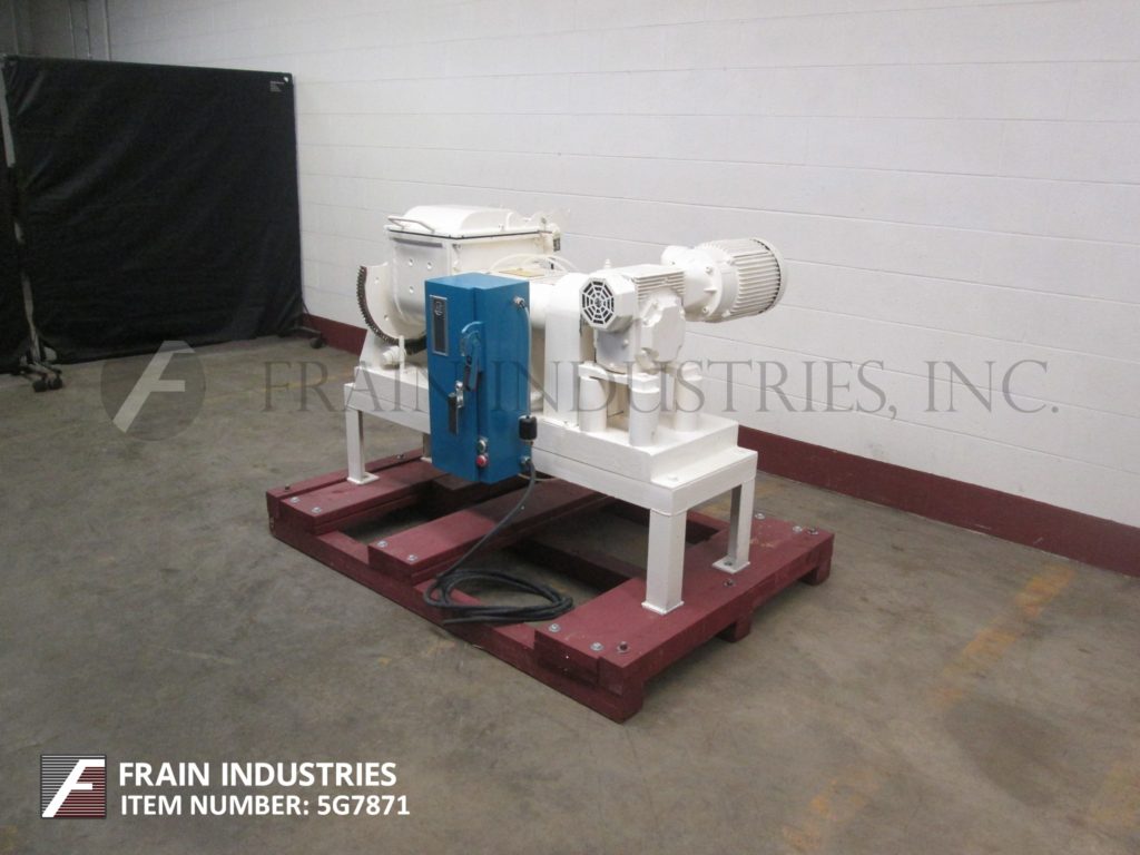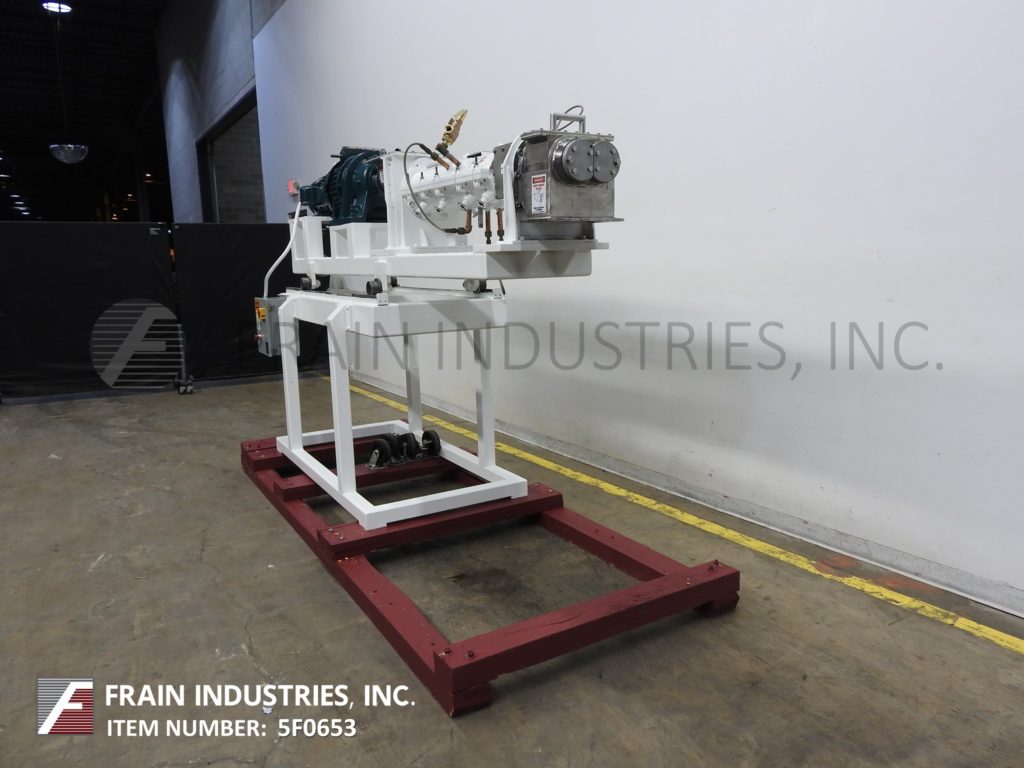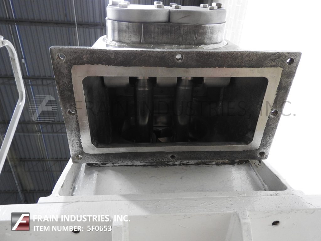 Readco,双轴,夹套,连续的搅拌机/处理器,每小时的产品磅数-取决于材料和应用。配备狼吞虎咽封面升空,7“x 7”OD法兰在饲料、40 x 10”夹套混合室,(8)3/4“ID螺纹夹套/出口港口,40”长x 5”OD不锈钢双轴搅拌器,12“x 7”OD法兰底部排出62”地板间隙和变速传动。安装在低碳钢底座框架和脚轮。能够处理大多数粘度液体/液体,液体/固体,固体/固体和典型应用包括捏合,烹饪,干燥,低/中压挤压和造粒。