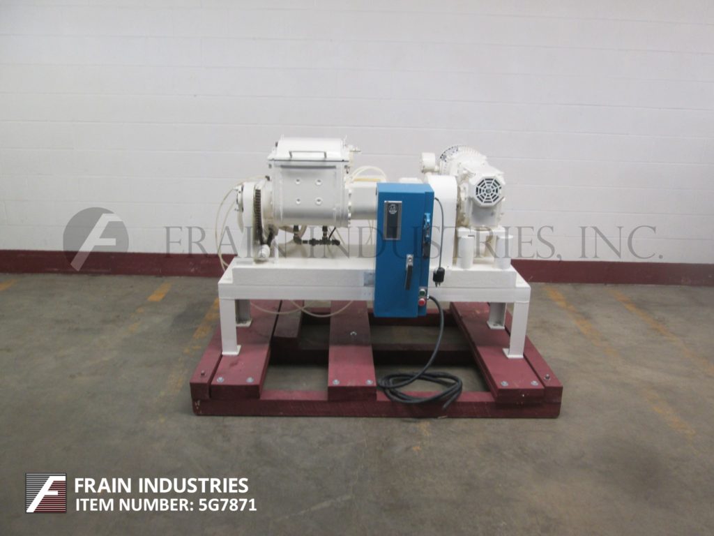 Readco / Teledyne型号,实验室尺寸,双臂,碳钢,夹套,重叠sigma叶片搅拌机,7.5加仑,30夸脱总容量和5加仑,20夸脱工作容量,每小时批次数-取决于材料和应用。腔室尺寸:12英寸长;13“宽;在深度12”。叶片尺寸:6"外径;12“长;2”宽。配有螺栓从上盖起升,全夹套额定压力为150 psi,温度为650℉,外径为(2)1”的螺纹夹套进/出口10马力主电源和1马力倾斜电源,链条到电机驱动和控制面板,带有前进、后退、停止混合机控制开关。安装在施法者。