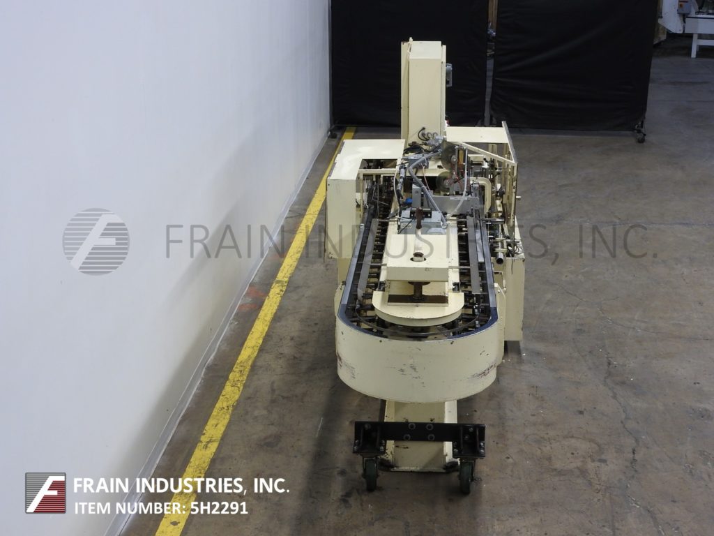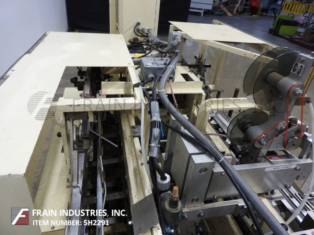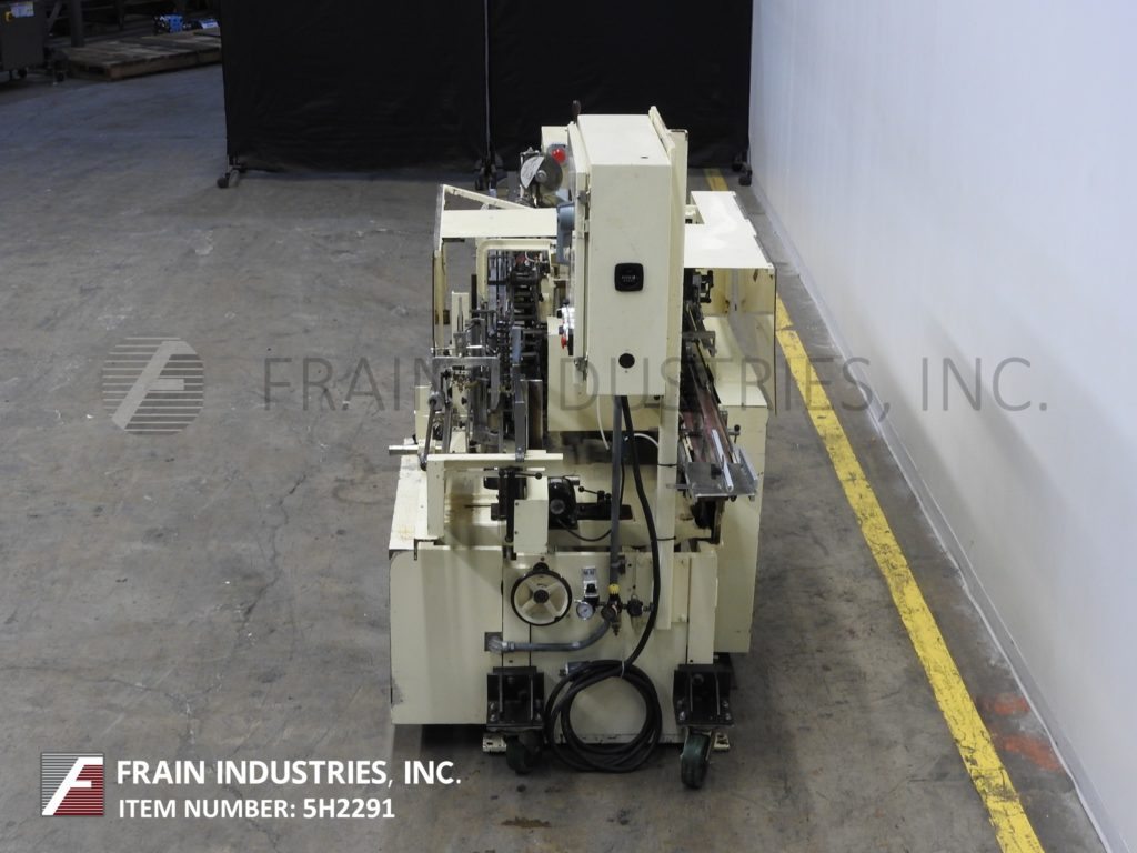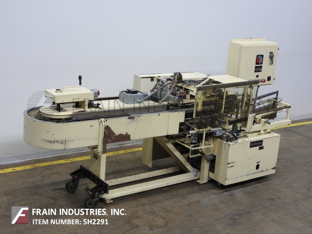 雷丁顿,9V型,半自动连续手动垂直装载,折叠纸箱机。每分钟可装25到120箱,具体取决于材料、应用和操作熟练程度。纸箱尺寸范围:3/4"至5"长度;3/4"到4"宽度;深度2½“至9”。配备3条可调链设置在6"中心,24"长的空白纸箱杂志,往复的纸箱pickn -place,(2) 48"长的手负载区域(每一边),顶部和底部的纸箱锁紧机构。控制面板与启动,停止和e-stop控制。安装在重型基础框架与脚轮和水平腿。