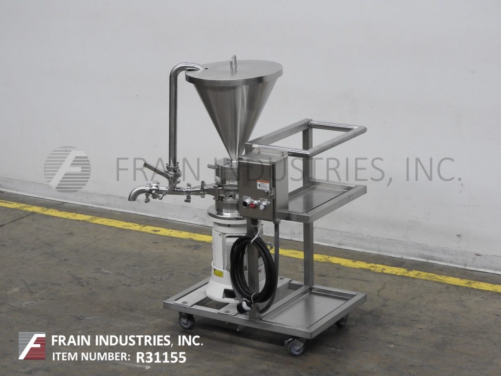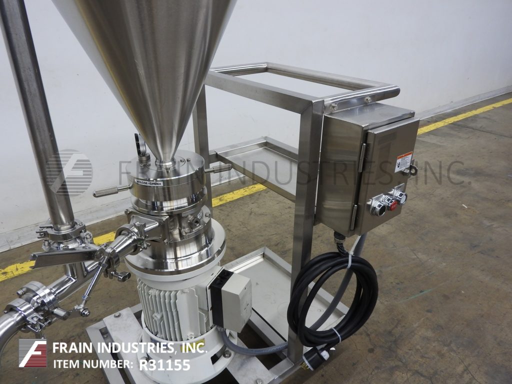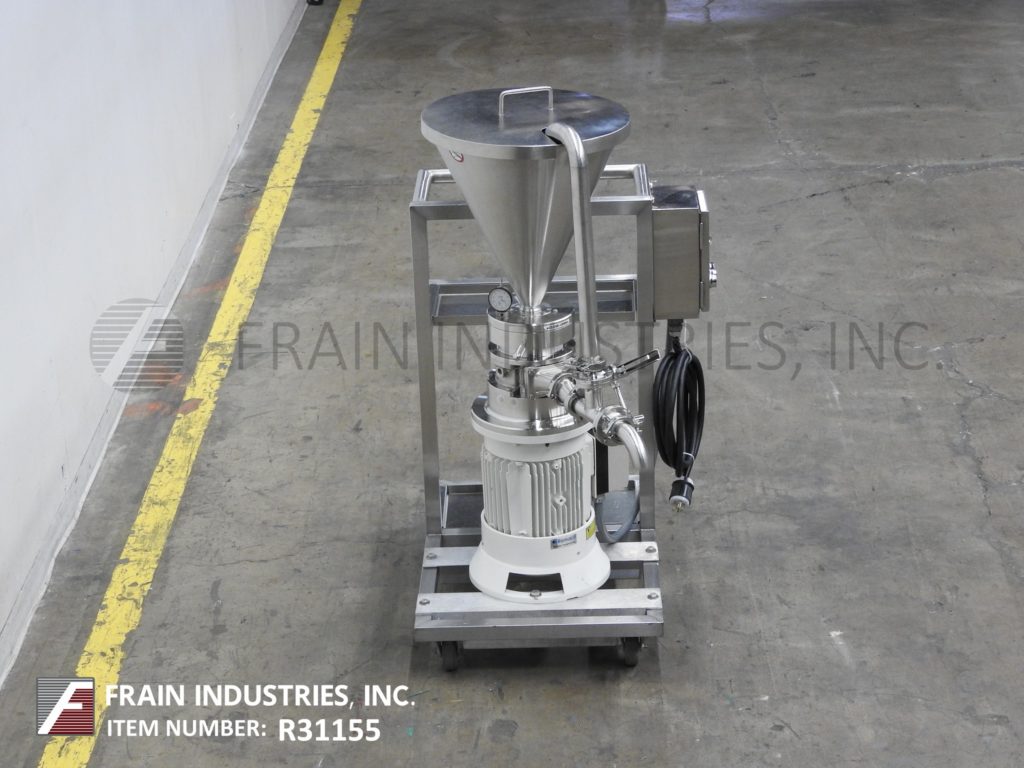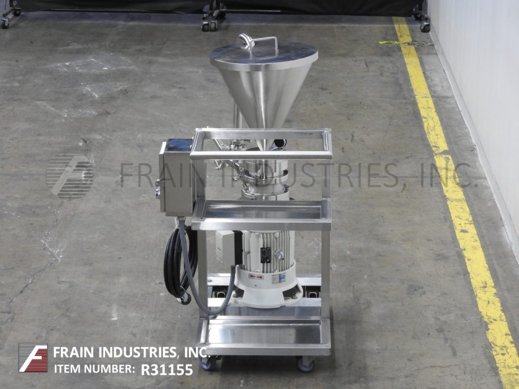 Romaco MZ100型,不锈钢,齿状胶体磨,生产速度从200到2000公斤的产品每小时-取决于材料和应用。配备16"外径x 19"深不锈钢,锥形产品料斗与升降盖。2-1/2"卫生侧端口,带有再循环管和2-1/2"外径侧端口。轧机有转子/定子,2-1/2"外径螺纹侧端口,压力表和7马力电机驱动器,并安装在45" x 34"不锈钢底座与脚轮。