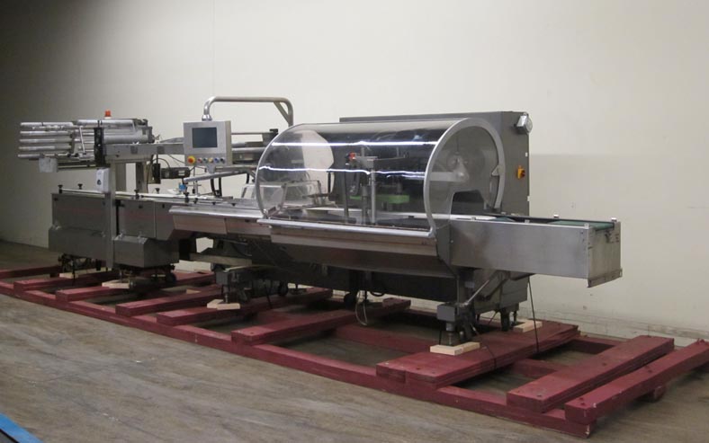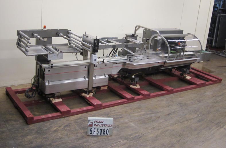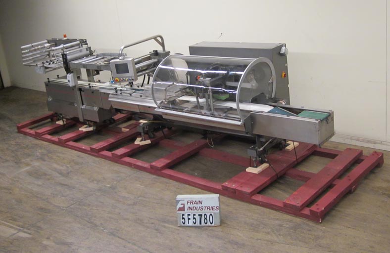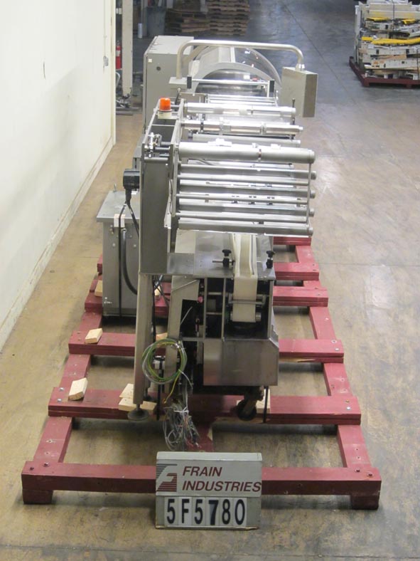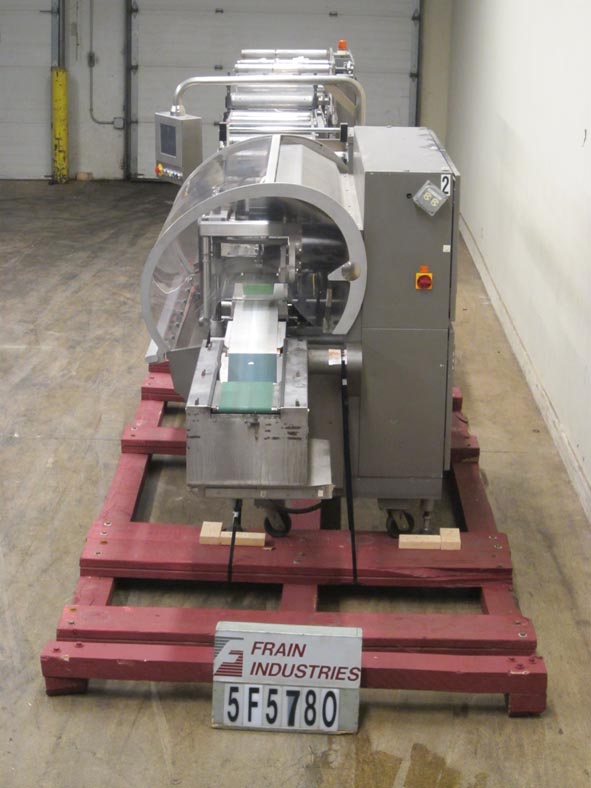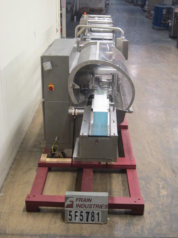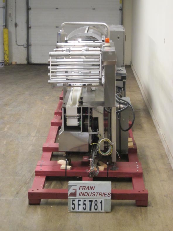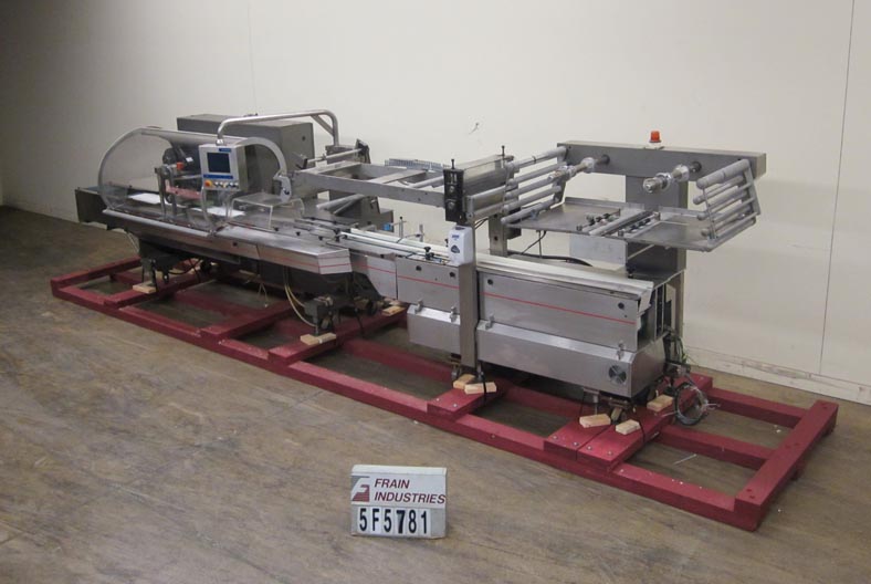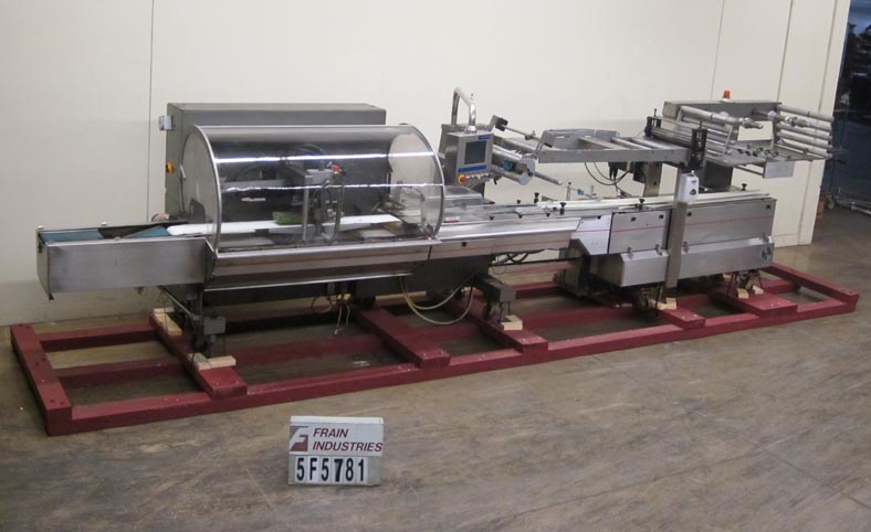 Rose Forgrove Model Integra 602, automatic, servo driven, horizontal wrapper, rated from 60 to 150 packages per minute – depending on materials and application. Package size range: 3.35" to 23.6" in Length x up to 10" in Width x up to 5.90" in Height. Equipped with stainless steel contact parts, all servo controls, 2 product in feed conveyors, into lugged feed conveyor set on 12" centers, dual film arbors with splice station, film registration, bottom fin seal wheels, 1-up, 11" Long x 1- 1/4" Thick serrated hot knife box motion cross cut seal jaw with flip up, shut off safety guarding. A/B servo controls has swing arm touch pad controller with panelview, statis light bar, e-stop buttons. Film spec’s: Maximum of 17-3/4" reel width, 19" diameter and 3" OD core. Mounted on steel it base frame with casters.