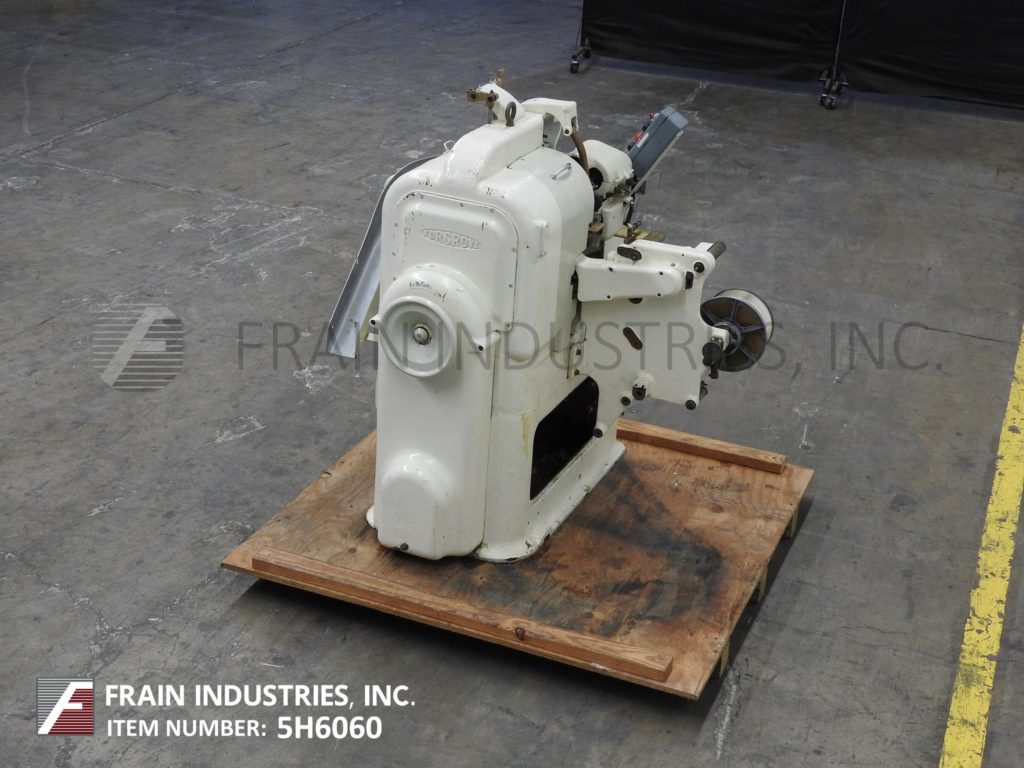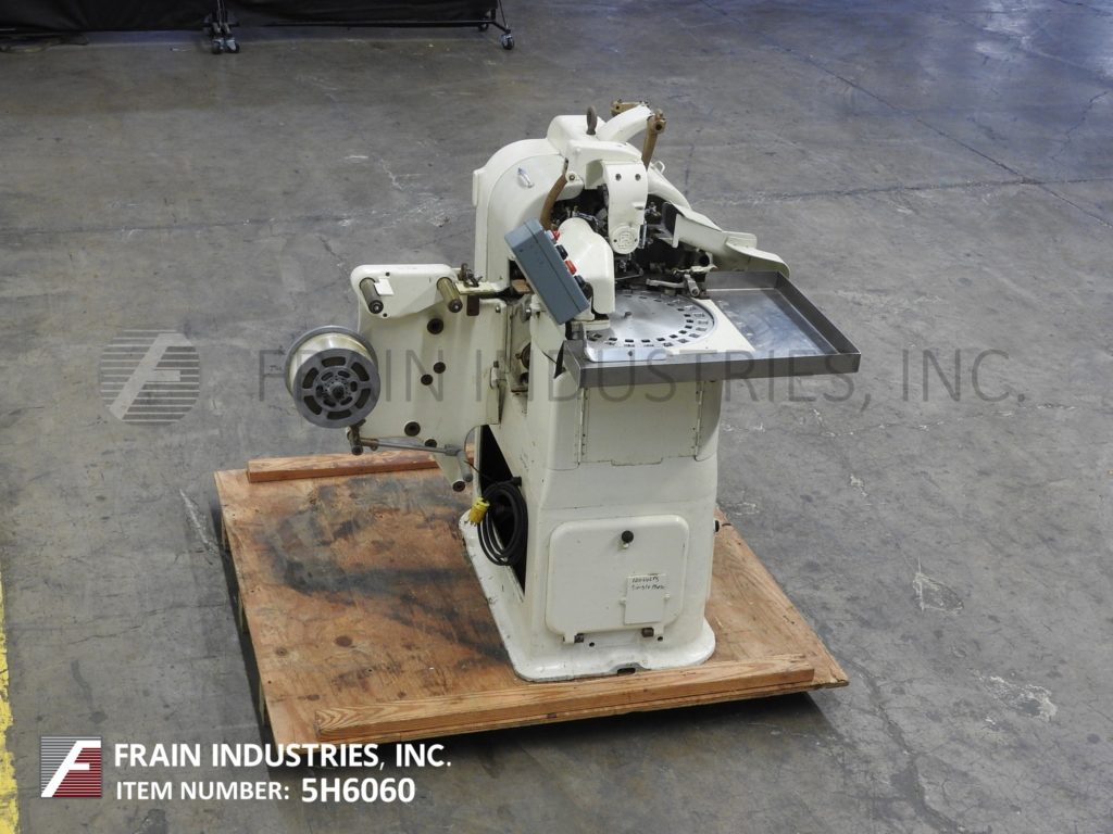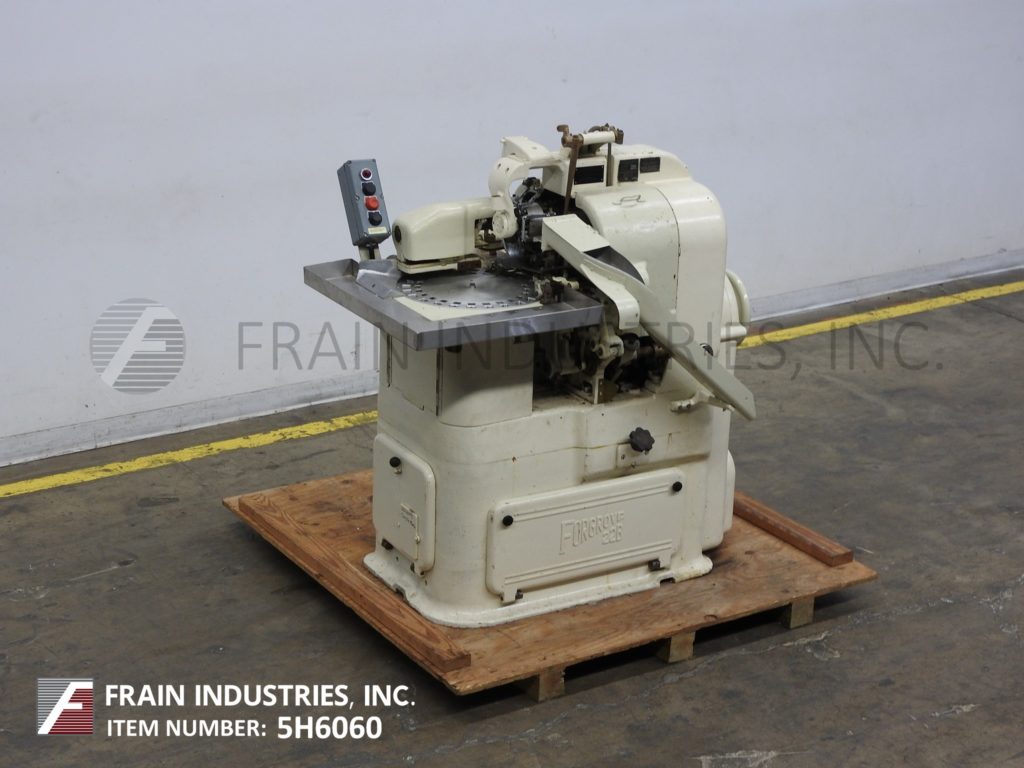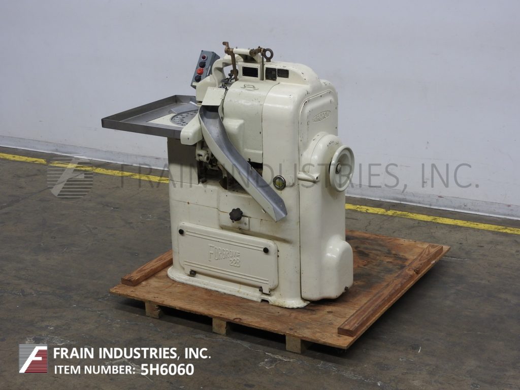 Rose Forgrove Model 22B, automatic, intermittent motion, double twist, wrapping machine rated up to 230 product wraps per minute – depending on materials, application and machine configuration. Size range: 16mm to 60mm in Length: 32mm to 86mm in Width; 9mm to 22mm in Height and is capable of handling pralines or bar end twist and end folds of most sizes and shapes. Equipped with 27" x 22" x 7" product accumulation table with 17" OD, 26 pocket hand load product disc, 9" OD foil film rollers with cut-off, form, fold and twist sections and 32" long x 4" wide product discharge chute. Control panel has start, reset and stop push button controls. Mounted on epoxy coated base frame. Universal machine for confectionery and rapid interchangeable for different sizes of sweet or style of wrap, primarily used for twist wrapping lollipops or similar tablets.