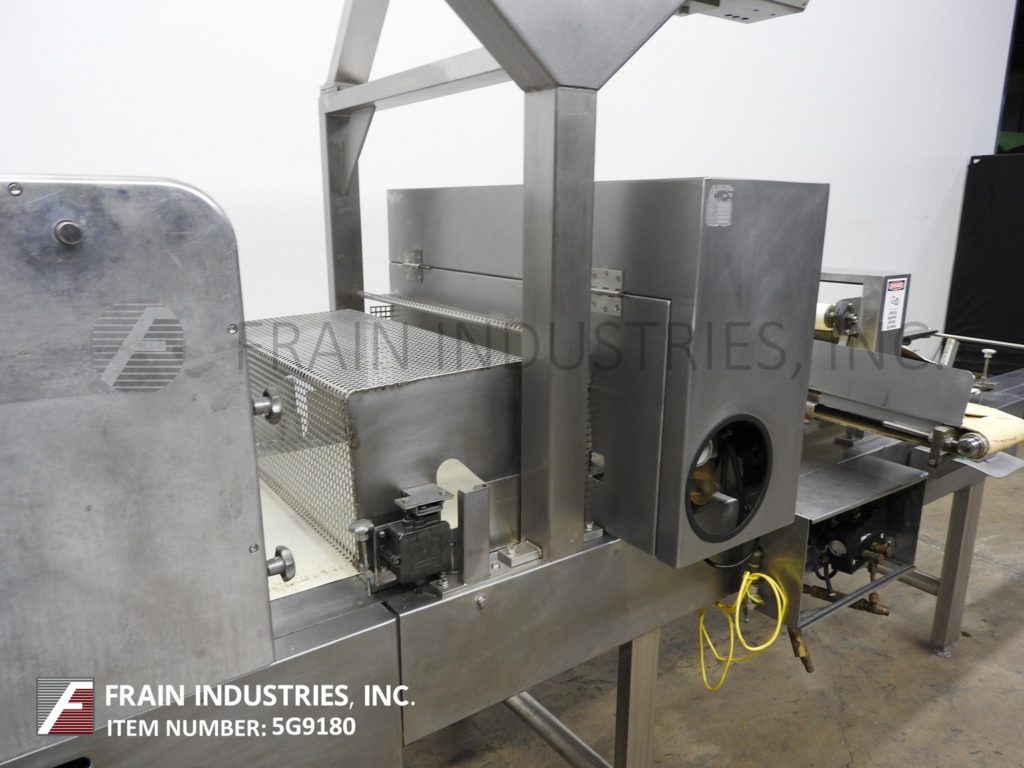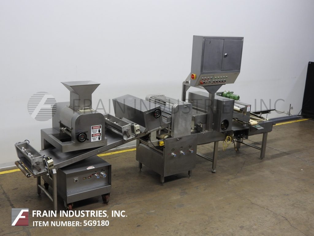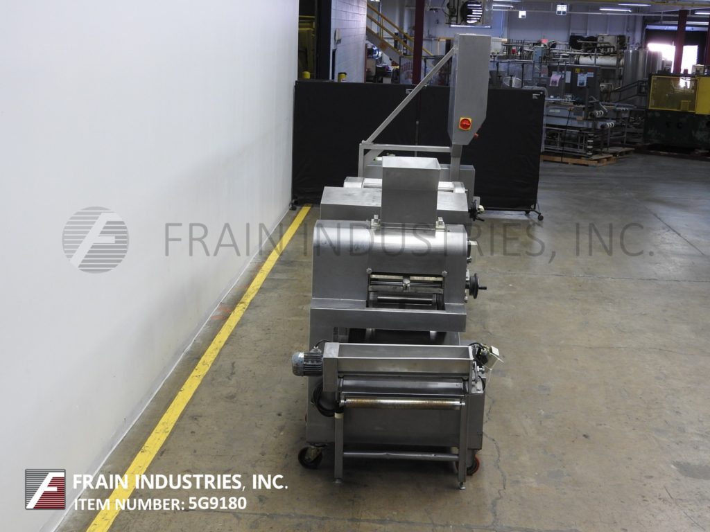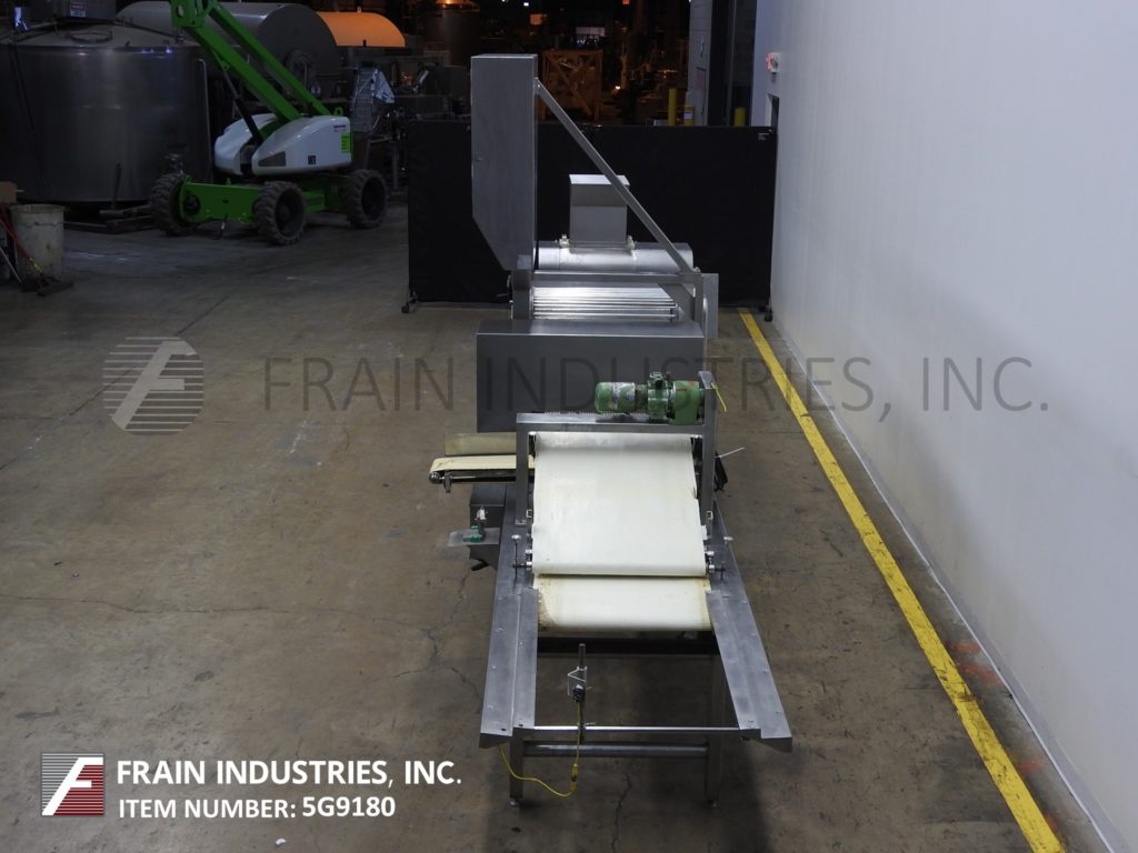 rijkaart / capway型号p&a,完整,不锈钢,24英寸宽,在线面团板材和模切系统,从20到100个每分钟的斯托克斯,产品数量 - 取决于材料和应用。配备面团面粉喷粉器到(3)卷纸头,13“长×9”宽x 16“深不锈钢产品料斗,(2)13-1 / 2”长×10“OD罗纹上辊和(1)13-1/ 2“长x 10”OD光滑底辊,确保一致和连续的面团板材。然后产品通过(2)组10“长×1”OD滚子的横脚搬运工来通过第二次面粉喷粉器,到最终(2)卷板头,顶部和底部24-1 / 2“长x7“OD光滑滚子到24”长x 6“宽的滤芯切割器,带废料返回和撤回产品卸载输送机部分托盘或锅。控制面板在供料表,交叉滚子,2卷车,主台供电,启动和电子停止控制,带有输入/输出和薄板快/慢速控制拨盘。全部安装在不锈钢框架上。