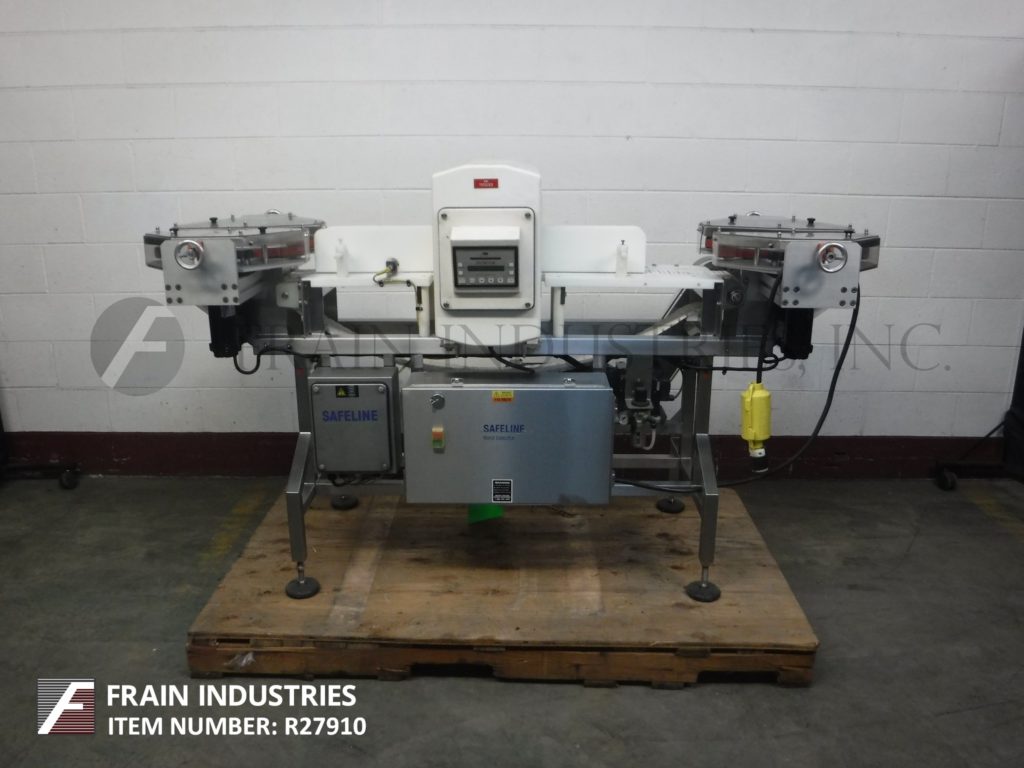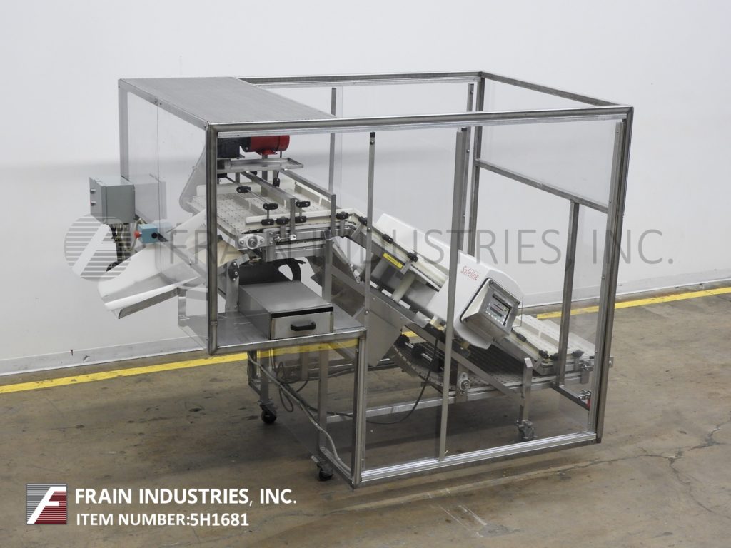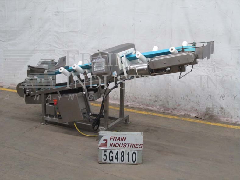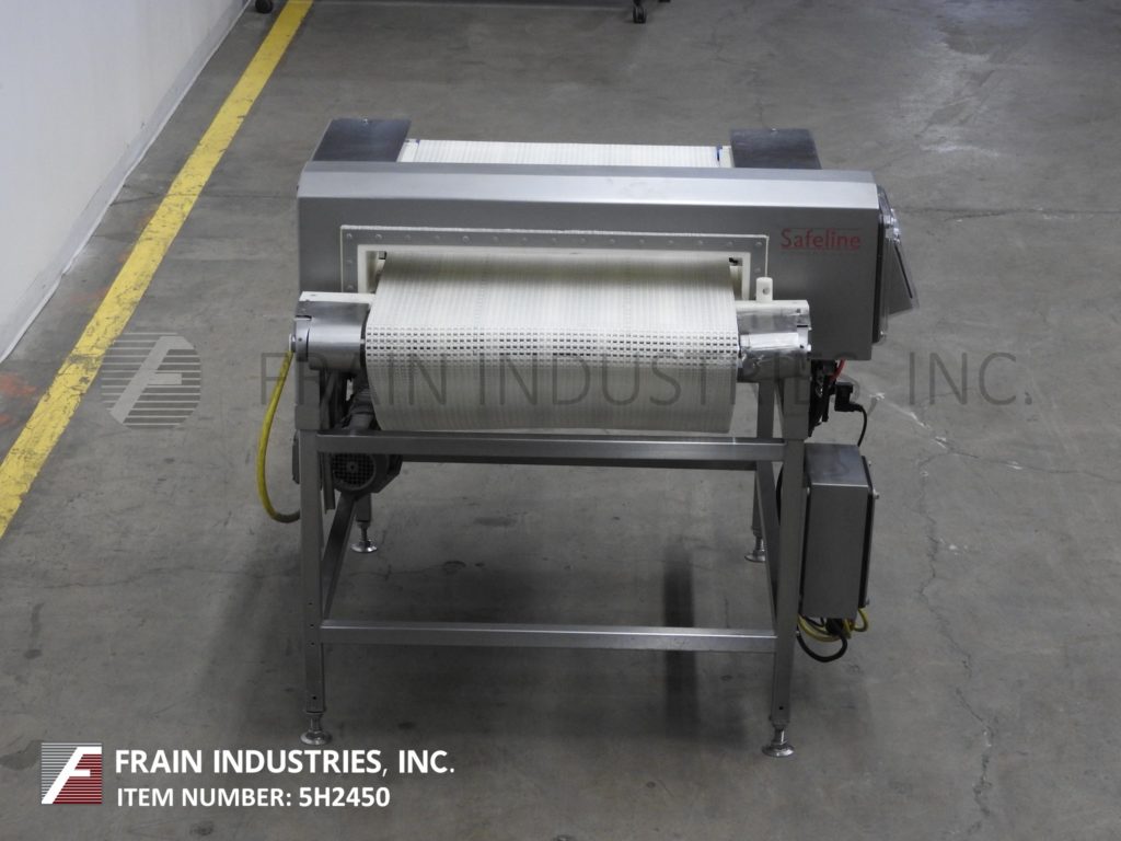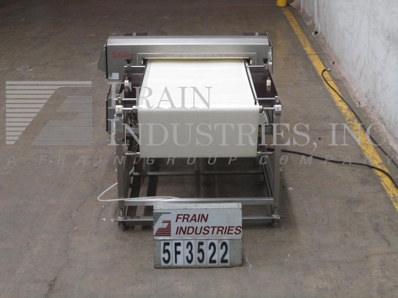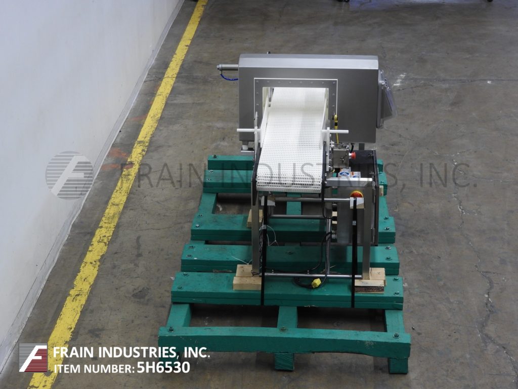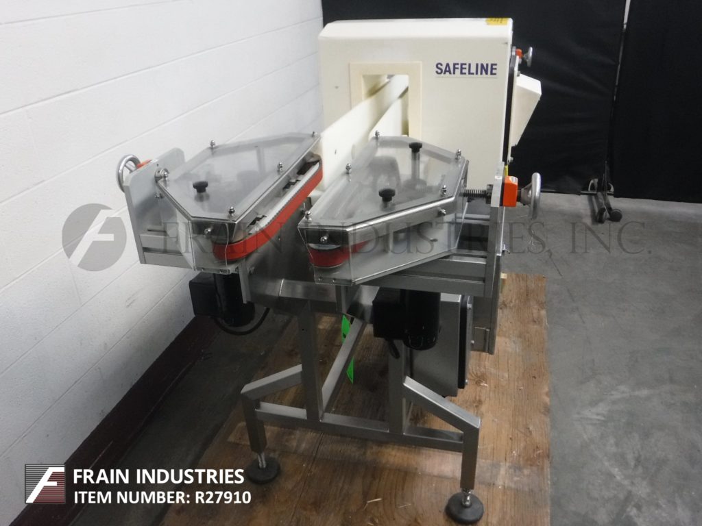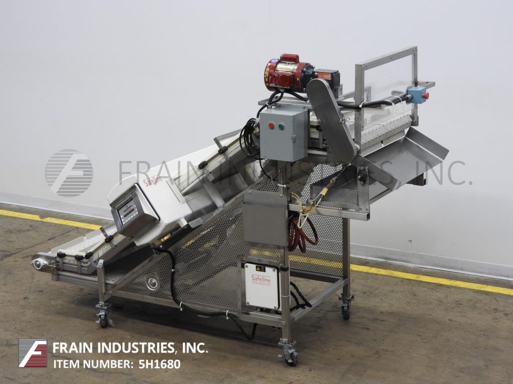 Safeline,SL2000型,自动金属探测器。每分钟的产品数量–取决于材料和应用。工作孔径:7½”高;宽5英寸。配备一台12“长x 1”宽的双边带式输送进料输送机、SL2000型52“长x 4”宽的绳内输送机、带停止带拒收的系统、12“长x 1”宽的双边带式输送卸料输送机。敏感性:取决于产品、容器和运行环境。触摸板操作员界面,带可视显示器。安装在带调平垫的不锈钢框架上。
