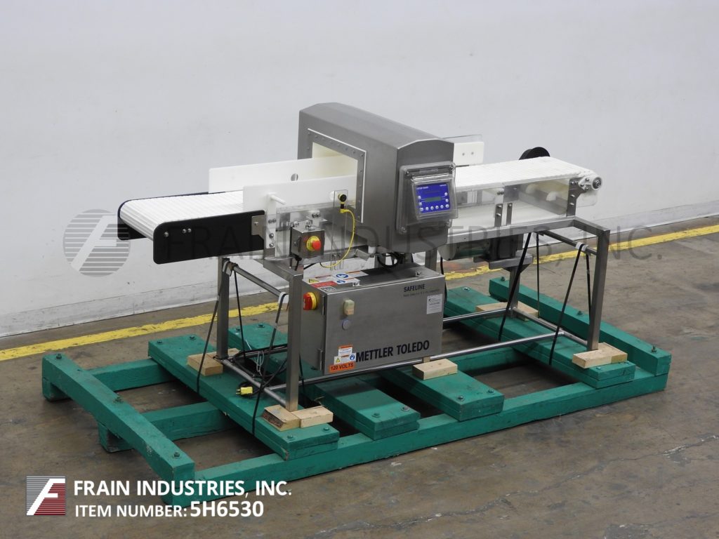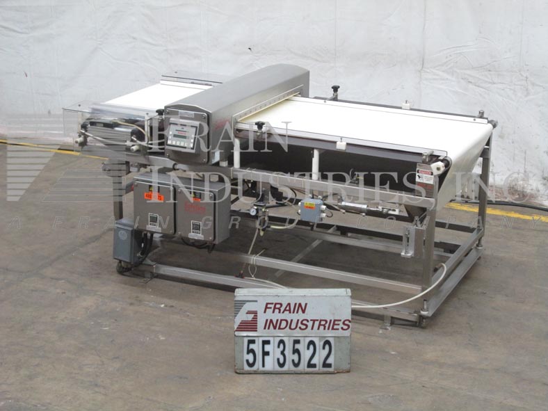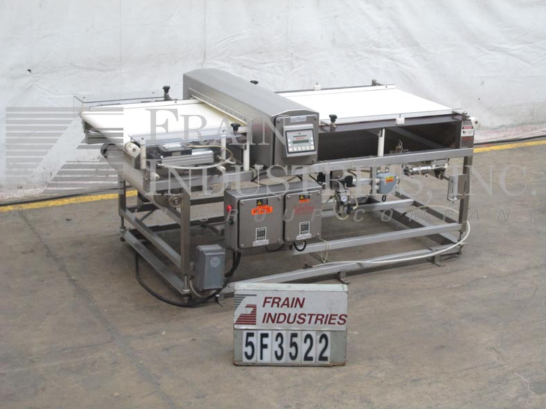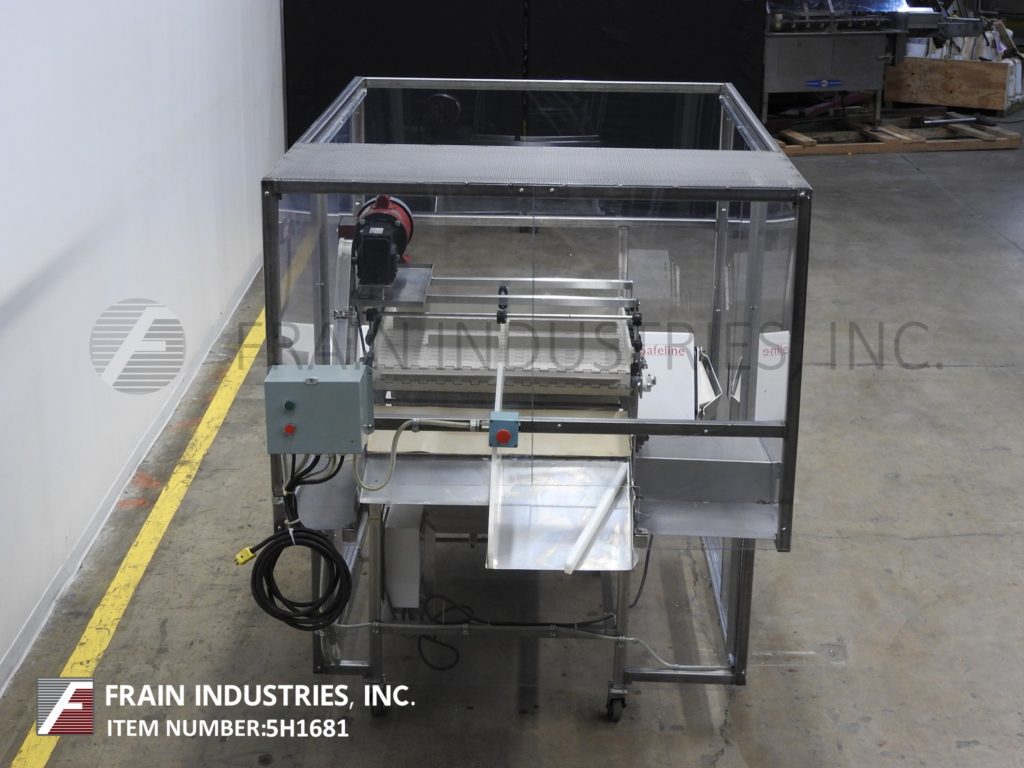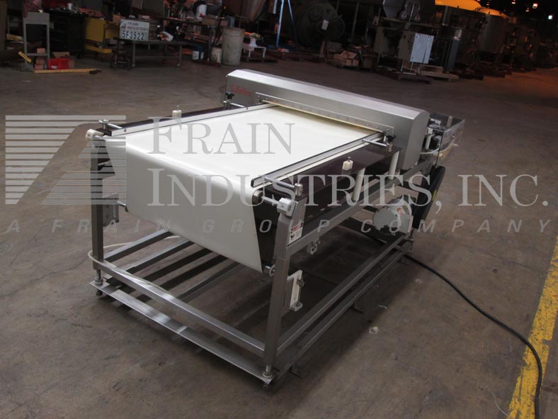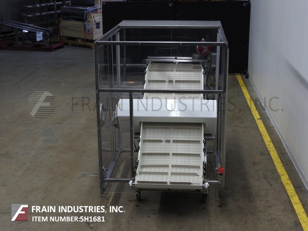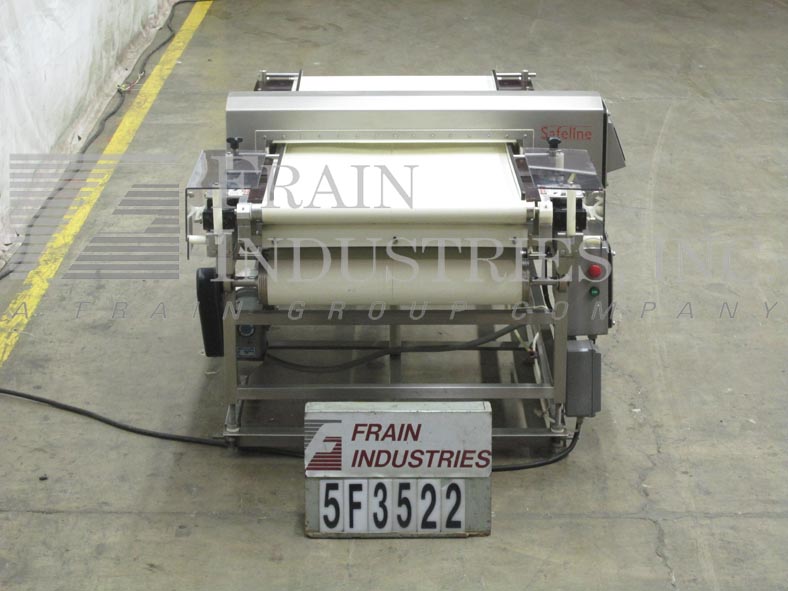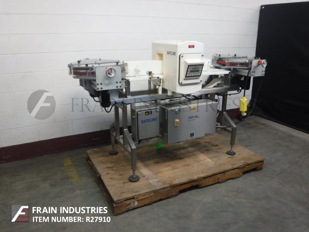 Safeline,SL2000型,自动金属探测器。每分钟的产品数量–取决于材料和应用。工作孔径:7½”高;宽5英寸。配备一台12“长x 1”宽的双边带式输送进料输送机、SL2000型52“长x 4”宽的绳内输送机、带停止带拒收的系统、12“长x 1”宽的双边带式输送卸料输送机。敏感性:取决于产品、容器和运行环境。触摸板操作员界面,带可视显示器。安装在带调平垫的不锈钢框架上。
