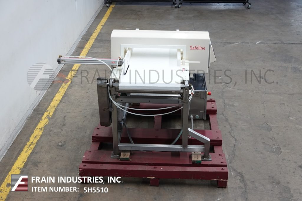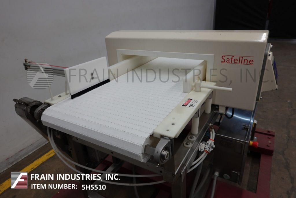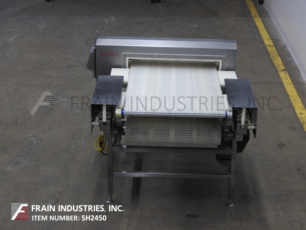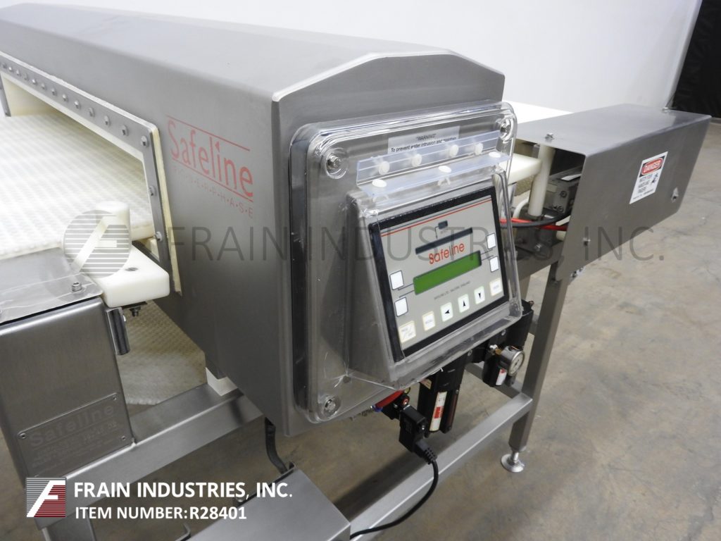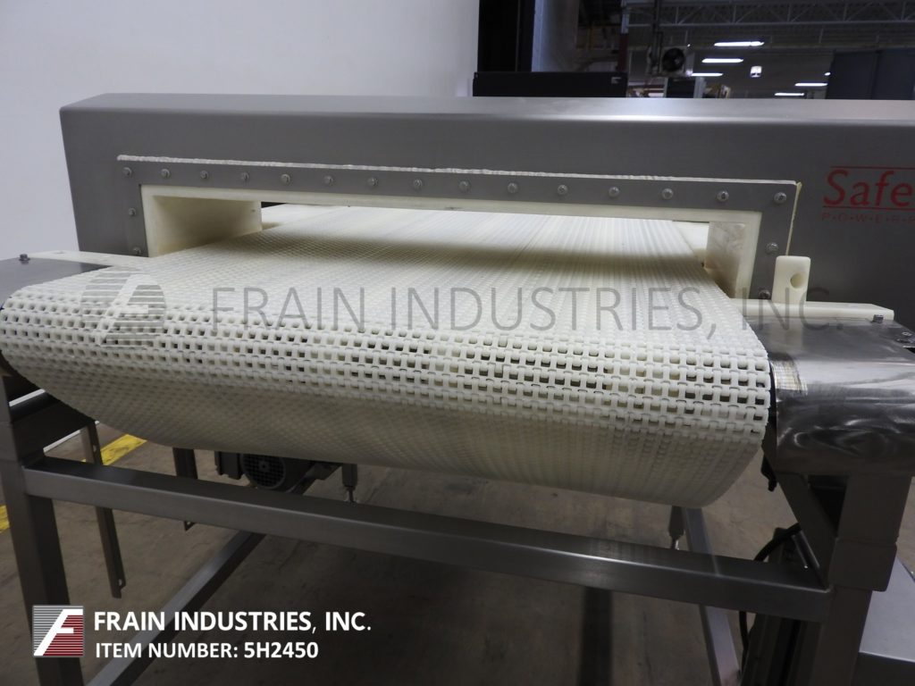 Safeline型号功率相位,不锈钢,2频率金属探测器,额定从0到100英尺每分钟的产品数量-取决于材料和应用。配备29英寸宽;2-3/4”高度工作光圈。配备60英寸长x 28英寸宽的白色Intralox输送带,进料和出料高度为36英寸,具有重跟踪鼻拒绝。频率额定值为100 / 300,灵敏度额定值取决于产品、容器和运行条件。触控板控制器,LED显示。安装在不锈钢(4)腿基础框架。
