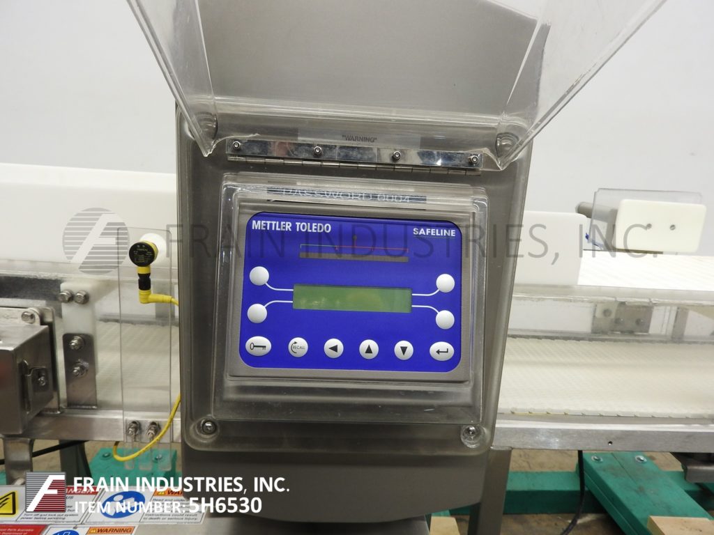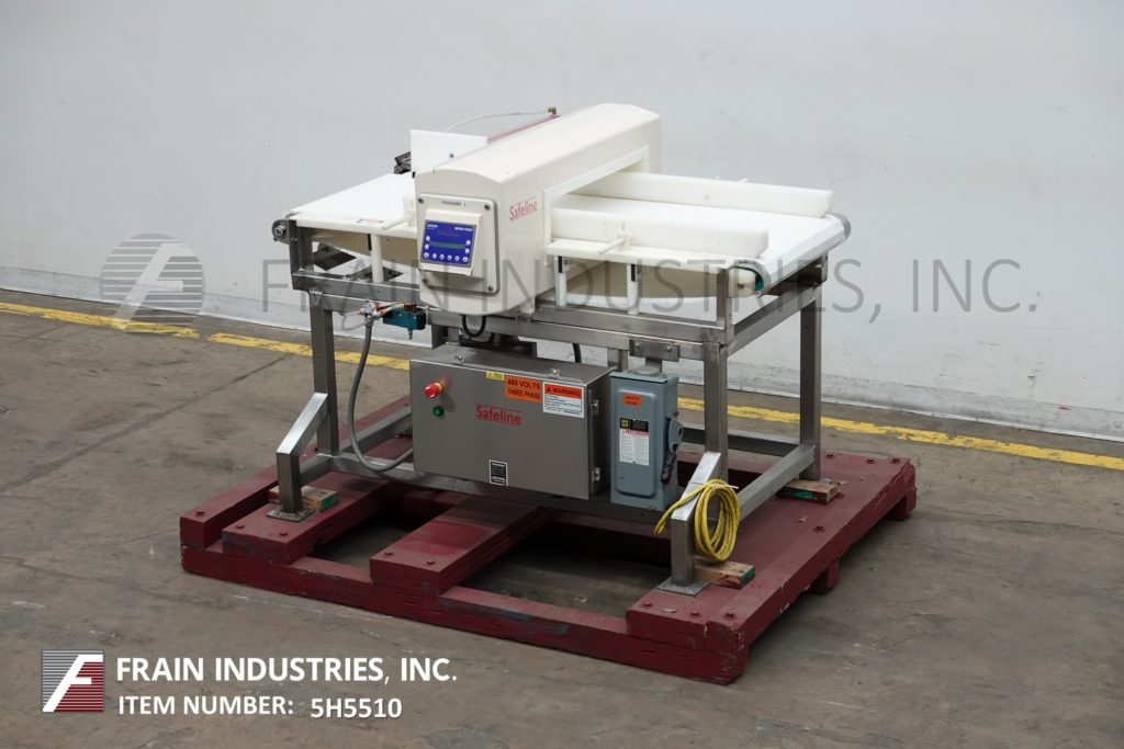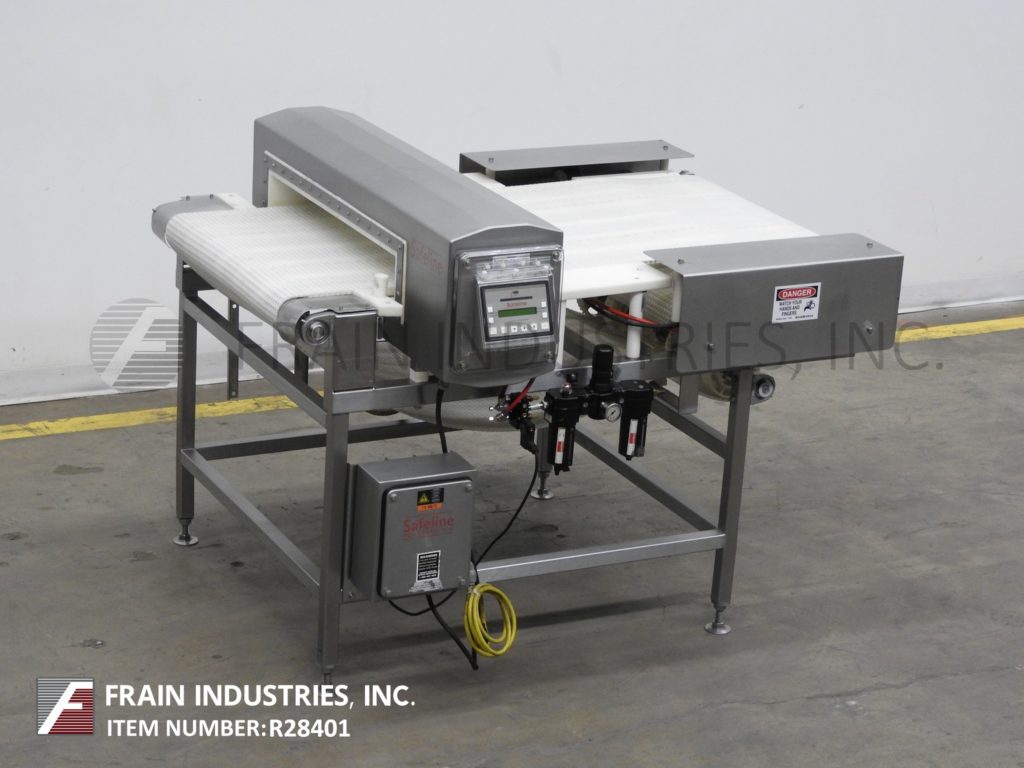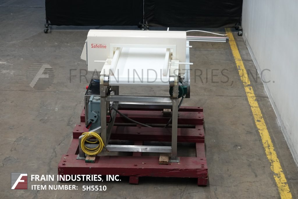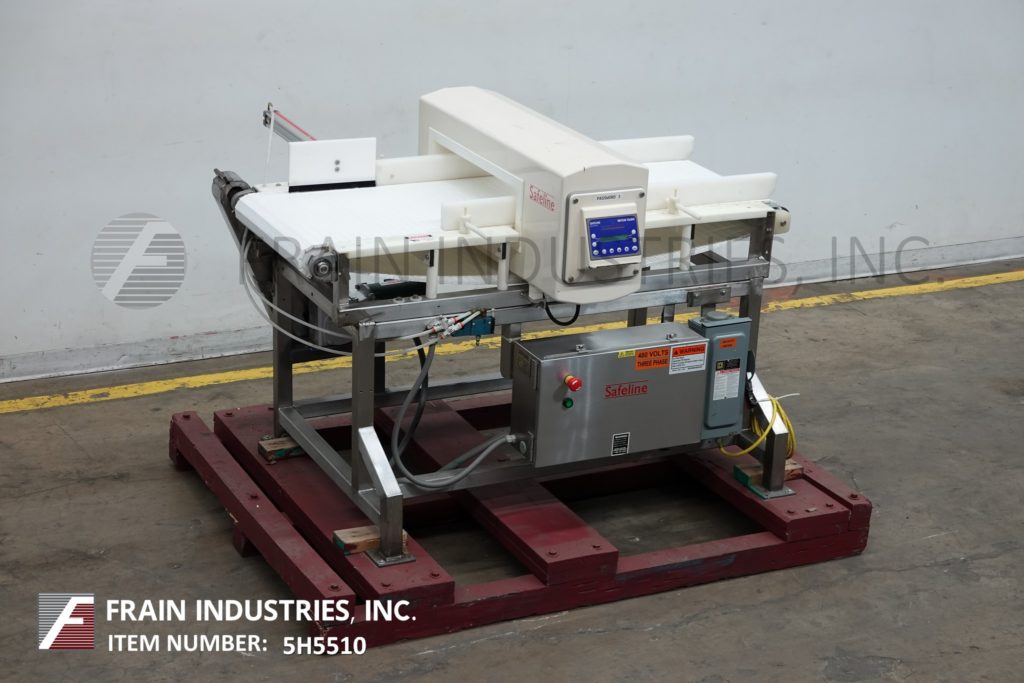 Safeline型号功率相位,不锈钢,2频率金属探测器,额定从0到100英尺每分钟的产品数量-取决于材料和应用。配备29英寸宽;2-3/4”高度工作光圈。配备60英寸长x 28英寸宽的白色Intralox输送带,进料和出料高度为36英寸,具有重跟踪鼻拒绝。频率额定值为100 / 300,灵敏度额定值取决于产品、容器和运行条件。触控板控制器,LED显示。安装在不锈钢(4)腿基础框架。