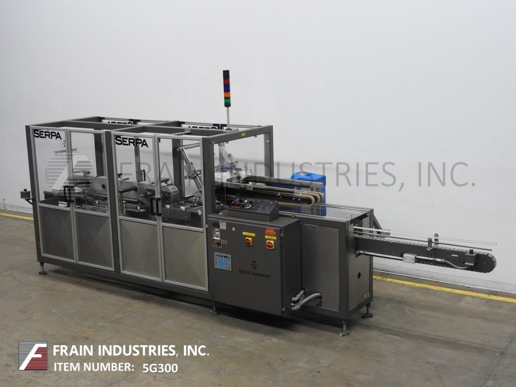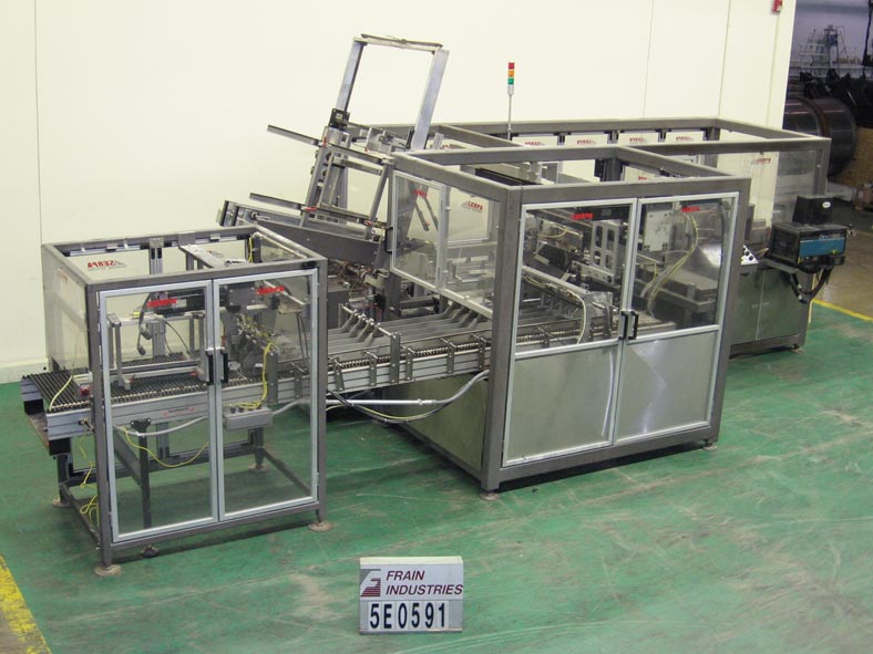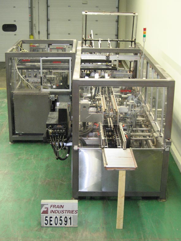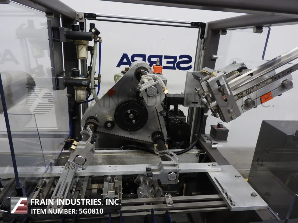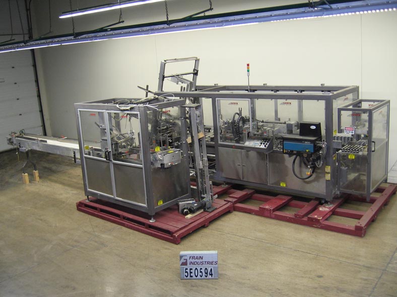 Serpa,2000WA型,自动连续运动包装周围的热熔胶胶带纸盒每分钟30到120纸盒 - 取决于材料和应用。1个链单元设置在9“中心,纸箱尺寸范围为:1”至9“的长度;宽度为1至3½”;5“到9”深度。配有2英寸宽x 90英寸的饲料输送机,带双蜗杆螺钉,36“长x 15”宽动力空白纸箱杂志,(2)头旋转式pic-n-place,70“长固定架空产品夹组件包装夹板闭合,36“长次级铺设侧链指数输送机,均用9”中心,电凸轮加5000控制面板,Nordson热熔胶系统,2“宽X 42”长产品排放带式输送机,控制面板,已开始/停止,运行/慢跑,转发/反向,真空接通/关闭,变速控制和e-stop。其他功能包括西卡仪表和联锁安全防护。