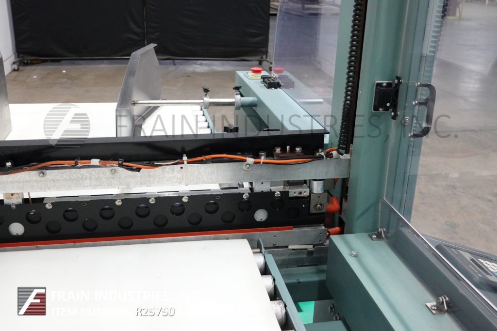 山克林F5A型,水平流动通过收缩包装,额定从0到90线性英尺每分钟的产品数量-取决于材料和应用。包装尺寸范围:3“到48”的长度;宽度1/2“到16”;1/8“到6”的高度。在进料输送机中配备86”长拖产品,目前设置在18”中心,1-1/2”高x 1-1/2”宽凸耳,22”预折叠侧膜unwind,带穿孔轮,废料清除轮,双线侧密封和18”宽热刀切断,24”长x 16”宽,双10”长x 5-1/2”宽进料输送机和双20”长x 5-1/2”宽出料输送机。控制面板有A/B PLC控制器与触摸板控制和末端热密封,主驱动和运行控制表盘。跑步,慢跑,前进,逆转控制开关,启动,停止,电子停止按钮和翻转安全防护。安装在重型基础框架与脚轮。