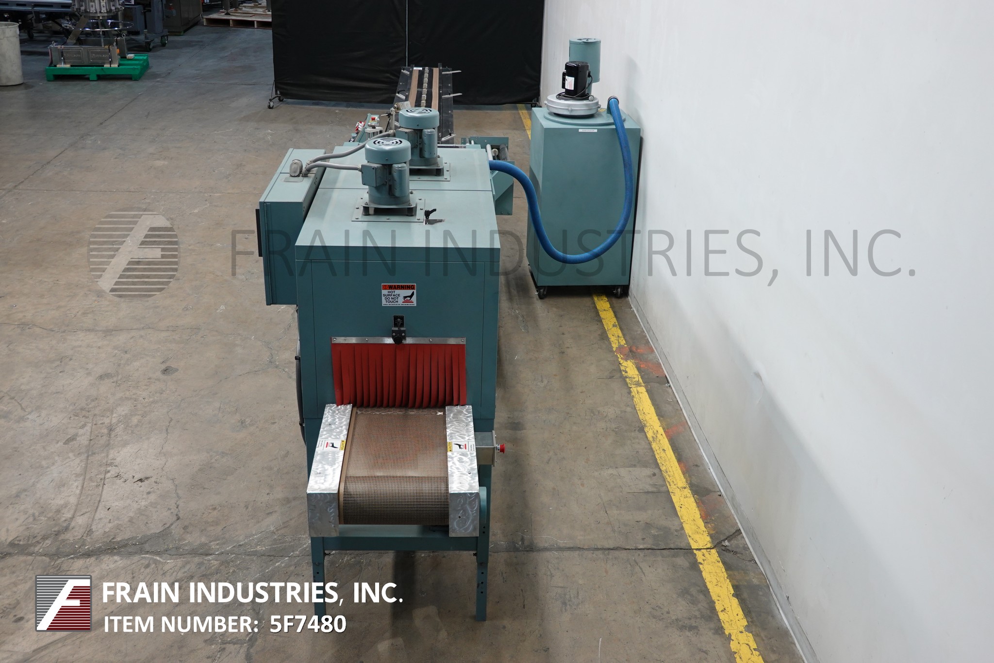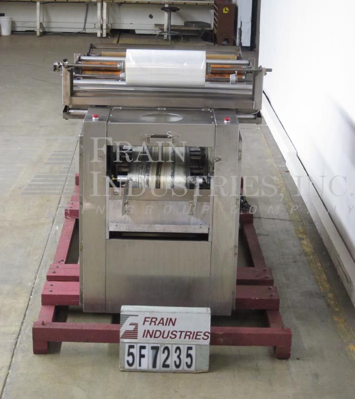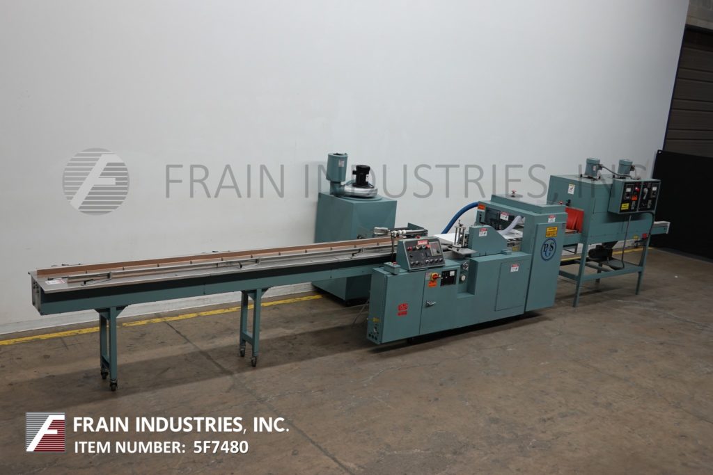 Shanklin F3型,水平,连续运动,流动通过收缩包装额定从10到60线性英尺每分钟,产品的数量-取决于材料和应用。包装尺寸范围:长度4"至46";宽度1-1/2"至16";3/8英寸到6英寸的高度。配备方面电影放松和最大电影宽度22“折叠和44”平坦,48“长拖着产品在进料输送机设置9日“中心1”高凸耳,形成头部,(2)20”长x 7”宽帆布输送带,16“长热刀密封颚下静态圈密封和穿孔轮子。控制面板开始/停止,慢跑,刀,控制与温度计,双14”长x 7-1/2”宽帆布带卸货输送机与36”卸货高度。