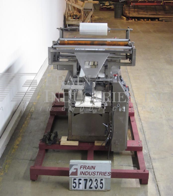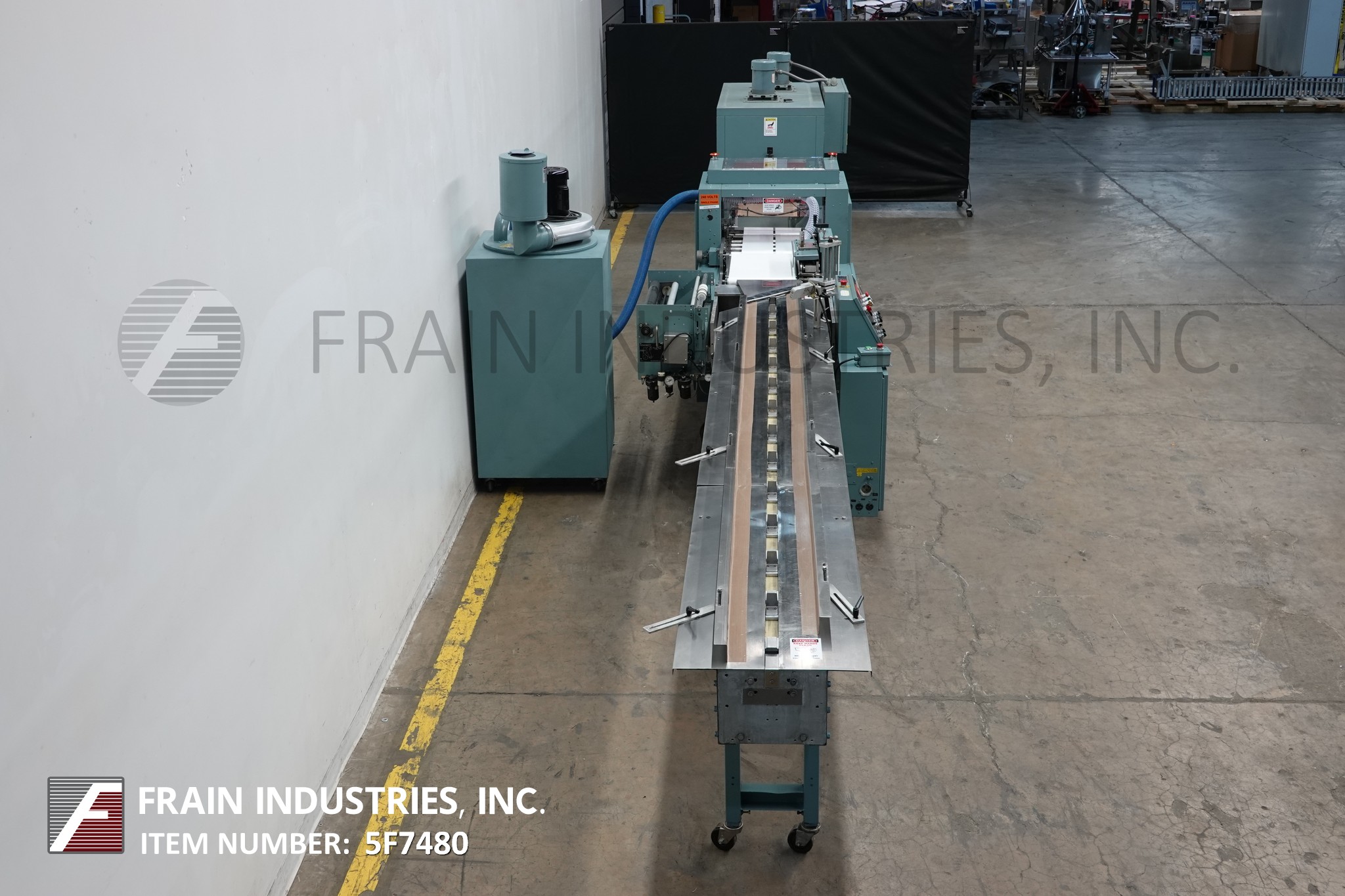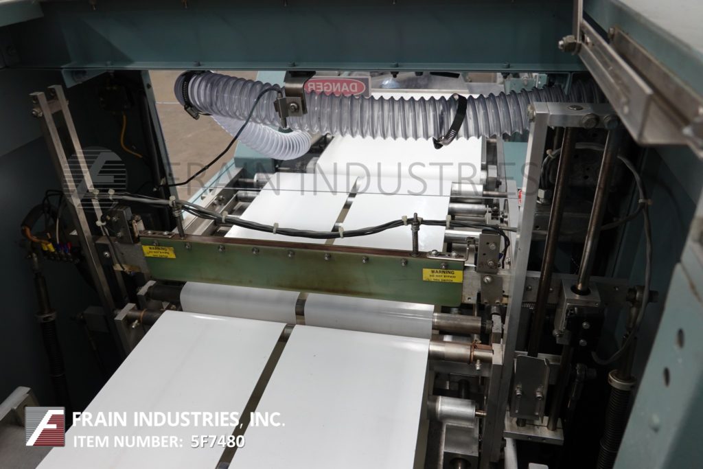 Shanklin F4A型,自动,连续运动,通过包装器额定从20到75包每分钟-速度取决于材料和应用。包装尺寸:3"至48"长度x 1-1/2"至16"宽度x 1/8"至6"高度。配备94"长凸耳进料输送机1"高凸耳在13-1/2"中心到成型头,34"长的真空压下带,18"宽热刀密封颚和底部静态搭接密封,双20"长的卸料输送机。PLC触摸屏控制器和数字读数,控制面板端顶部/底部热封控制器,运行/慢跑/前进/后退,启动/停止控制与e-stops。46"长胶卷卷,最大胶卷宽度22"折叠,44"平,(5)穿孔轮,