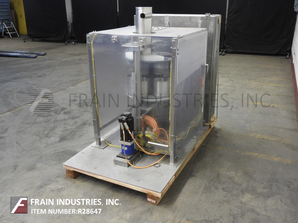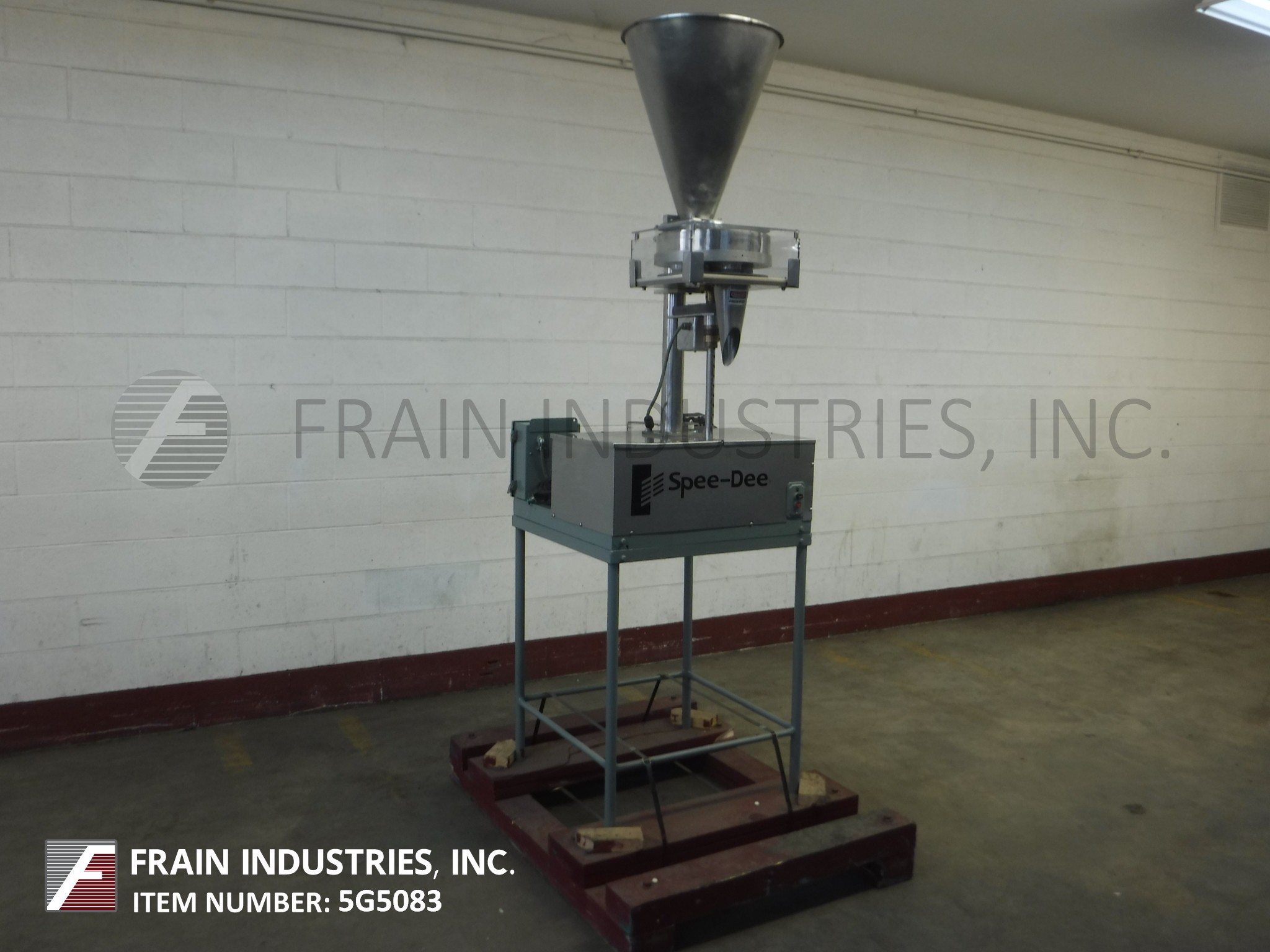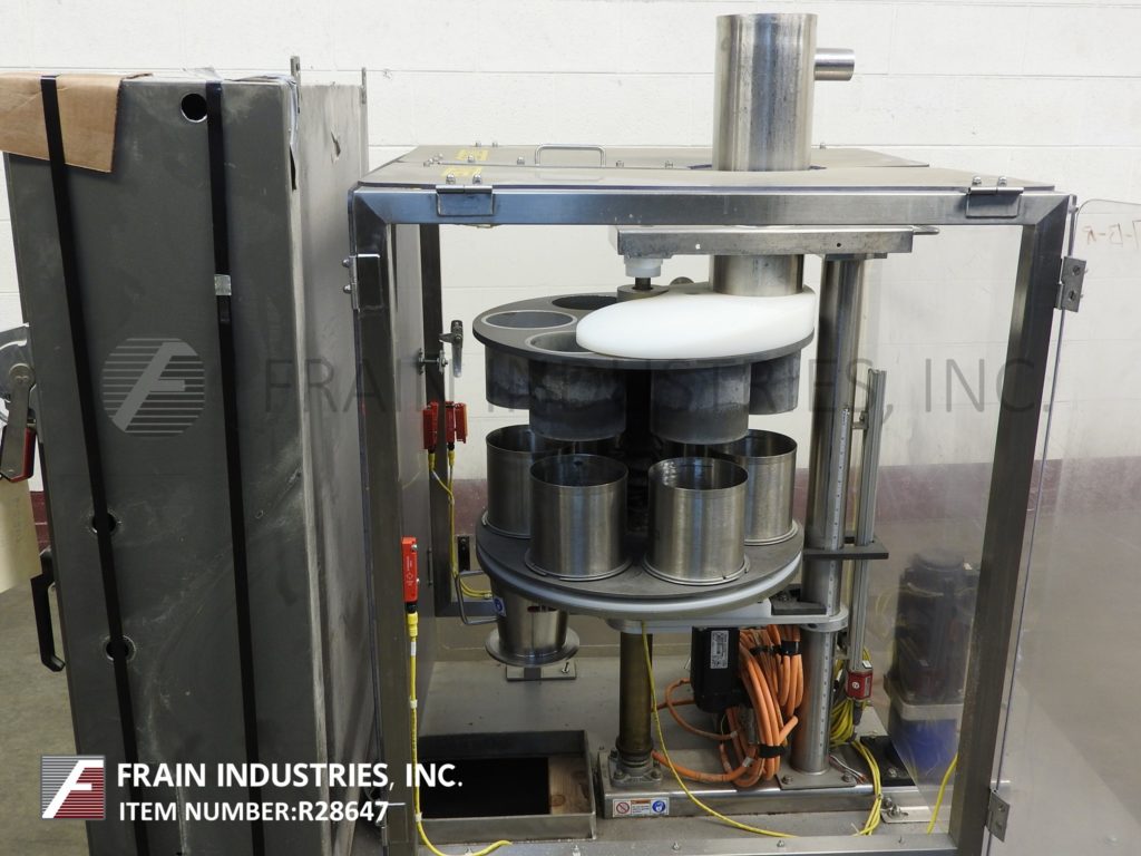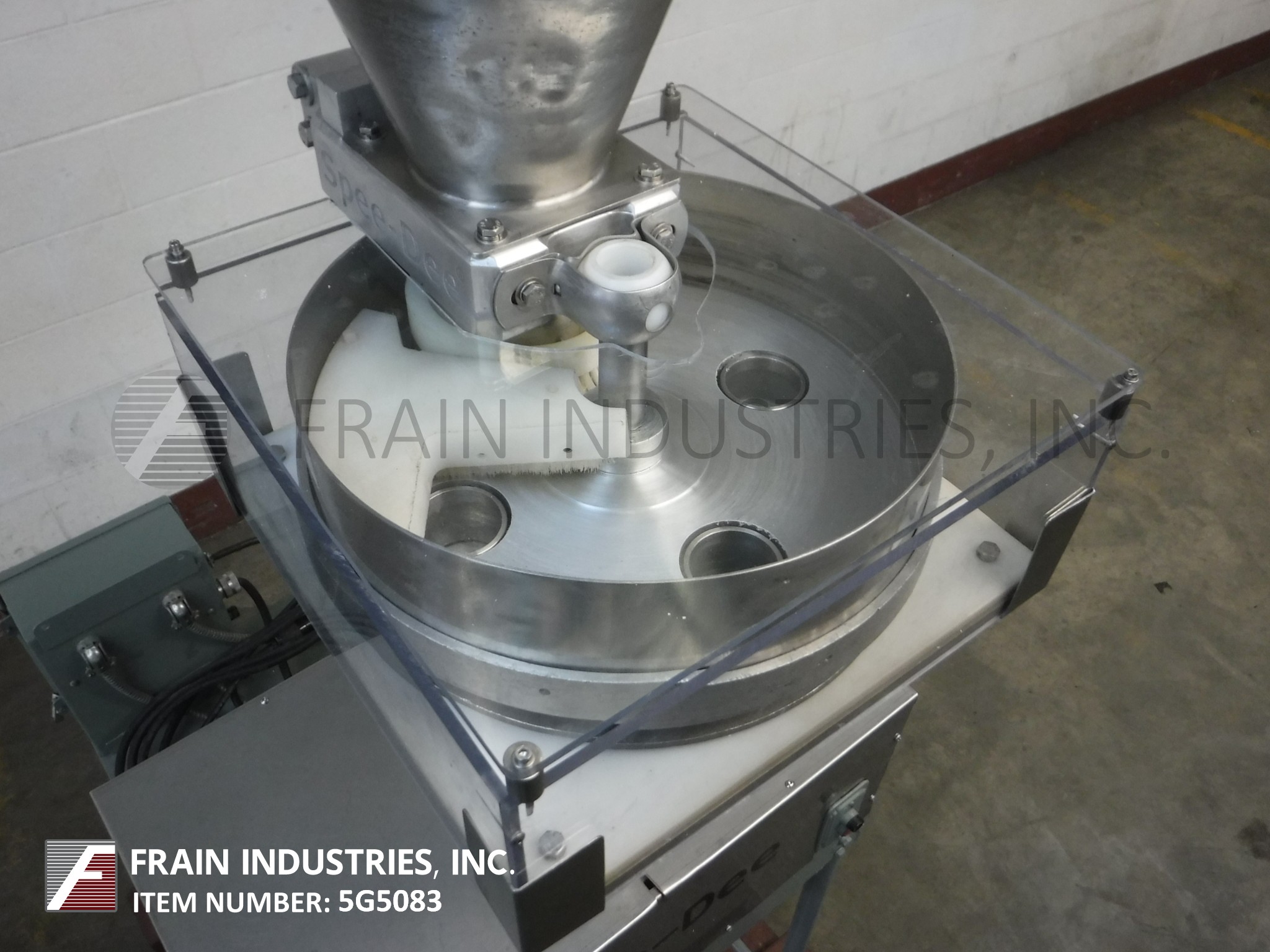 Spee Dee, CHS型,(4)袖珍不锈钢,伺服驱动,容量填料与数量的容器-取决于材料,应用和机器配置。罩杯尺寸范围:1.0"至6.0"直径;深度0.62至25"。填充范围:0.5到700立方英寸。配备20"外径x 26"深不锈钢产品料斗,16"外径板有(4)填充袋与产品水平刷,16"长产品排放溜槽与4½"外径产品开口,目前55"放电高度。控制面板有开/关电源开关,少/多音量开关,单指数和e-stop按钮。