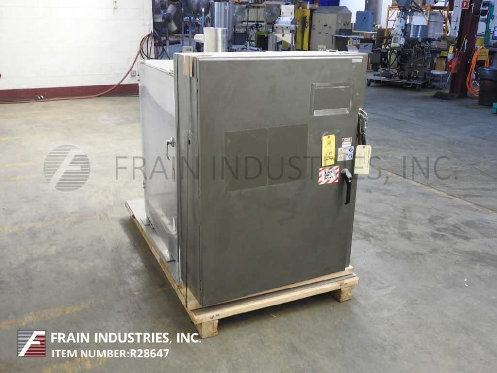 Spee Dee型号CBS系列lll,(4)口袋,不锈钢,伺服驱动,容积填料,每分钟容器数量取决于材料,应用和机器配置。杯形尺寸范围:1.0"至4.0"直径;长度为0.62"至12"。填充范围:0.5到170立方英寸。更换所需部件以适应不同的尺寸范围。配备12"外径x 16"深,1.5立方英尺不锈钢,锥形产品料斗,12"外径板有(4)4"外径填充口袋与产品水平刷和双清楚塑料螺栓下盖。11"长产品排放溜槽1/2"外径产品开口目前9"放电高度。控制面板有触摸屏控制和数字读数的PLC控制器,还有一个手持控制器,带有开关电源和体积少/多开关,单指数和e-stop按钮。安装在不锈钢底座平台上。