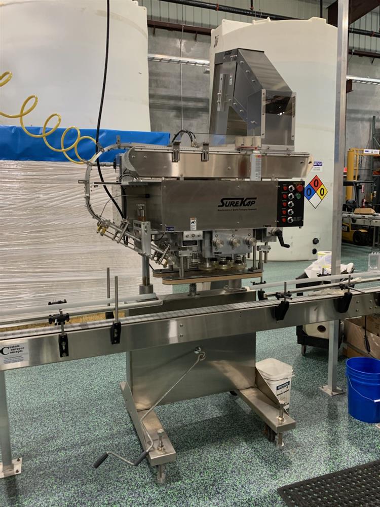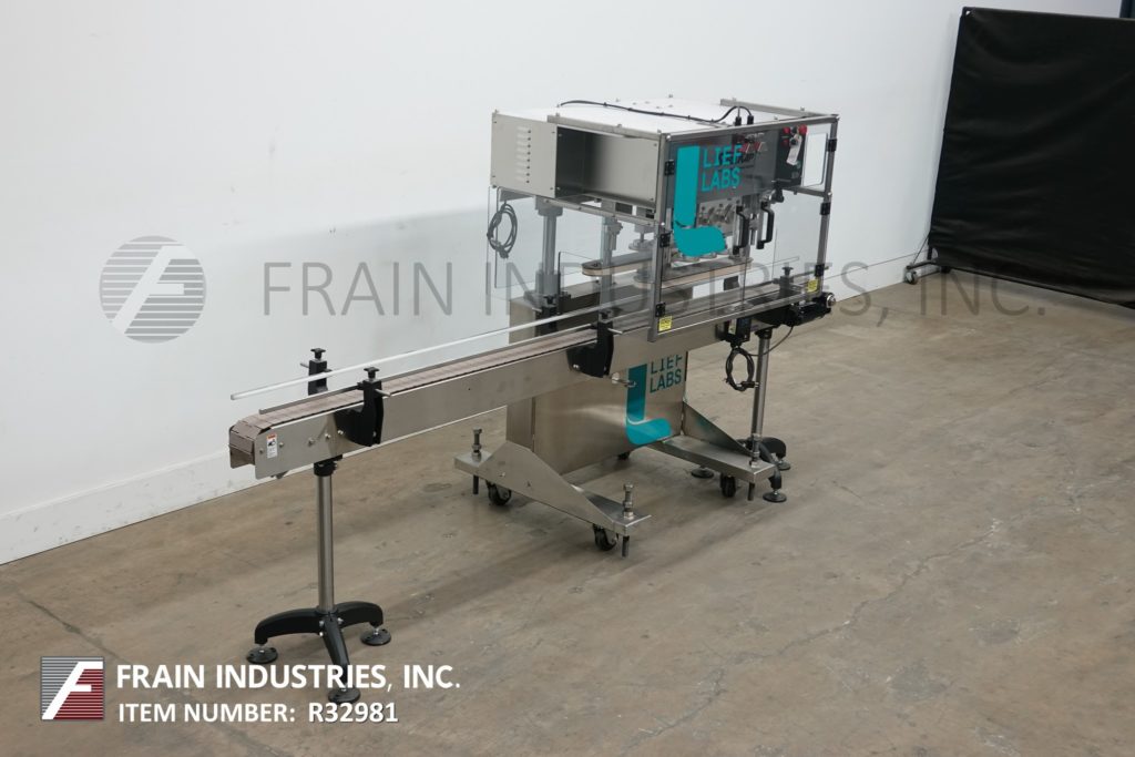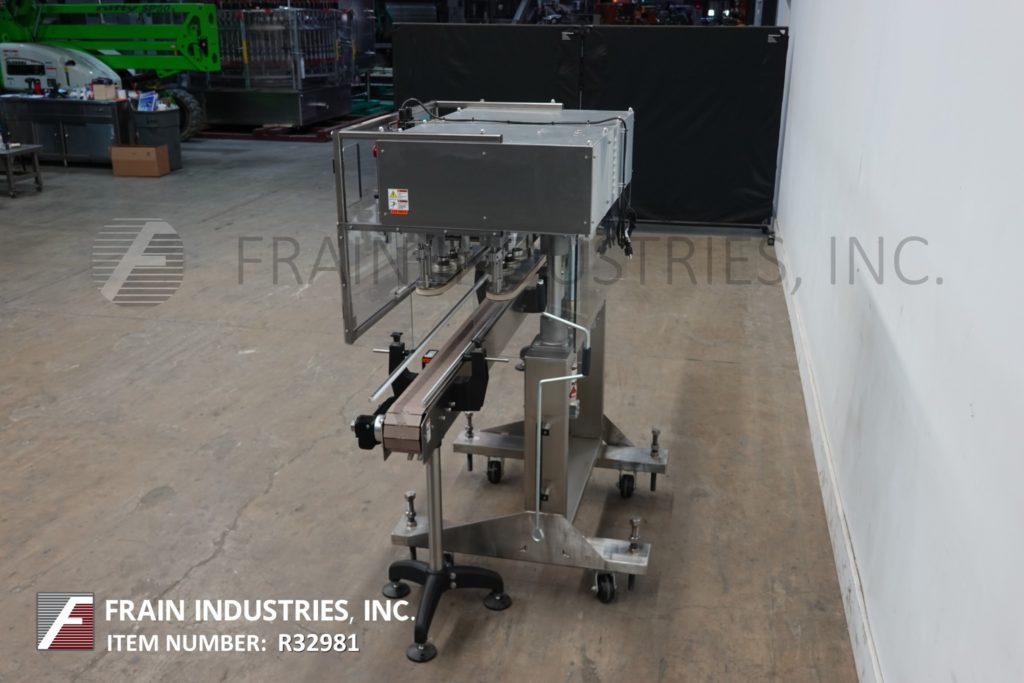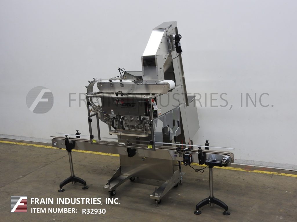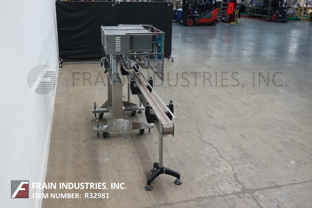 Surekap Model SK6000 BF6-70,自动,内联,不锈钢,3站,6个主轴滚动输送带和盖子进纸器,每分钟的容器数量 - 取决于材料,以及应用盖尺寸范围:22mm至70mm。配备88英寸长x 4-1 / 2“宽不锈钢集装箱输送机,21”长x 25“宽x 18”深(4英尺)盖帽料斗,77“长x 6”宽电梯,有2½“高夹板6“中心,46”长x5½“宽盖送/分拣带,可调节盖滑槽,带24”长x 1“宽单个容器夹具带,(3)手曲柄可调节主轴站最后用离子控制。控制面板有主轴和夹具控制拨号,开始和e-stop按钮。安装在带脚轮的重型不锈钢框架上。