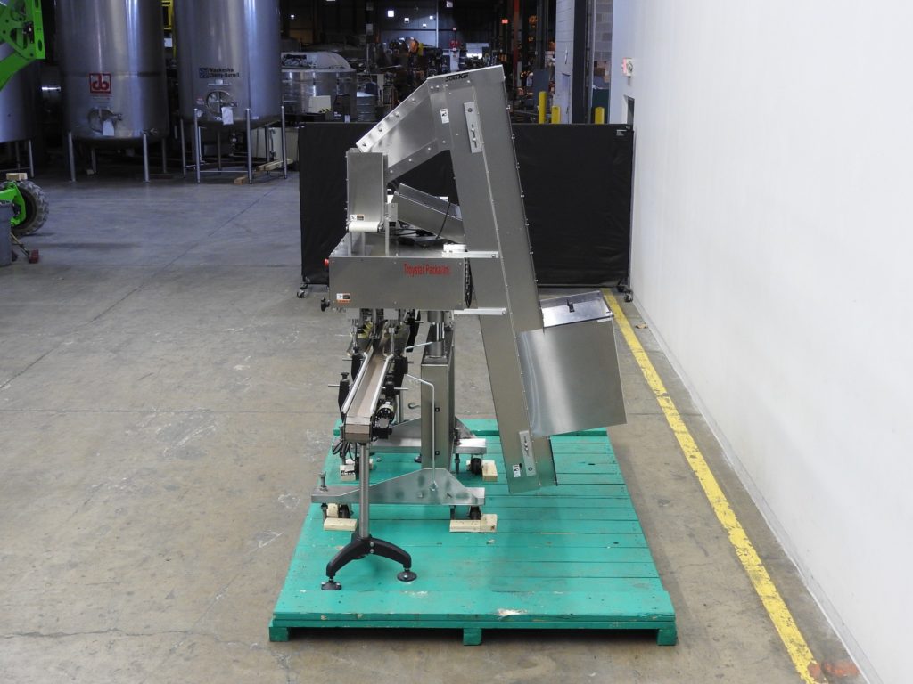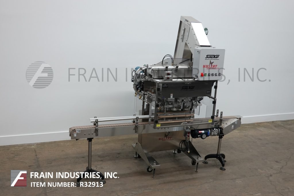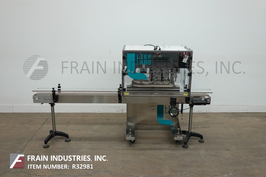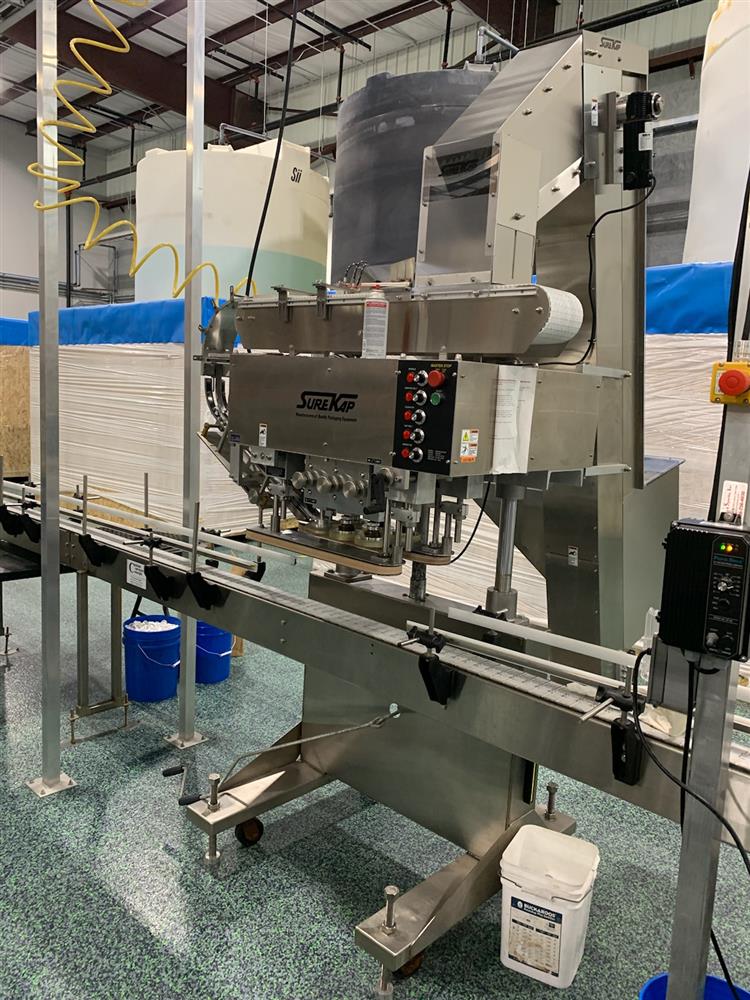 Surekap Model SK6000 BF6-70,自动,内联,不锈钢,3站,6个主轴滚动输送带和盖子进纸器,每分钟的容器数量 - 取决于材料,以及应用盖尺寸范围:22mm至70mm。配备88英寸长x 4-1 / 2“宽不锈钢集装箱输送机,21”长x 25“宽x 18”深(4英尺)盖帽料斗,77“长x 6”宽电梯,有2½“高夹板6“中心,46”长x5½“宽盖送/分拣带,可调节盖滑槽,带24”长x 1“宽单个容器夹具带,(3)手曲柄可调节主轴站最后用离子控制。控制面板有主轴和夹具控制拨号,开始和e-stop按钮。安装在带脚轮的重型不锈钢框架上。
