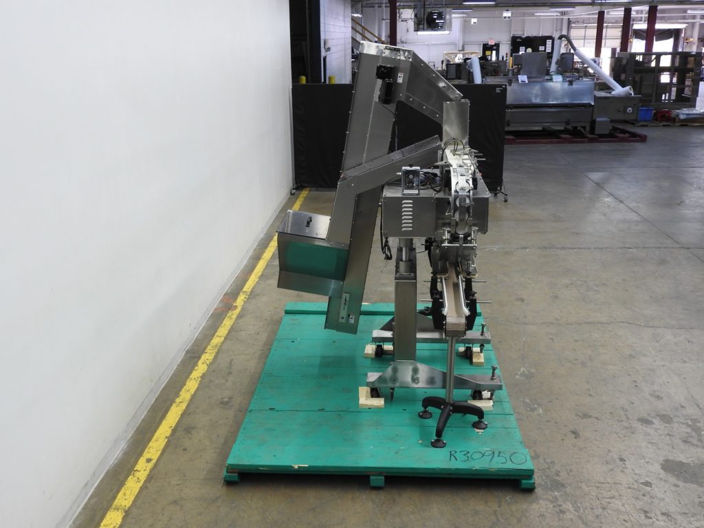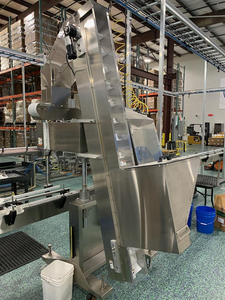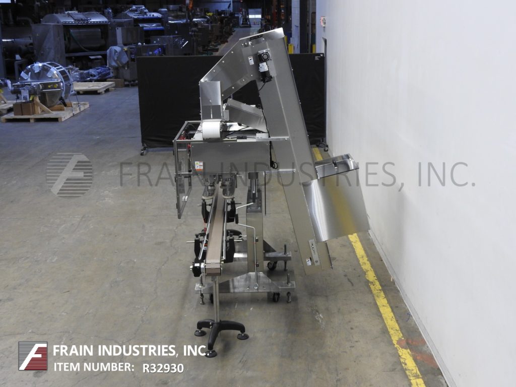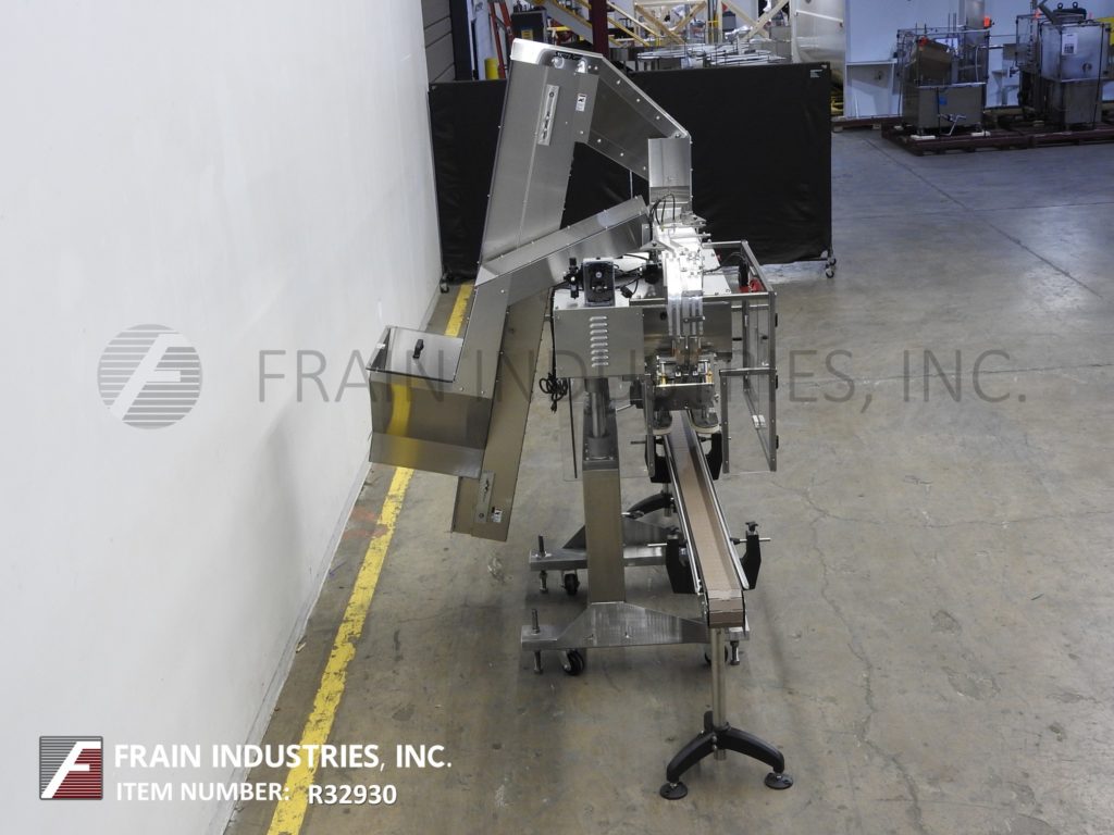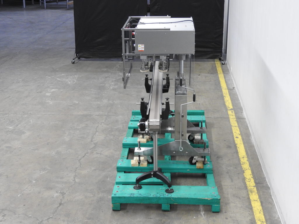 SureKap型号SK6000 BF6-70,自动,内联,不锈钢,3站,6轴辊过输送机盖和盖给料机,每分钟容器数量取决于材料和应用盖尺寸范围:22mm至70mm。配备120“长x 4 1/2“宽不锈钢容器输送机,21”长x 25“宽x 18”深(4英尺³)盖料斗、77”长x 6“宽电梯2½”高防滑钉6”中心,46“长x 5½“宽帽喂养/排序带,可调节帽斜槽,24”长x 1”宽单容器爪腰带,(3)手动曲柄可调(6)主轴工位(2)套机械离合器增加扭矩控制。控制面板与主轴和夹具控制刻度盘,启动和e-stop按钮。安装在重型不锈钢框架与脚轮。
