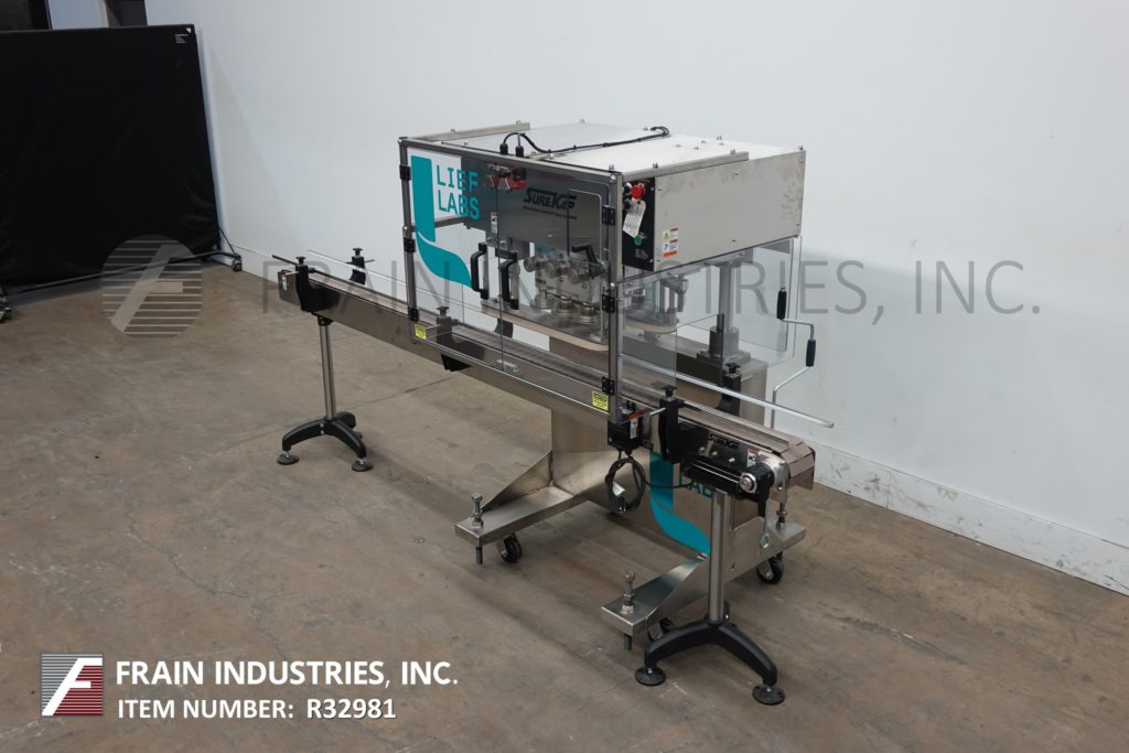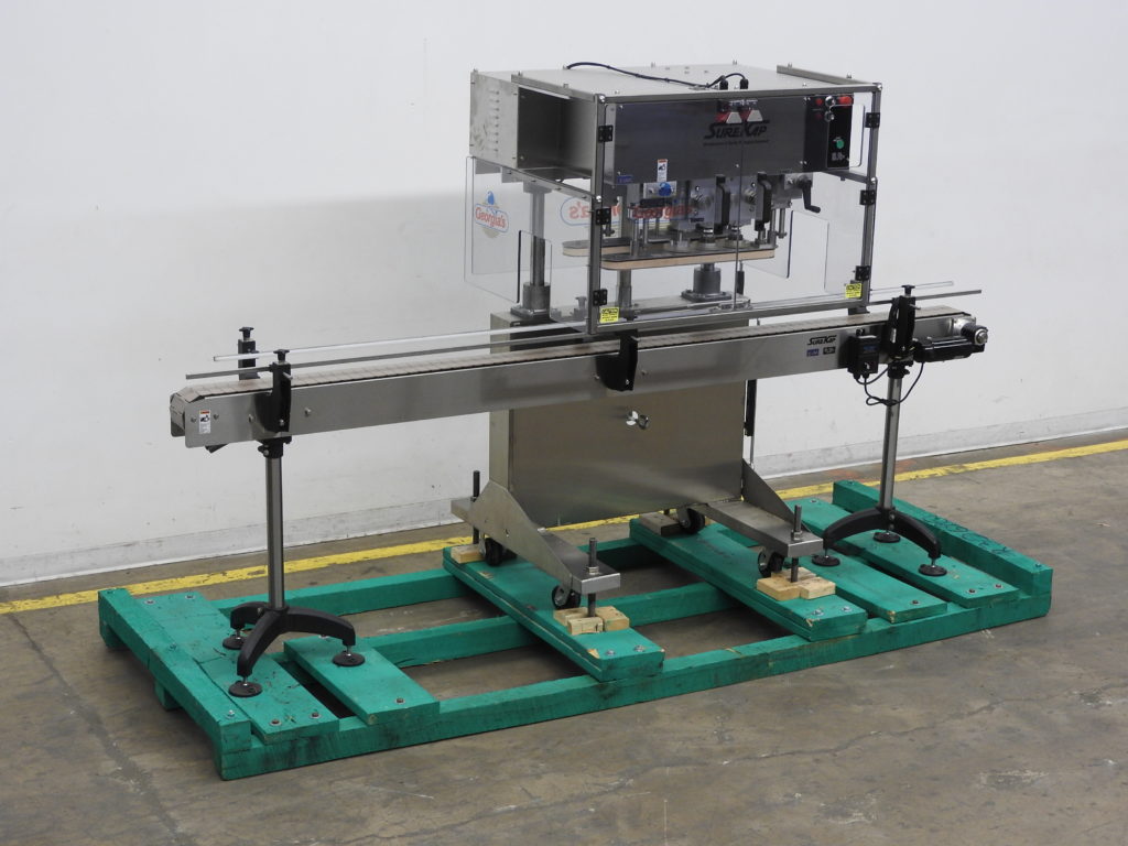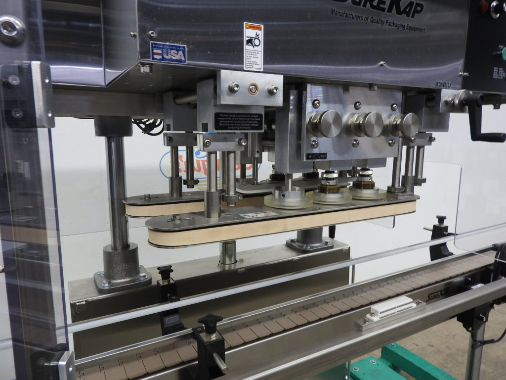 SureKap型号SK600,半自动,内联,不锈钢,3工位,6主轴帽拧紧和重新扭转机,输送带额定为每分钟10至90个容器-取决于材料,应用和操作熟练度。瓶盖尺寸范围:直径8毫米至110毫米。配备120"长x 4-1/2"宽不锈钢容器输送机,24"长x 1"宽单容器夹持带,(3)手曲柄可调主轴站(2)套离合器。控制面板与主轴和夹具控制刻度盘,启动和e-stop按钮。安装在重型不锈钢“C”基础框架与脚轮和调平腿。