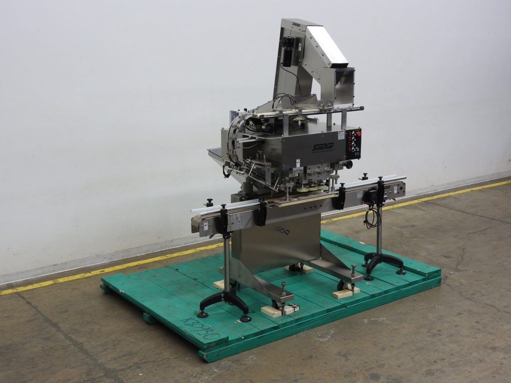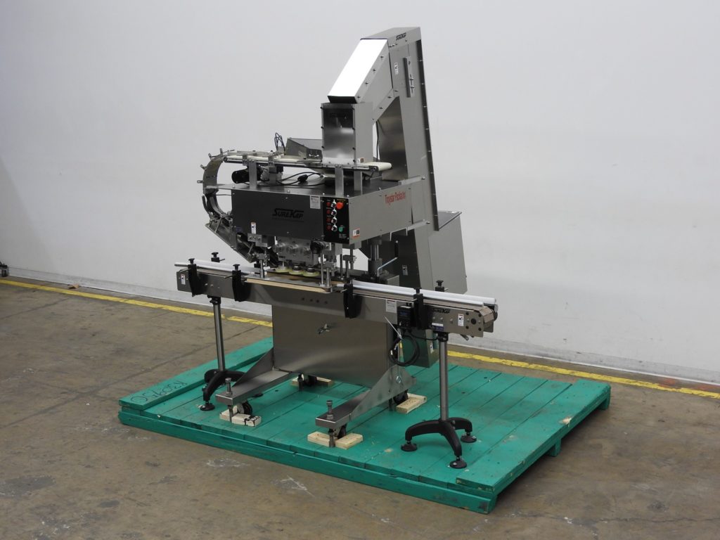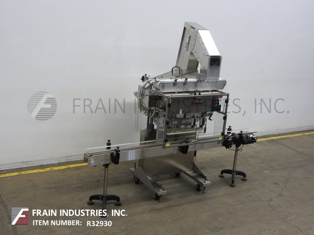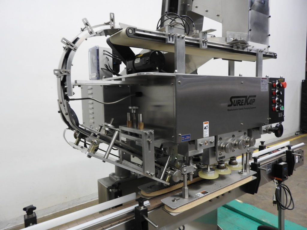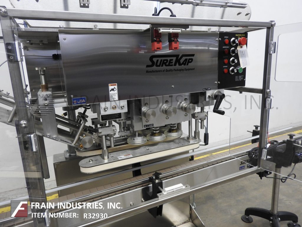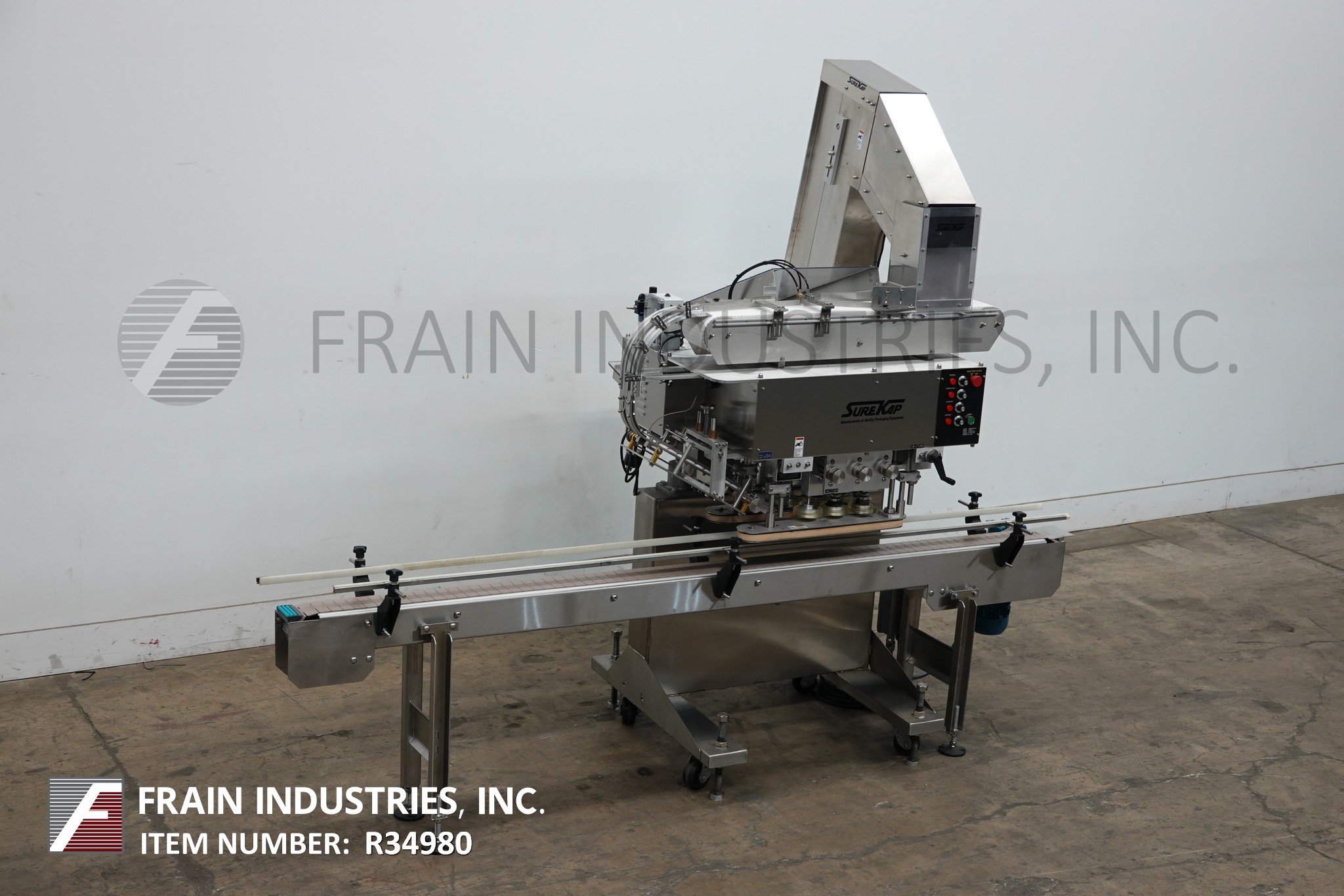 Surekap Model SK6000 BF6-70,自动,内联,不锈钢,3站,6个主轴滚动输送带和盖子进纸器,每分钟的容器数量 - 取决于材料,以及应用盖尺寸范围:22mm至70mm。配备120“长x 4 1/2“宽不锈钢容器输送机,21”长x 25“宽x 18”深(4英尺³)盖料斗、77”长x 6“宽电梯2½”高防滑钉6”中心,46“长x 5½“宽帽喂养/排序带,可调节帽斜槽,24”长x 1”宽单容器爪腰带,(3) hand crank adjustable spindle stations the last with clutche control. Control panel with spindle and gripper control dials, start and e-stop buttons. Mounted on heavy duty stainless steel frame with casters.