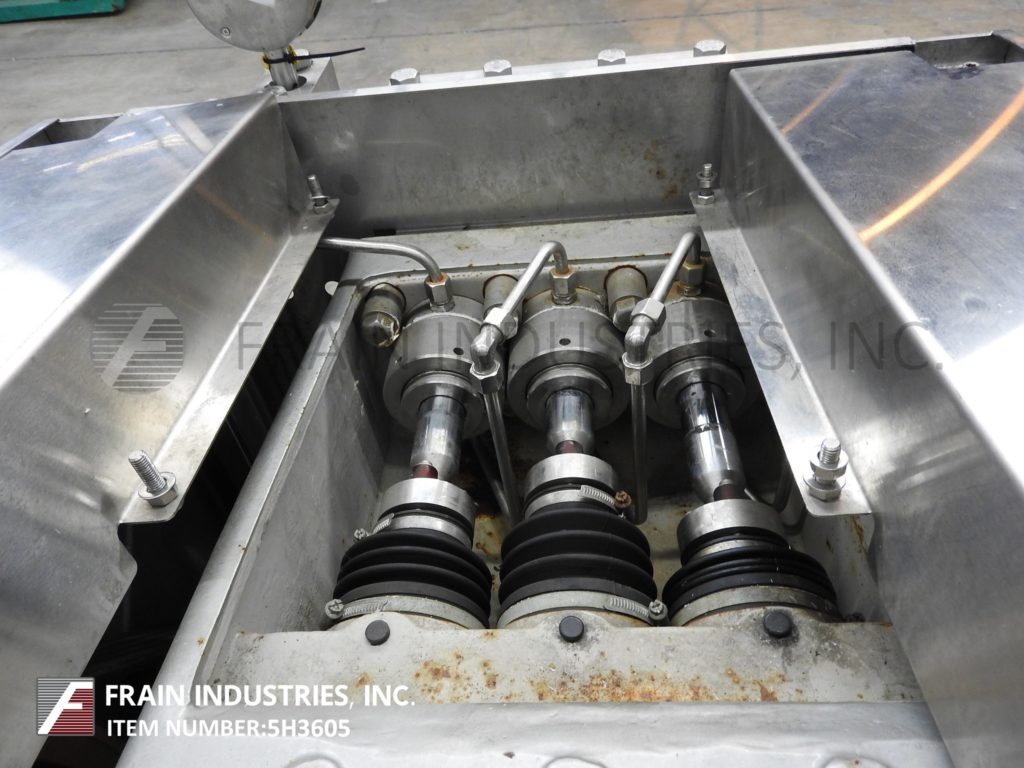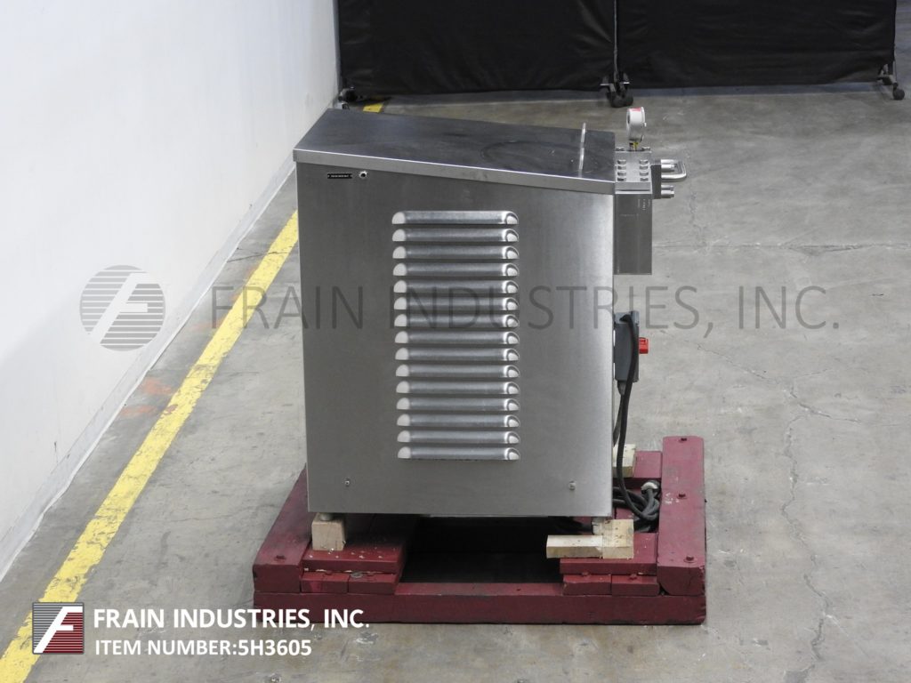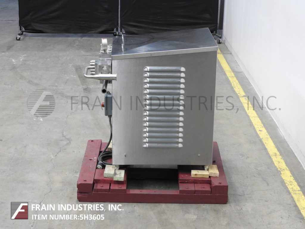 Alfa Laval Model TAS15, stainless steel (2) stage, homogenizer. Rated output up to 40 gallons per hour – depending on materials, application and machine configuration. Maximum operating pressure up to 70 bar or 1015 psi. Equipped with (3) ball valve cylinders with valve housing and plungers (2) stage valve and stage hydraulic homogenizing valve actuator assembly. 2-1/2" OD / 2" ID sanitary Tri-clamp charge port and 2" OD / 1-1/2" ID sanitary Tri-clamp style discharge port. Start, stop and e-stop push button controls with pressure gauge up to 400 bar or 6000psi. Mounted on stainless steel cabinet style base frame.