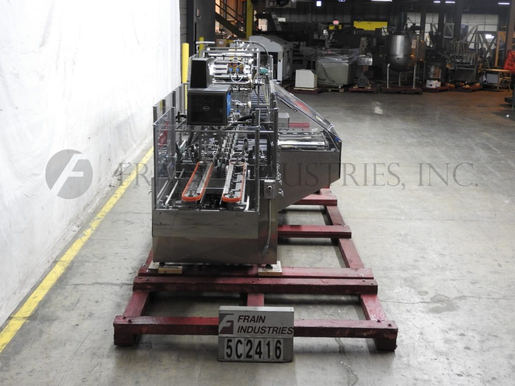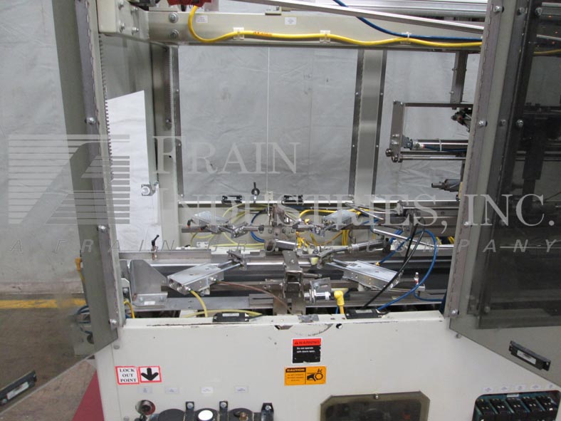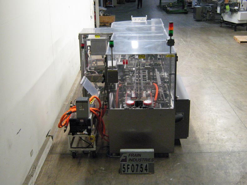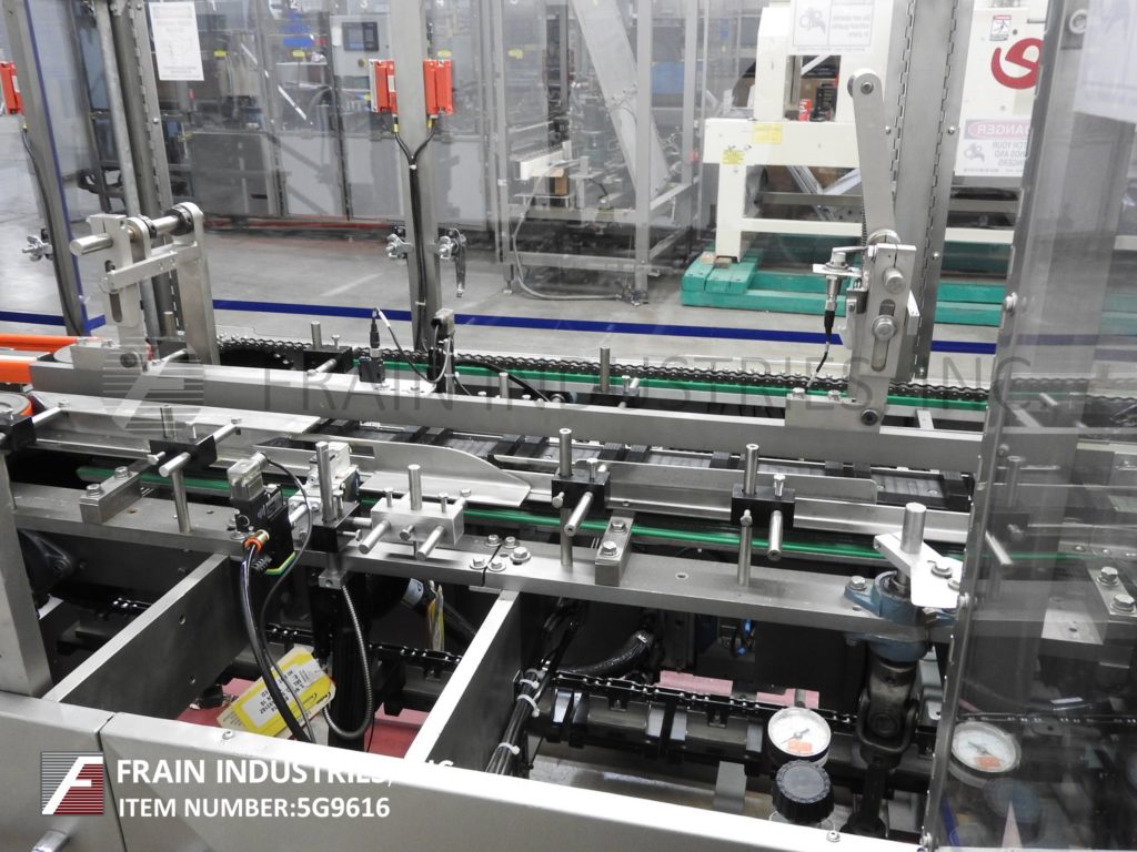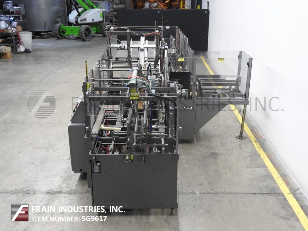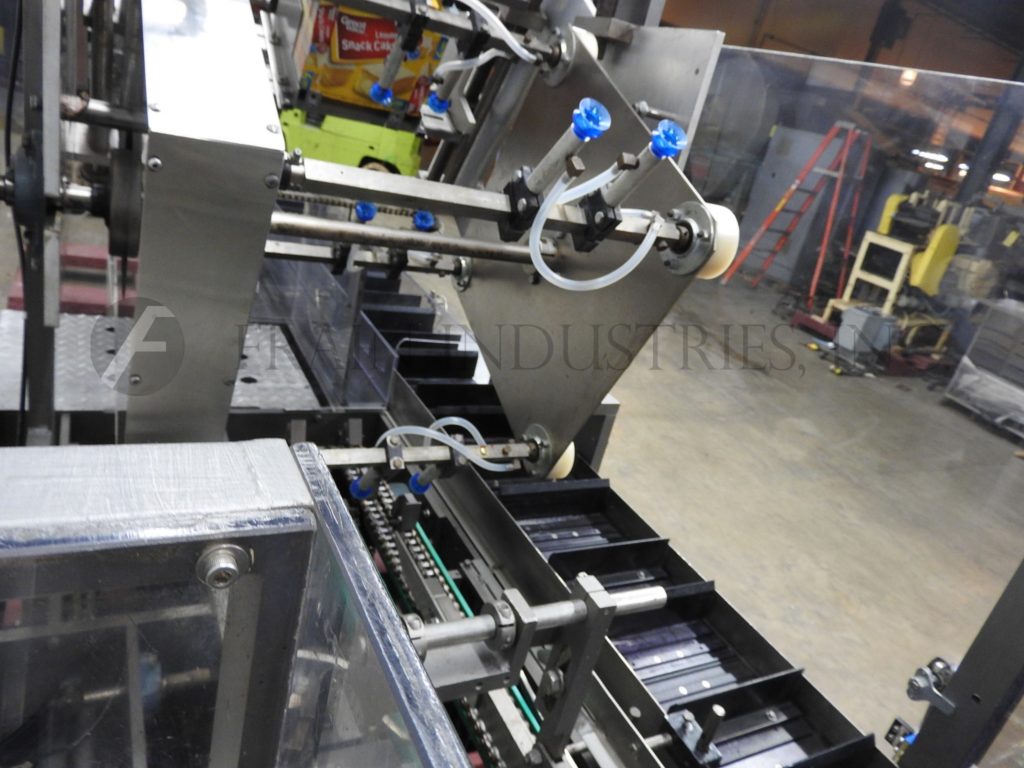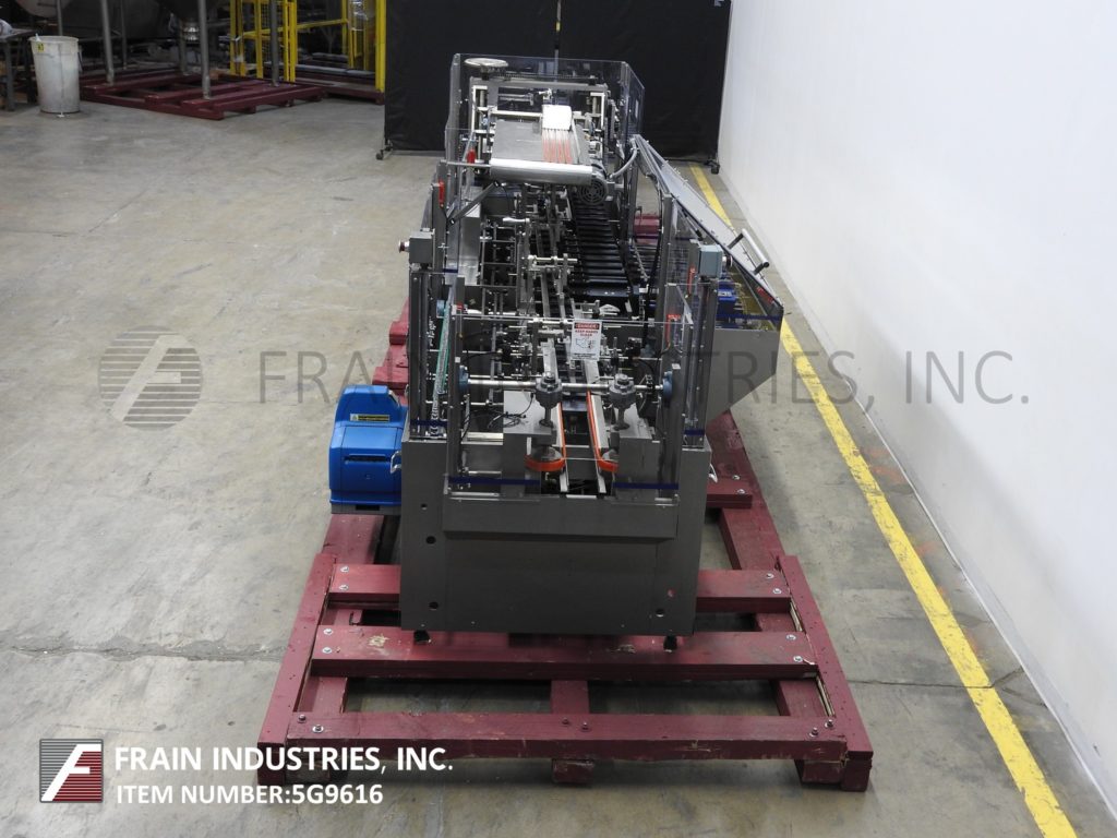 根据材料和应用,自动连续运动箱的速度能够从40到150 CPM - 速度。Has a 15’L bucket in feed conveyor on 11" centers. Carton size range: (Length) 1" to 9"; (Width) 1/2" to 4"; (Depth) 5.25" to 9". Equipped with 8′ powered carton magazine, 4-head rotary pick-n-place, hot melt glue system, carton top hold down, PLC, PLS electrocam, no carton – no product, no product – no carton, compression discharge, Lexan interlock guarding, fixed bucket single chain in feed, 6-place barrel cam product load and NEMA 12 electrical enclosures.