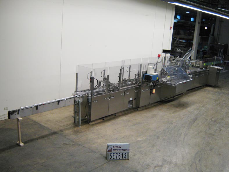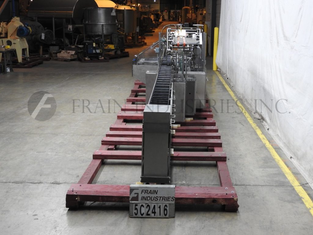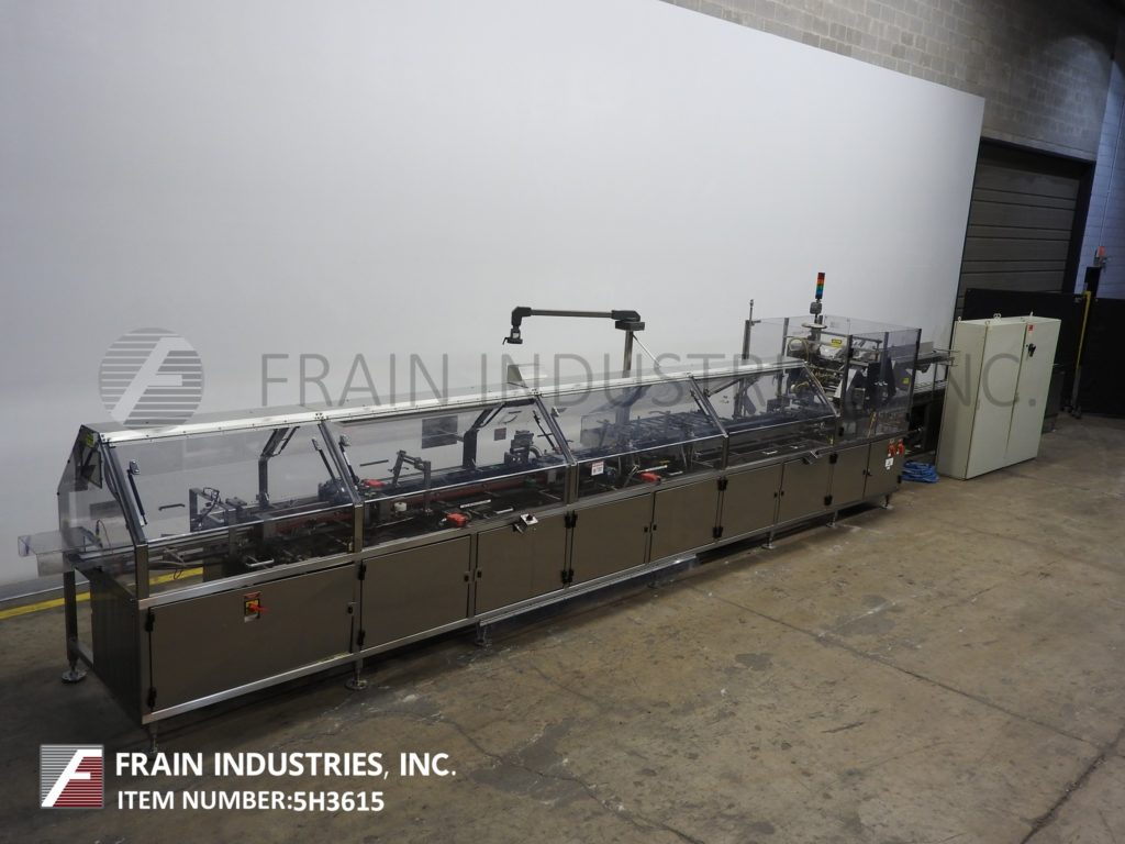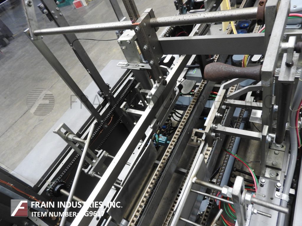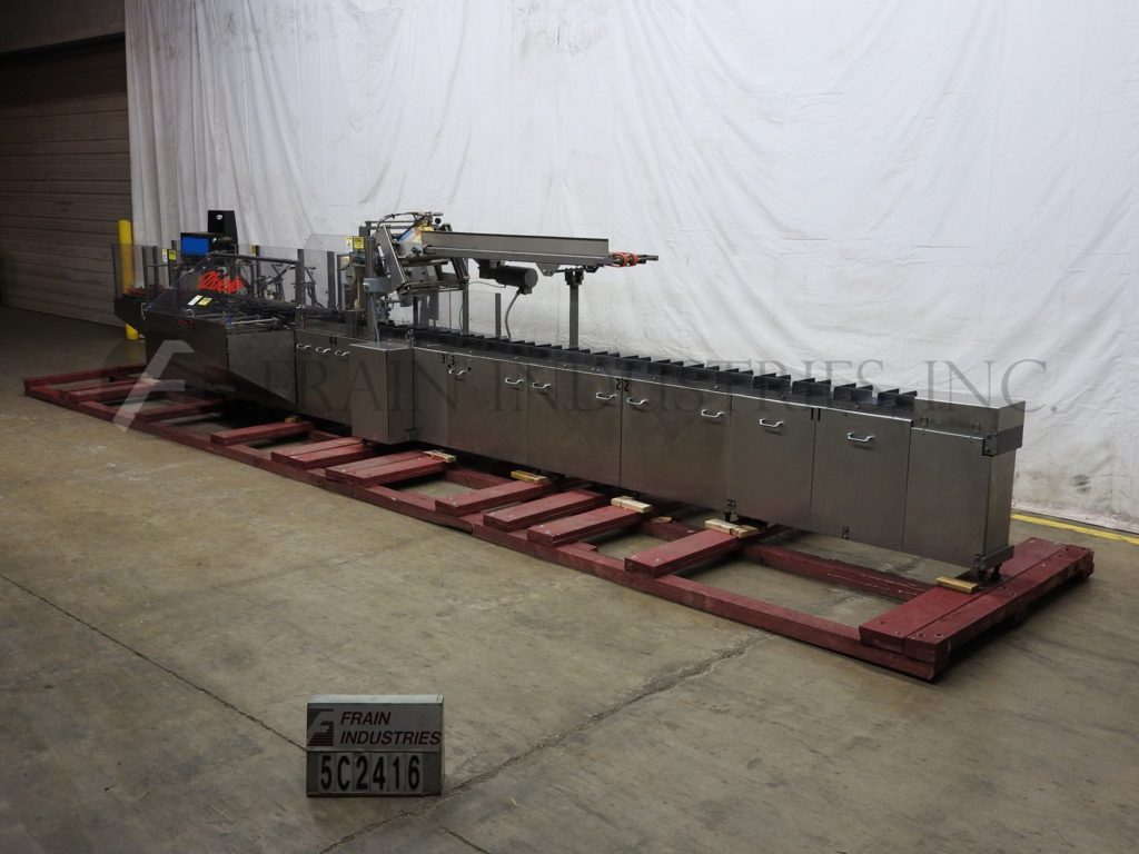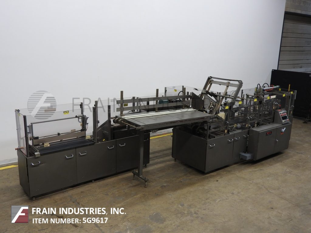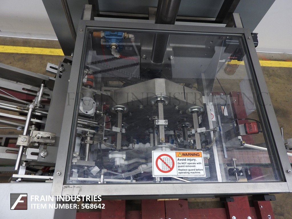 根据材料和应用,自动连续运动箱的速度能够从40到150 CPM - 速度。Has a 15’L bucket in feed conveyor on 11" centers. Carton size range: (Length) 1" to 9"; (Width) 1/2" to 4"; (Depth) 5.25" to 9". Equipped with 8′ powered carton magazine, 4-head rotary pick-n-place, hot melt glue system, carton top hold down, PLC, PLS electrocam, no carton – no product, no product – no carton, compression discharge, Lexan interlock guarding, fixed bucket single chain in feed, 6-place barrel cam product load and NEMA 12 electrical enclosures.