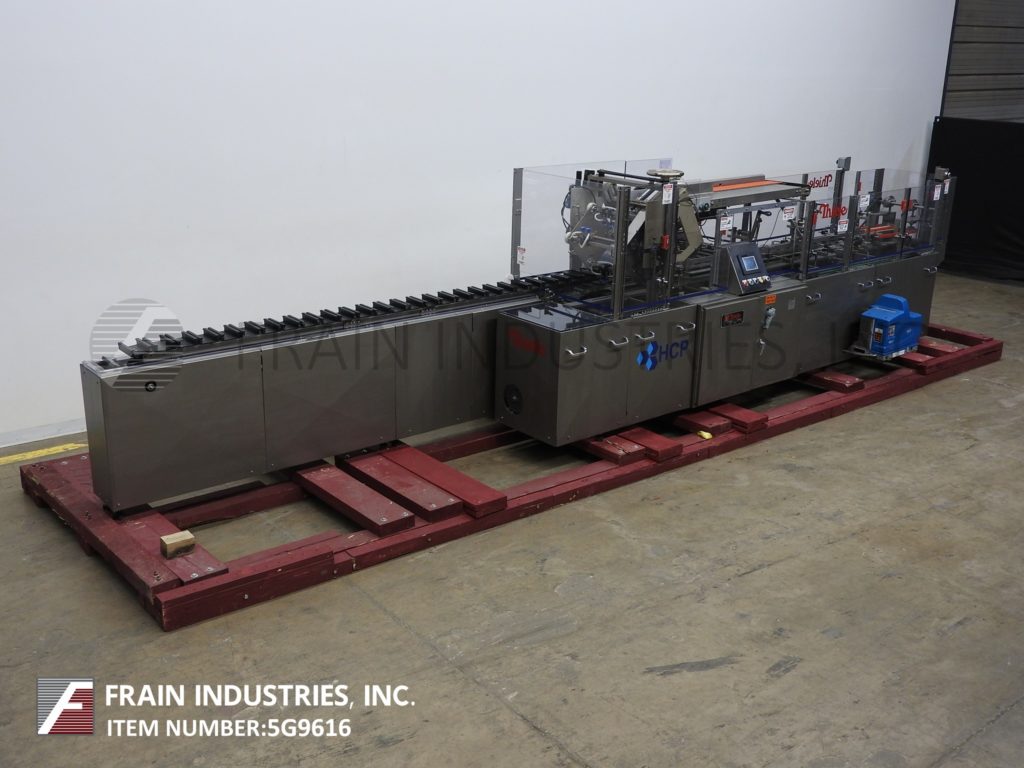 蒂勒60型,自动,连续运动,水平,H/M型胶盒机,额定每分钟80至200箱-取决于材料和应用。1链单元设置在3"中心有1-1/2"长x 1-1/2"宽x 2-1/4"深固定桶,144"长x 5"宽饲料输送机与空白纸箱杂志,(4)头旋转picn -place,桶形凸轮装载机与产品漏斗,诺德森(2)枪H/M胶系统,星轮卸料,双40"长x 1"高侧带压缩和卸料输送机部分。控制面板采用PLC控制器,具有面板视图和数字显示,启动/停止,无产品/无纸箱和低空白传感器,e-stop。安装在重型基础框架与联锁安全防护。