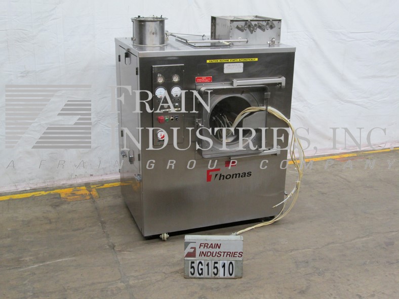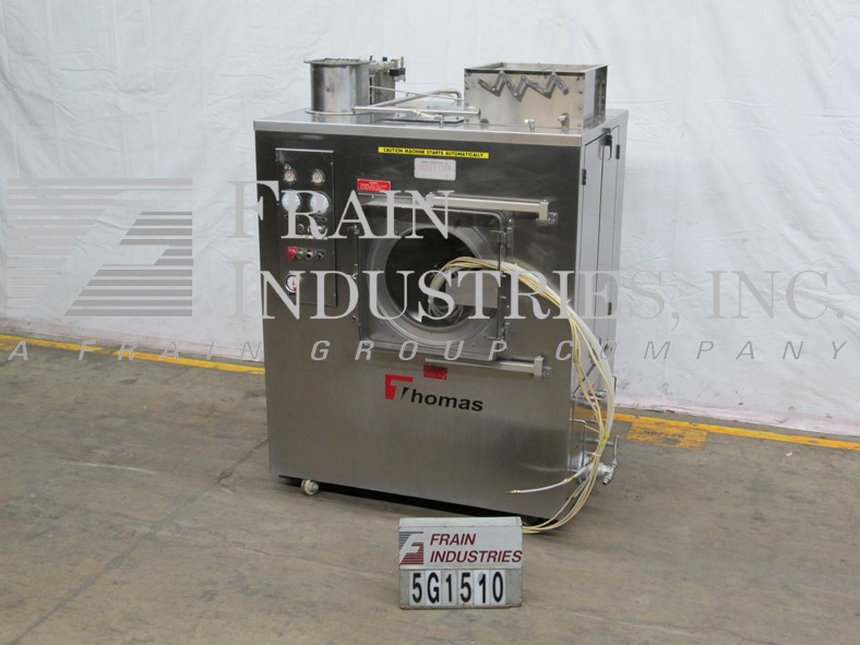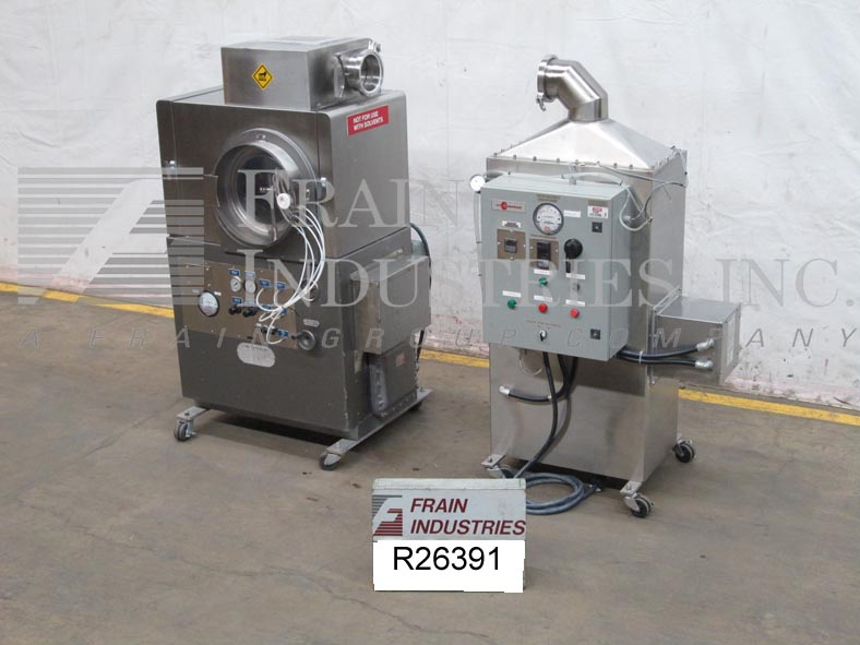 托马斯工程模型24-ACC Accela-Cota不锈钢涂料锅。Equipped with 24" perforated pan with soft flights. O’Hara spray system with two atomizing air guns, separate HEPA filter and heating module, high voltage panel, explosion proof manual starter. Variable speed drive, 8- 30 liter brim volume, pan and drive unit Mounted on stainless steel housing with lockable swivel casters.