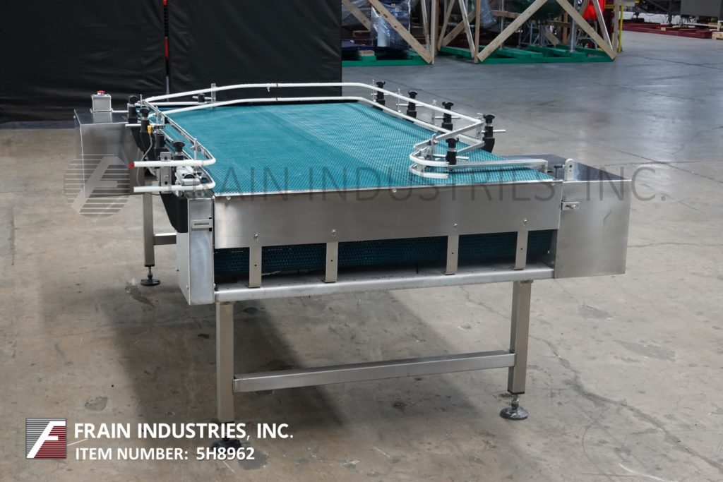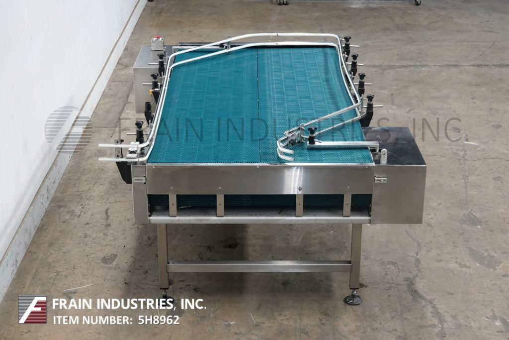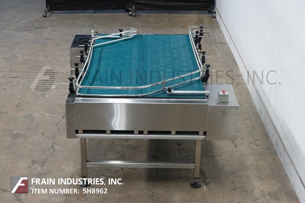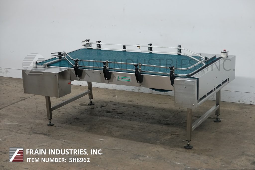 Trio Pac公司,48"宽x 92"长,不锈钢双向离线堆积台,每小时容器数量-取决于材料和应用。配备(2)24“宽x 92”长的皮带,可调节导轨和34“到38”的饲料和排放高度范围。安装在(4)支腿不锈钢框架上。