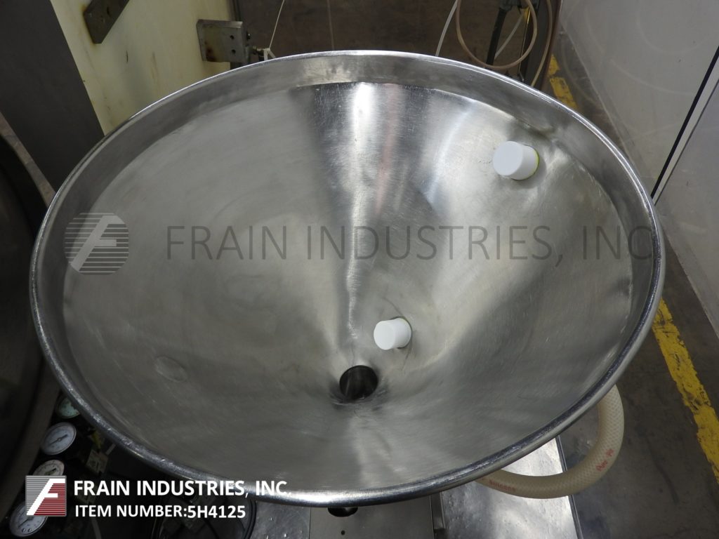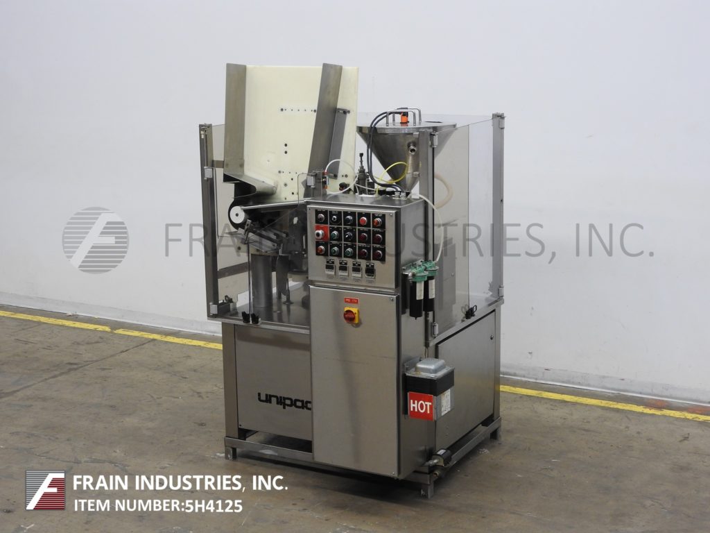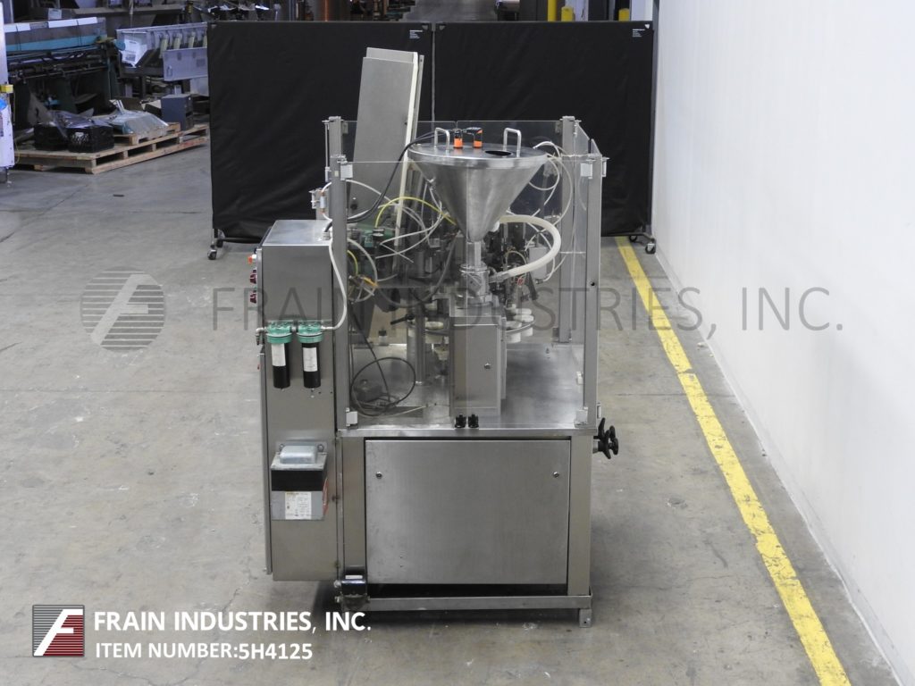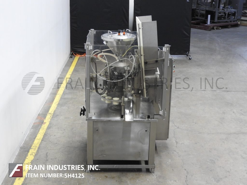 UNIPAC,型号银100,自动,热空气,塑料或层压管填料和封口机。每分钟10至40个管 - 取决于材料,应用和机器配置。管尺寸范围:直径10mm至50毫米;高度为50毫米至250毫米。填充范围范围:3ml至230ml,每个应用程序所需的适当更改部件。配备管杂志,管压缩机,空气冲洗,18“ID X 20”深夹套不锈钢产品料斗随着搅拌和水平检测,16个口袋旋转炮塔,注册,底上填充,无管/无填充,热空气密封系统具有浮雕编码器,装饰站和联锁安全防护。控制面板有按钮开始/停止和数字温度控制。取向器开/关开关,无产品,产品水平,搅拌,管清洗,鼓风机和加热器。安装在重型基础框架上。