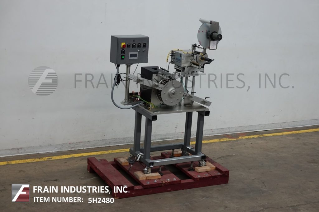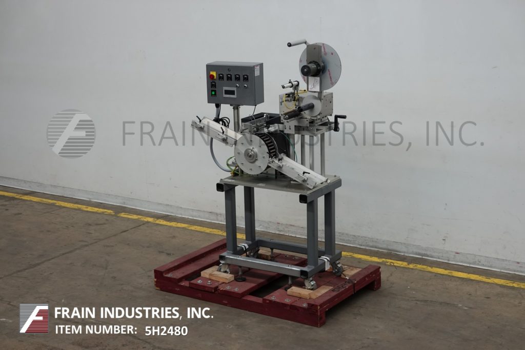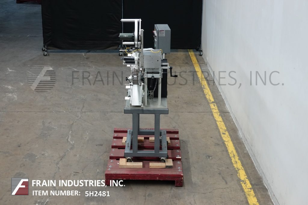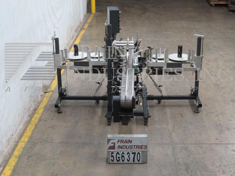 通用型号CP2000,高速,步进驱动,前,后和包装压力敏感标签额定从0到3000"每分钟,与容器的数量-取决于材料,应用和机器配置。标签尺寸范围:宽度可达6-3/8”。配备120"长7-1/2"宽的产品输送机,36"长1"宽的顶下,20"长3"宽的包装站,双型号SL2000标签头和7"高剥离板。控制面板有触摸板和读出,主要的开/关开关,e-stop,输送机速度控制。安装在重型基础框架与脚轮和水平腿。标签卷容量可达16“直径3”外径芯。
