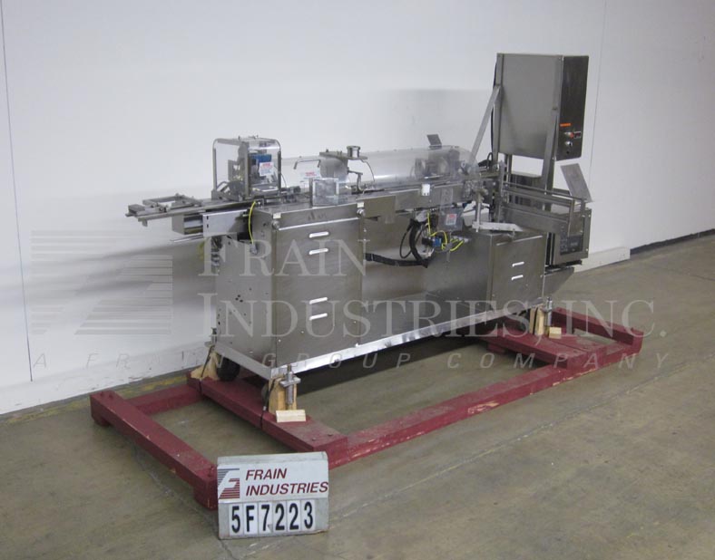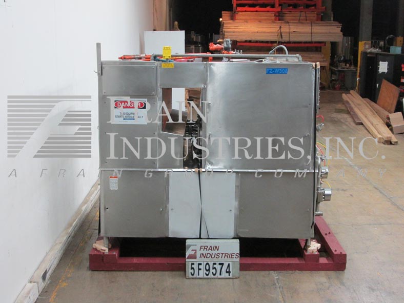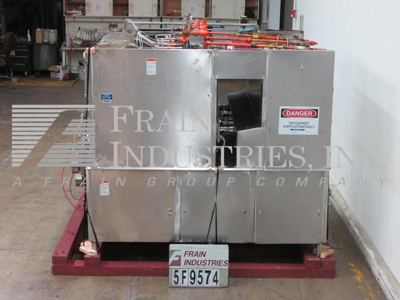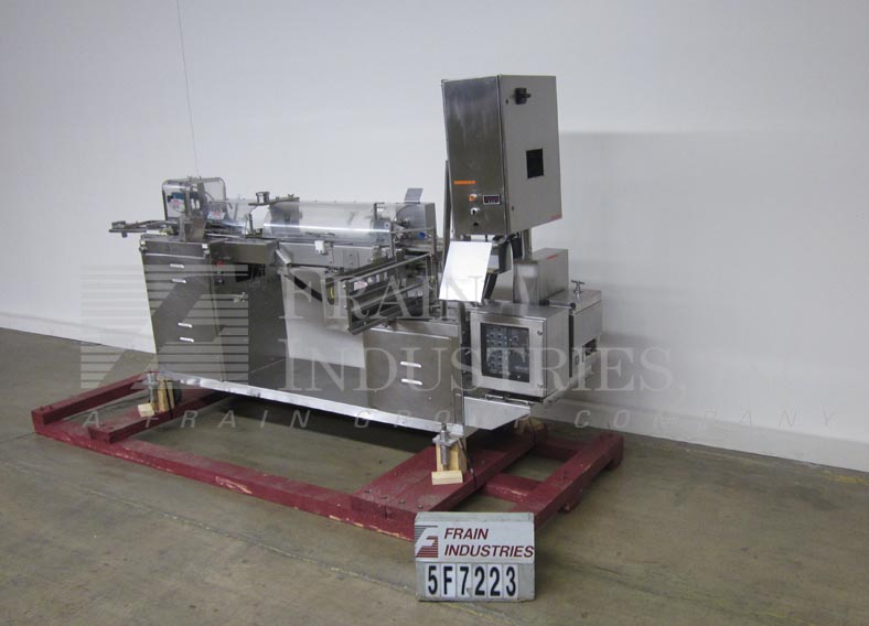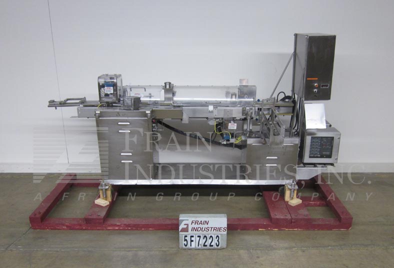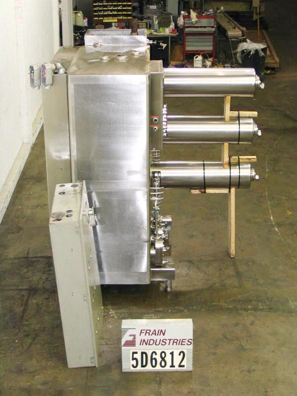 APV Anderson / WCB,型号588,不锈钢,矩形冰淇淋纸盒填料和热熔胶末端封口机,每分钟5到70辆纸箱 - 取决于材料和应用。不锈钢,卫生3-A结构通常用于1升,2升和半加仑容器。配备空白纸箱杂志,吸盘式PIC N放置带纸箱平方,往复式的纸箱推动刀片,挡板闭合到容积的“微速”填充系统,该系统与输出冰淇淋冷冻机同步,容器用作测量装置。不锈钢被封装Nordson 2枪热熔胶系统。控制面板具有A / B控制器并翻转安全保护。安装在不锈钢底座上。