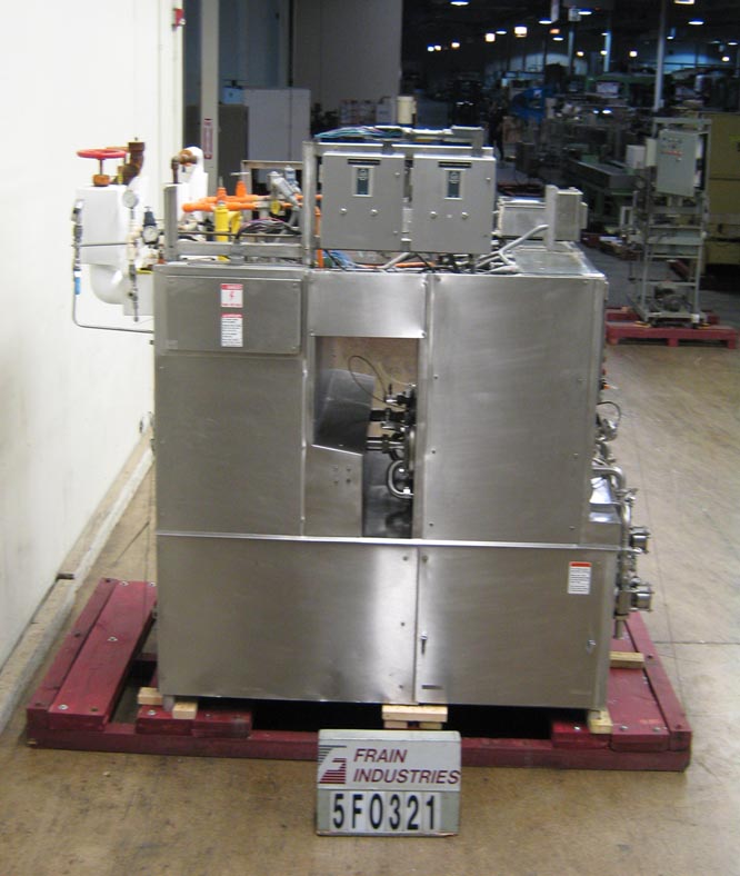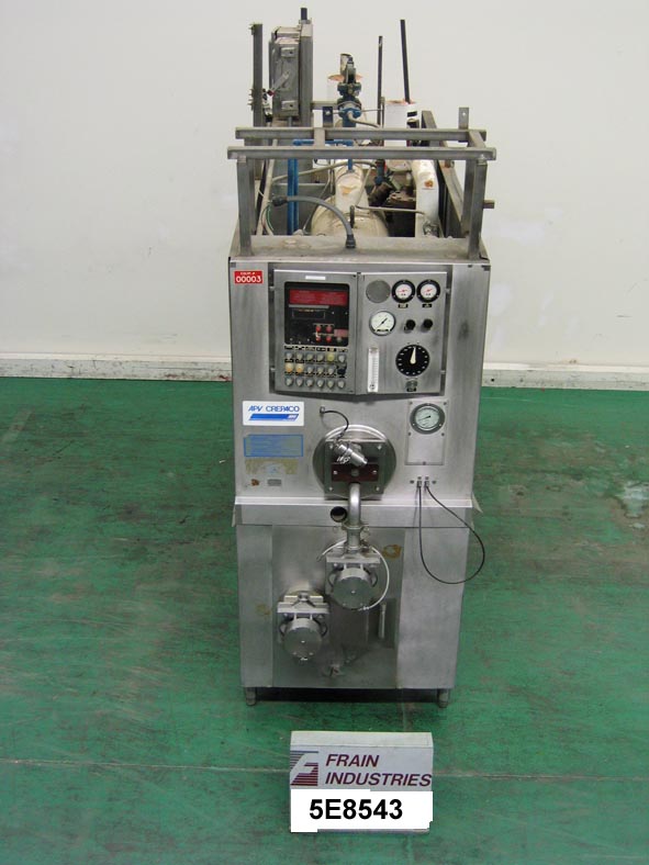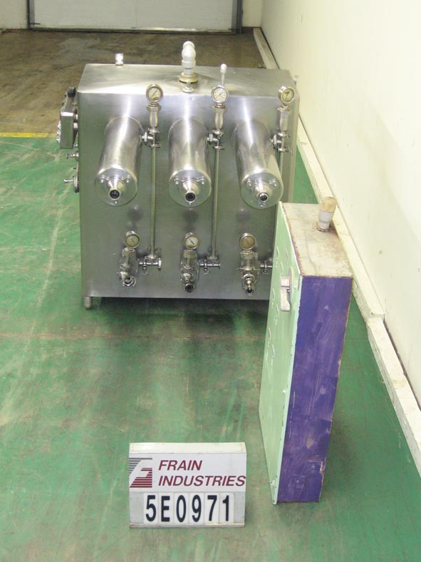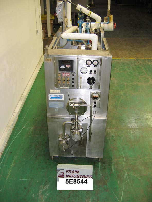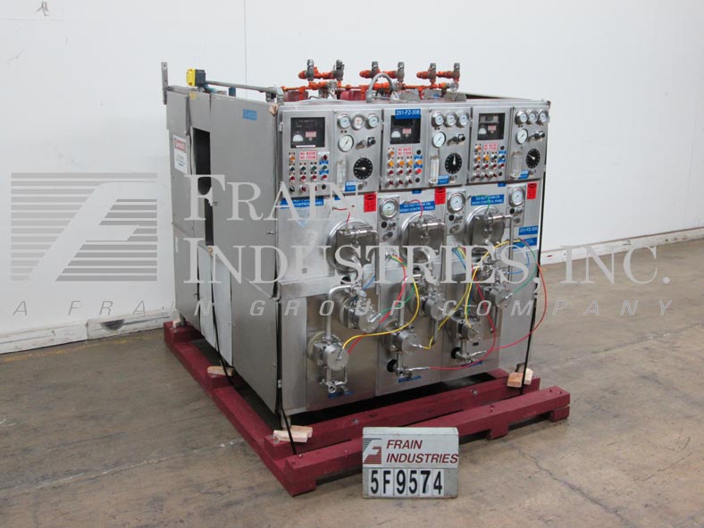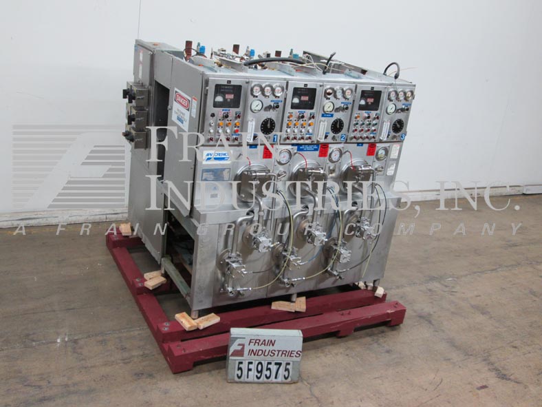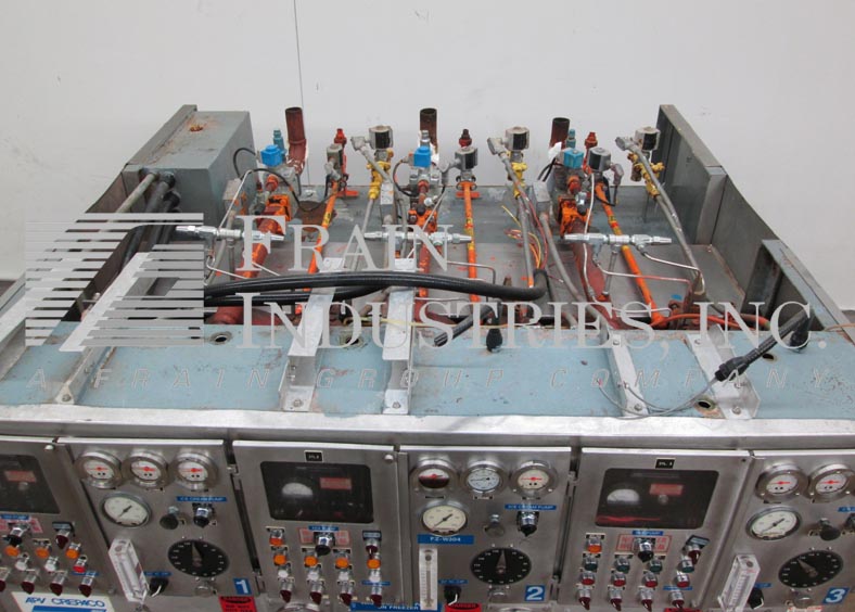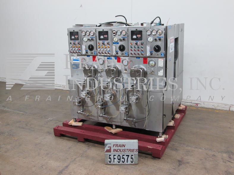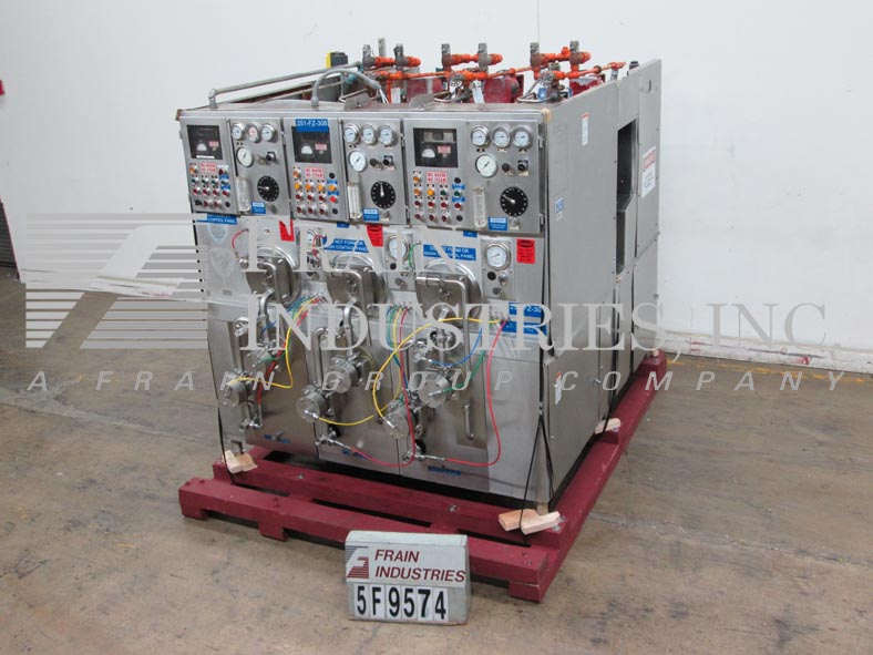 APV Crepaco / WCB W308G型,连续,3桶混合空气,不锈钢,冰淇淋冷冻机,额定从60至600加仑混合和120至1200冰淇淋容量超过运行每小时开放的dashers -取决于材料和应用。配备(3)12“OD x 40”长产品管,与空气混合(3)和(3)混合模型F-AR 2 Hp扶轮泵1 - 1/2“OD卫生横向进给/卸货港口,开/关泵按钮(3)飞镖泵控制器(3)雅典娜压力表,制冷剂300加仑每小时氨、快速关闭阀门,带有20马力马达的温度和压力表。安装在不锈钢框架上。