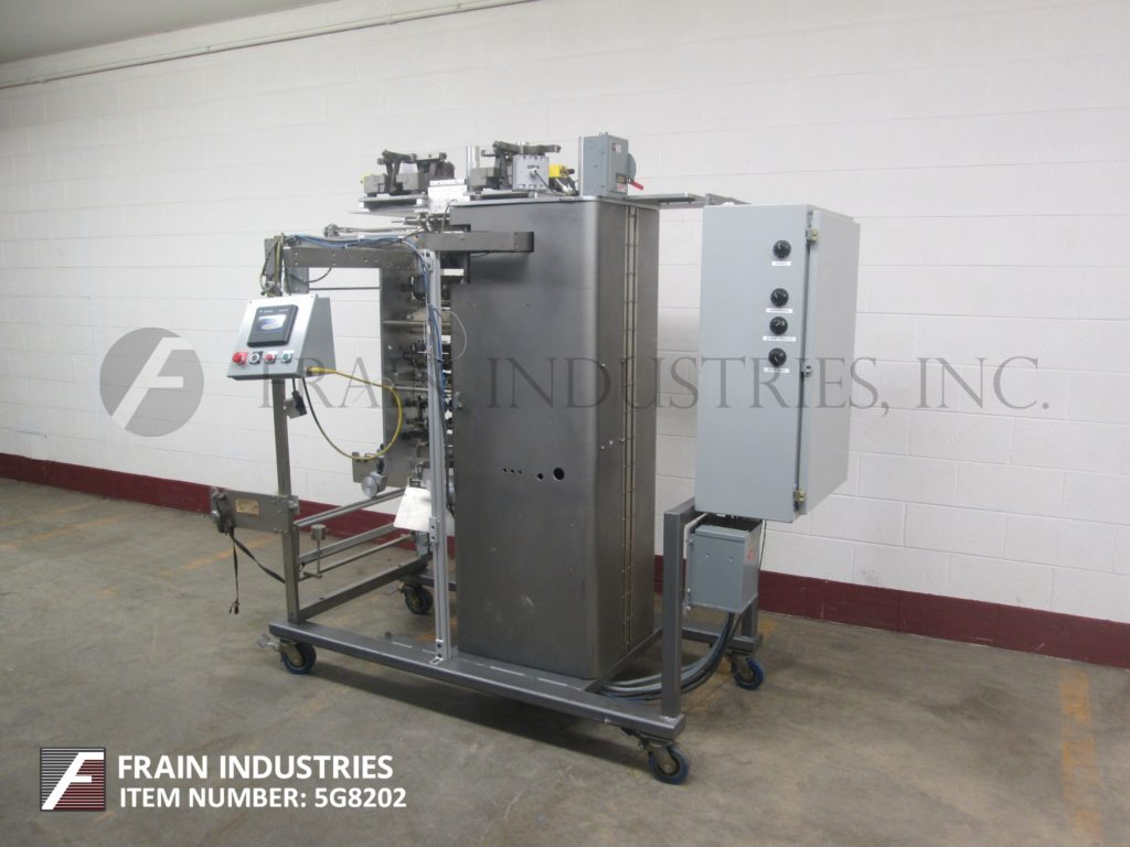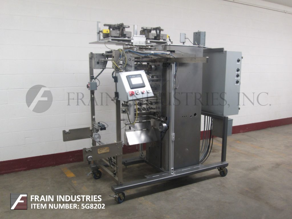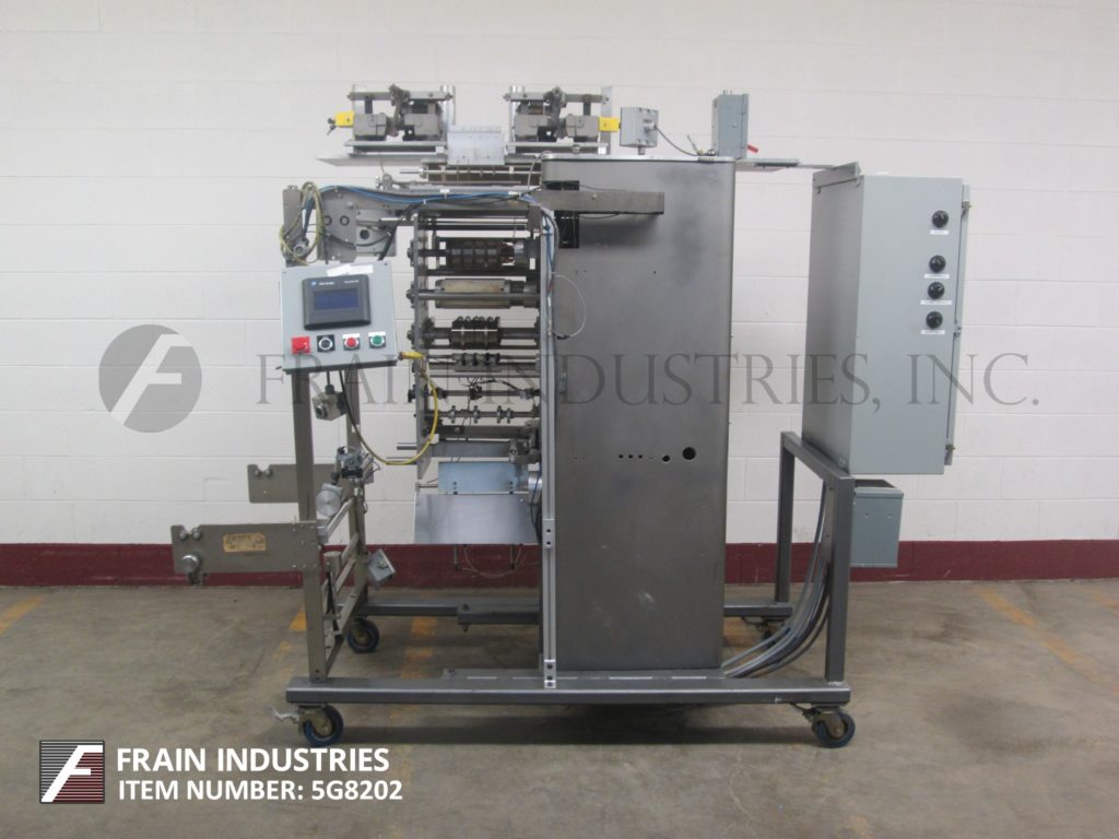 包装T-T型,1-向上,垂直,成型,填充,4边密封,条状包装机额定从6到60袋每分钟-取决于材料,应用,包装大小和每包件。包装尺寸范围:1"至6"长度;宽度为1"至4",可适当更换零件。配备(6)振动碗产品饲料料斗,双膜辊架与__”宽膜辊,膜对准,穿孔和低膜传感器。旋转分切刀片,与伺服驱动的刀,目前设置双单腔横向和侧操作器和封口机。控制面板有A/B CPU与面板视图和触摸板控制和振动馈线控制与速度刻度盘,统计光棒和e-stop。安装在重型基础框架。
