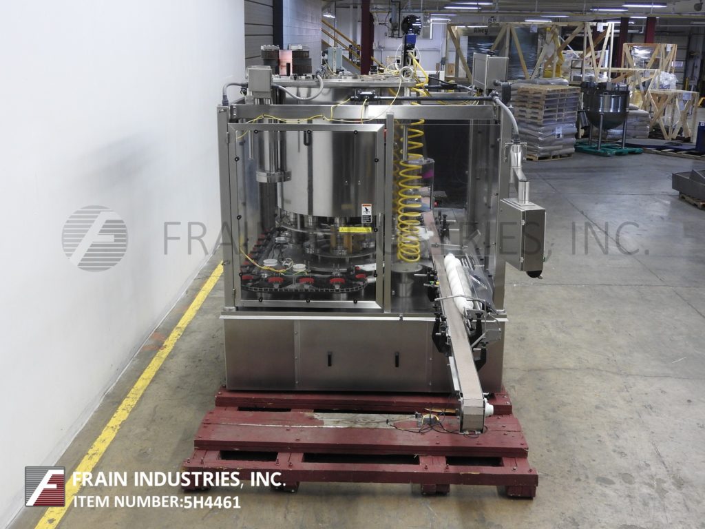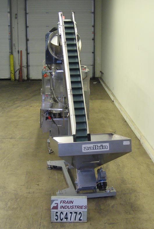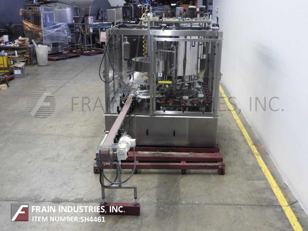 Zalkin / Fowler型CASF,自动,不锈钢,12头旋转卡盘盖机每分钟的容器数量-取决于材料和应用。瓶盖和容器尺寸:根据应用需要适当更换部件。配备140"长x 3-1/2"宽塑料联锁集装箱带式输送机,有48"长蜗杆螺旋星轮集装箱分度与u型集装箱转移输送机到帽槽,目前设置为100mm帽,无集装箱/无帽,有(12)无摩擦,磁离合器卡盘盖头快速释放钳口设置在11"中心星形轮卸料84"长x 3-1/2"宽卸料输送机。控制面板有强臂摆动臂控制器和A/B面板视图控制器与控制电源开/关,周期启动,停止,复位帽启动器,jog和e-stop按钮控制。安装在不锈钢底座上,配有安全防护门和统计灯条。