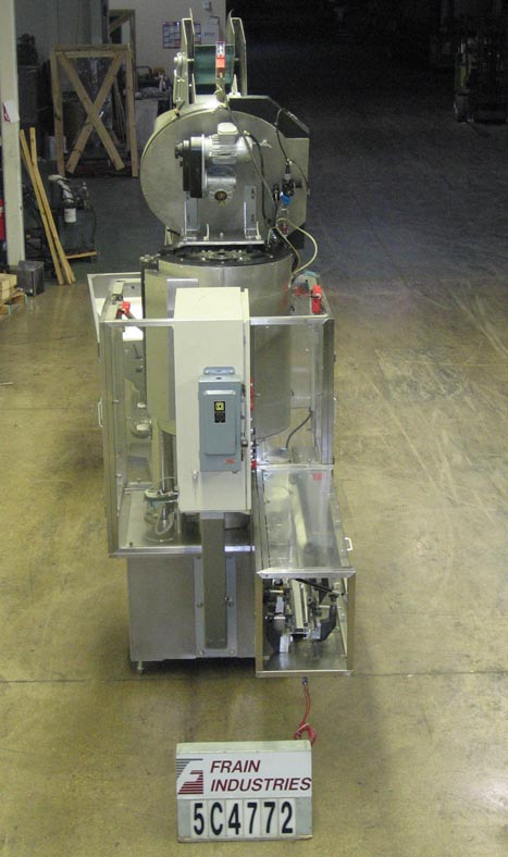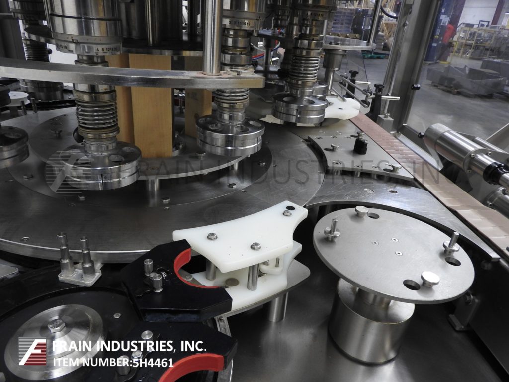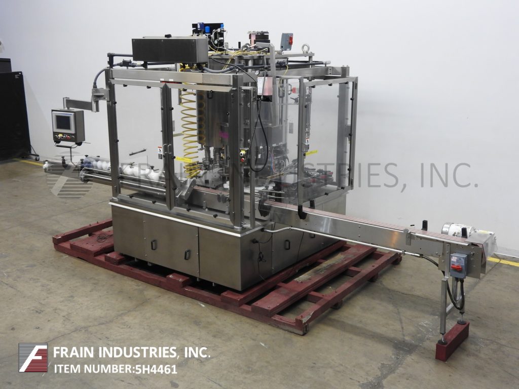 Fowler / Zalkin型CA4PM,自动,4头不锈钢,小占地面积的旋盖机额定从40到200个集装箱每分钟-取决于材料和应用。瓶盖尺寸范围:15mm至43mm,容器尺寸达:3"直径;最高可达5英寸的高度与适当的更换部件。配备76“长x 3-1/4”宽缩醛树脂塑料带式输送机与蜗杆螺钉星形轮在饲料和放电22”直径不锈钢碗馈线,帽子斜槽,盖按钮和帽头,不锈钢斜顶式给料机,(4)无摩擦,磁性离合器盖,与失踪的帽和容器检测。远程控制面板采用A/B PLC控制,并配有控制器、安全光幕、统计灯,安装在全不锈钢底座上。能够运行塑料和玻璃容器与适当的更换部件。